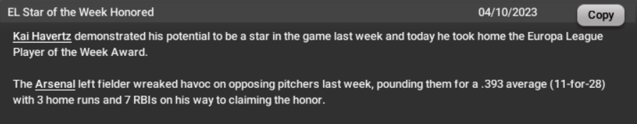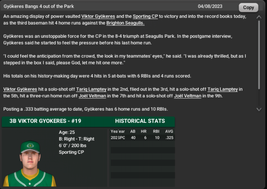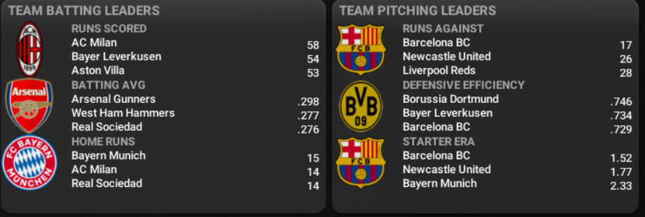 LEADERBOARDS ![]() PLAYER OF THE WEEK ![]() ![]() STANDINGS ![]() ![]() FINAL THOUGHTS Keep an eye on Atletico Madrid. They start 6-3 and have one of the best run differentials despite playing Real Madrid, Liverpool, and Tottenham. Inter Milan also looks like a contender. They start 7-2 and have a strong pitching staff with three starting pitchers rated 65 overall; Allesandro Bastoni, Emil Audero, and Yann Aurel. Chelsea have a young squad with a lot of promise but their inexperience is showing so far as they stumble out of the gates. Meanwhile Man City has no apparent weaknesses and start 5-1 before losing a series to Real Madrid. It will be interesting to see if anyone can keep up with them. Overall an exciting start to the season! Last edited by Helton17; 11-14-2023 at 12:32 AM. |