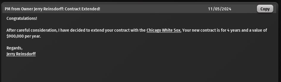 Although we faded at the end, we had a good season overall. We went 1-2 in the playoffs. Many things to look forward to in 2025, although some changes need to be made. I am looking at bringing in a top prospect 1b, a veteran DH, 2 relief pitchers, 1 from each side and a few top prospects. No upcoming FA's will return in 2025.