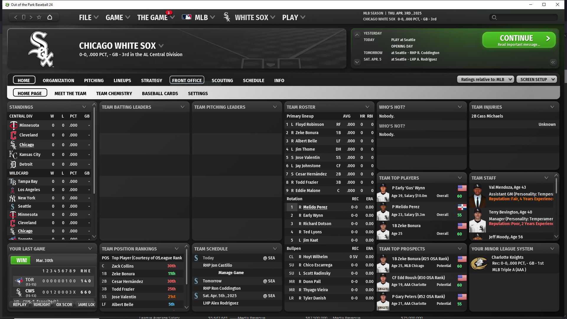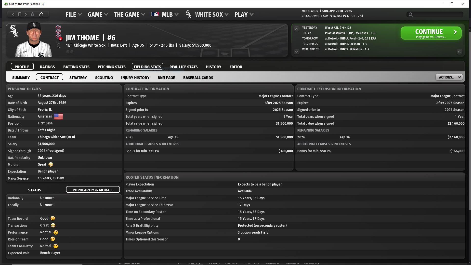 I have taken control of certain aspects of the lineup and pen. I told MGR Terry Bevington to hit Bonura 2nd, Belle 3rd & Thome 4th. Also for Wilhelm to stay as the CL. Also he wanted to bench Frazier vs RHP. We do have a good amount of $$ available for extensions. Several of the players in waiting, are more for 2027 vs 2026, so I might look at re-signing several players for 1-2 yrs. I might fail at all of JR's goals this year.