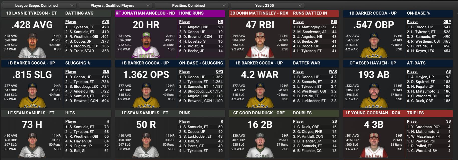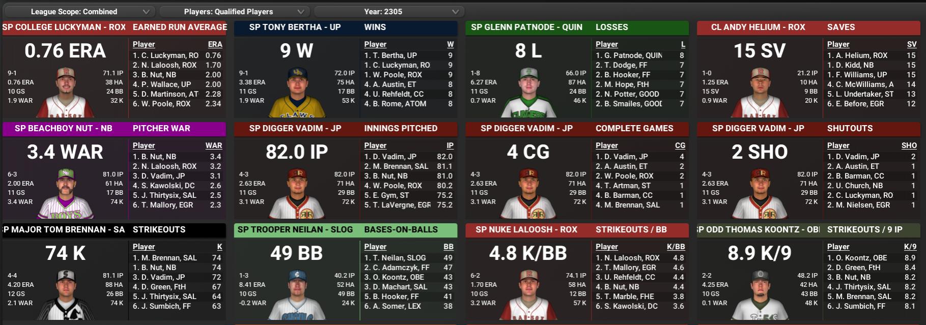 BNN Weekly Report This Week in the CBO, BMU, GBRL, Youth Leagues by Nat Wright-Kawolski 1 June 2305 The June 1 Super Post CBO Players of the Month NCA Hitter - Sean Samuels battered North Charles Association pitchers all May and wound up taking home the Batter of the Month Award. "I've been around Commonwealth Baseball Organization long enough to know you really have to work hard day in and day out to be able to put up this kind of consistency," the 27-year-old Samuels told reporters. "I put in a lot of work, even on the days I might not take the field, and it's always nice when everything comes together for me like it did this last month." In 21 games, Samuels hit .488 with 7 home runs, 19 RBIs and scored 27 runs. In 43 games this season Samuels has compiled a .410 batting average with 73 hits and 11 home runs. He has also scored 50 times and knocked in 33 runs. NCA Pitcher - Last month's cream of the crop on the mound was Beachboy Nut of the Nordhagen Beach Party Boys. He captured the North Charles Association Pitcher of the Month award for his outstanding performance in May. Nut started 5 games, threw 39 innings, yielded 22 hits and logged a 4-0 record. He put down 30 batters on strikes, walked 8 and compiled a 0.46 ERA. Opposing teams batted .164 against him. This year Nut has fanned 74 in 81 innings and collected a 6-3 record with a 2.00 ERA. NCA Rookie - Sunshine Tidings's Sun Crockett collected 19 hits to snare the North Charles Association Rookie of the Month for May. He batted .306 with 7 home runs, 17 RBIs and 18 runs scored. The 21-year-old is barely old enough to shave, but he could definitely contend for Rookie of the Year if he keeps up this pace. He was originally drafted by Fort Hagen in the 2nd round of the 2301 Rookie Draft. Currently Crockett has 10 home runs and a .258 batting average. SCA Hitter - Barker Cocoa got another reason to celebrate today as he followed up a great month of May at the plate by winning the South Charles Association Batter of the Month Award. During the month the University Point first baseman hit .347 with 11 home runs, 20 RBIs and 18 runs scored. Presently Cocoa is batting .377 and has collected 19 home runs, 41 RBIs, .547 OBP and scored 49 runs. SCA Pitcher - When College Luckyman takes the hill, he usually takes command of the game -- at least that's the way it was in May. The outcome was usually a Roxbury victory. His fine 5-0 performance earned him the South Charles Association Pitcher of the Month trophy. The talented Rad Sox hurler made 5 starts, worked 35.1 innings, permitted 21 base hits, and struck out 17 while putting up a 0.76 ERA. To date this season Luckyman has compiled a 9-1 record with a 0.76 ERA in 10 starts. SCA Rookie - Victor Desire is still a bit shy, but then, who could blame the newest South Charles Association Rookie of the Month honoree? He hasn't been around the league long enough to fully know the ropes yet, despite the fact that the 9th-overall pick in the 2304 Rookie Draft is putting up veteran-like numbers. In May the Goodneighbor hitter tagged opposing pitching for a .253 average with 19 hits, 4 home runs and 9 RBIs. Desire is hitting .271 in 2305 with 20 RBIs and 5 home runs. CBO Award Races - See bottom for full CBO leader boards Hitters Leaders NCA - 1B Lannie Tykeson, Easy Town - .428 (1), 14 HR (4), 41 RBI (T-2), .528 OBP (1), .736 SLG (1), 1.264 OPS (1), 3.4 WAR (2), 68 H (2), 40 R (T-3), 117 TB (3), 34 BB (T-5), .308 ISO (5), 218 OPS+ (1), 2.39 WPA (4), .531 wOBA (1) Other Contenders: RF Jonathan Angelou, Nordhagen Beach (.331/20/43), LF Sean Samuels, Easy Town (.410/11/33) SCA - 1B Barker Cocoa, University Point - .377 (2), 19 HR (1), 41 RBI (T-3), .547 OBP (1), .815 SLG (1), 1.362 OPS (1), 4.2 WAR (1), 49 R (1), 119 TB (1), 53 BB (1), 28 XBH (2), .438 ISO (1), 250 OPS+ (1), 3.67 WPA (1), .564 wOBA (1) Other Contenders: CF Aesed Hayjen, University Point (.332/14/38), C Racky Westheim, Oberland (.401/5/31) Pitchers Leaders NCA - SP Beachboy Nut, Nordhagen Beach - 2.00 ERA (1), 6 W (T-4), 3.4 WAR (1), 81.0 IP (2), 74 K (T-1), 4.4 K/BB (T-1), 8.2 K/9 (2), 1.9 BB/9 (2), 0.96 WHIP (1), 2.35 FIP (1), 222 ERA+ (1), 3.5 rWAR (1), .210 Opp Avg (2), 9 QS (T-1) Other Contenders: SP Austen Austin, Easy Town (8-2, 2.96), SP Mike Rubric, Sunshine Tidings (7-3, 2.80), SP Lannie Tykeson, Easy Town (6-0, 3.50) SCA - SP College Luckyman, Roxbury - 0.76 ERA (1), 9 W (T-1), 1 CG (T-3), 1 SHO (T-2), 0.87 WHIP (1), 589 ERA+ (1), 5.0 rWAR (1), .172 BABIP (1), .157 Opp Avg (1), .900 WINP (T-3) Other Contenders: SP Digger Vadim, Jamaica Plain (4-3, 2.63); SP Nuke Laloosh, Roxbury (6-2, 1.70) BMU Analysis League leaders in the Commonwealth Association are the Everett Mutant Hounds (Vault 81) at 21-8 and the Union Hope Lifegivers (Oberland) at 19-10. League leaders in the Massachusetts Association are the Trinity Plaza Snipers (Egret) and Boston Common Lead Bellies (The Slog) at 19-10 in the Downtown Boston League and the Eastlake Aquaboys (County Crossing) at 19-10 in the Glowing Sea League. BMU Players of the Month CA Hitter - Fastballs, curveballs, changeups, sliders. There wasn't really anything David Stahl of the College Square couldn't hit during the month of May. He has been named the Commonwealth Association Batter of the Month on the strength of a .319 batting average, with 13 home runs, 20 RBIs, 18 runs scored and a .397 on-base percentage. MA Hitter - Warwick Mirelurks fans may just have witnessed a star player blossoming before their eyes in May. Ken Debate put up a remarkable month at the age of 20 and has been named the Massachusetts Association Batter of the Month. For the month, Debate hit .465 with 15 home runs, 26 RBIs and 22 runs scored. CA Pitcher - The top-rated pitcher this past month in the Commonwealth Association was Bobby Lidtke of the Union Hope Lifegivers. He really dominated league hitters, finishing May with a 4-1 won-lost mark and a 2.33 ERA. The Lifegivers ace made 5 starts and surrendered 30 hits i
