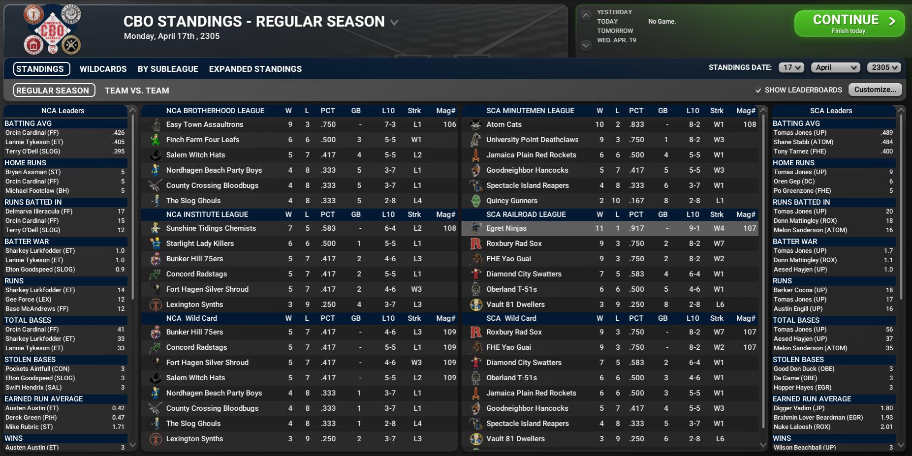 BNN Weekly Report This Week in the CBO, BMU, and GBRL by Nat Wright-Kawolski 17 April 2305 Analysis Interassociation play is now complete for the 2305 season, and there are some huge surprises across the league in the first 12 games of the season. That means we are more than 10% through the 2305 season. There is a lot of time for things to get back in order. For now, the South Charles Association won the interassociation championship going 81- 63. First, let's look at the Top 5 of the Power Rankings and then dive into the league races heading into association play for the final 22 weeks. The biggest surprise of the 2305 season has been the two-week dominance of the Railroad League's Egret Ninjas, our #1 team in the first Power Rankings. The Ninjas went a staggering 11-1 in the first two weeks, sweeping through the Institute League and losing only to Easy Town (#6) in the Brotherhood League matchups. Egret has won thanks to dominant pitching in the first two weeks, allowing just 28 runs in 12 games, best in the CBO. Their Starting Pitching (2.60) and Bullpen (1.12) are best, with the best FIP of 3.42. While the offense has a lot of work to do, the pitching has been amazing for a team looking to make its first appearance in the CBO playoffs. Their one time to be in the playoffs came in the 2296 season when the leagues were separated. The Ninjas lost that one series to the then Abernathy Adamantium (now Bunker Hill 75ers). At #2 is the Atom Cats, who also showed dominance in their 10-2 start. The Cats of the Minutemen League swept the Brotherhood League and then went 4-2 against the IL, dropping two games to Sunshine Tidings (#8) and Fort Hagen (#14). Two-time defending champions, the Roxbury Rad Sox, are #3 after going 9-3. The Rad Sox struggled in the first week, going 3-3 against the IL with losses to the Silver Shroud to open the season and then Lexington (#22) and the Chemists. The Sox then swept the BL, including a big 10-0 win over Finch Farm (#10). University Point is #4 at 9-3. The Deathclaws went 4-2 against the BL with losses to the Assaultrons and Four Leafs, and then they went 5-1 against the IL with their only loss being an 11-inning affair against Starlight (#12). As expected, the Claws are the top offensive team, scoring 101 runs in their first 12 and leading in four other offensive categories. FHE rounds out the Top 5 with a complete sweep by the SCA. The Yao Guai went 4-2 against the IL with losses to the Lady Killers and Sunshine Tidings. They then went 5-1 against the BL to go 9-3 in their first 12. The one loss came at the hands of The Slog (#21) in 10 innings. Brotherhood League We already knew that Easy Town was supposed to contend for the playoffs. What we did not expect was that they would be 10% through the 2305 season with a 5-game edge on both County Crossing (#19) and Nordhagen Beach (#20), each at 4-8. Really, we do not expect the Bloodbugs and Party Boys to stay down once NCA games start tomorrow, but we could see the Assaultrons turning that early edge into their first BL crown. County Crossing is suffering partially from the early slump by RF Babs Rooth (.174/2/4). The team is batting .245 (11th in NCA) and 12th in Bullpen ERA (7.29), made in part by the late-inning struggles of RP Terry Stebbins (0-3, 25.20) and CL Jesse Bibeault (2 SV, 4.91). While the Starters ERA (3.93) is 4th, ace SP Gavin Eviritts (0-1, 6.17) has not helped. Nordhagen Beach is also struggling on offense with only one player currently batting over .300 in 2B Jumper Hayes (.327/2/4). The Party Boys have generated most of their 50 runs on home runs (2nd) with 20. The starters on the mound have not been their usual selves, currently 5th in Starters ERA (4.02), including an 0-2, 4.29 start by ace Beachboy Nut. Institute League This was considered the least-talented league in the CBO in 2304, and that continues in 2305 with their only team over .500 being 7-5 Sunshine Tidings. The Chemists won the league in 2304, and they have what appears to be the best talent in a league where the 2nd place team may not be deserving of a playoff spot. Fort Hagen (5-7) was not picked to make the playoffs, but them missing would still be a surprise. The Silver Shroud seem to be in the middle of the pack, currently tied for 7th in runs scored (52) and tied for 6th in runs allowed (61). Ace Derek Green (2-0, 0.47) has been his usually dominant self, but the rest of the starting pitchers (7th with a 4.75 ERA) have struggled. Concord (5-7) was the pick to finish 2nd in 2305 by PAM, but they have not yet shown they can separate themselves from any of the other teams. The Radstags have not shown they can get their offense started outside of their stars in LF Dan Erb (.298/3/6) and 1B Dusty Brownell (.319/2/7). Minutemen League This is a league with the most obvious differences in talent with the big three of Atom-Jamaica Plain-University Point usually dominating the bottom three of Goodneighbor-Quincy-Spectacle Island. There is not reason to believe that will not also happen in 2305, with the standings indicating as such in the first two weeks. The Rad Rockets have not been the dominant team they usually are, but that is because their offense has been the absolute worst all around in the SCA, including being currently 12th in runs scored with 34. No player is currently hitting over .300 and three players--LF Carney Cornseed (.189/0/4), RF Damani Beebe (.167/4/8), and C Ayag Mour (.158/0/0)--batting below .200. SP Digger Vadim (2-0, 1.80) has been the star player, helping the Rockets to win almost every fourth game. Atom and University Point are both in the Top 5 for a reason, and they should stay in the playoff hunt throughout the season. Despite Goodneighbor's 5-7 start, it is safe to assume the Hancocks will be out of the running by midseason. Railroad League This league was the most dominant with four teams above .500 and one team at .500. Only Vault 81, dealing with injuries and suspensions, had a tough two-we