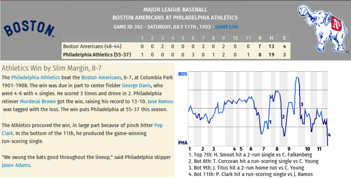 Starter Cy Falkenberg did not factor into the decision after allowing 7 earned runs on 13 hits, 4 walks, and 1 hit batsman in 8 2/3 innings of work; Game Score 28. Red Donahue pitched 1 1/3 innings of scoreless ball before turning it over to Mordecai Brown (13-10) who picked up the win for his 1 inning of relief work. On the other side of the ledger was Cy Young who likewise did not factor into the decision due to his surrendering 7 runs (5 earned) on 15 hits and 2 walks; Game Score 36. Closer Jose Ramos (1-2) was tagged with the loss after allowing 1 earned run on 4 hits and 1 walk. With neither pitching staff having command of their pitches today, opposing batters were locked in. For Philadelphia, George Davis (4 for 6, 3 Runs, 2 Doubles), John Titus (2 for 5, Homerun Run, 2 RBIs), Tom McCreery (2 for 5, 2 Doubles, Run, Walk), and Honus Wager (3 for 6, Double, 2 Runs) each had a fine day at the plate. For Boston, Jiggs Donahue (4 for 6, Double, Run, 3 RBIs), Chick Stahl (2 for 6, 3 Runs, Stolen Base), and Harry Smoot (1 for 1, 2 RBIs) played well in the loss. Player of the Game: George Davis