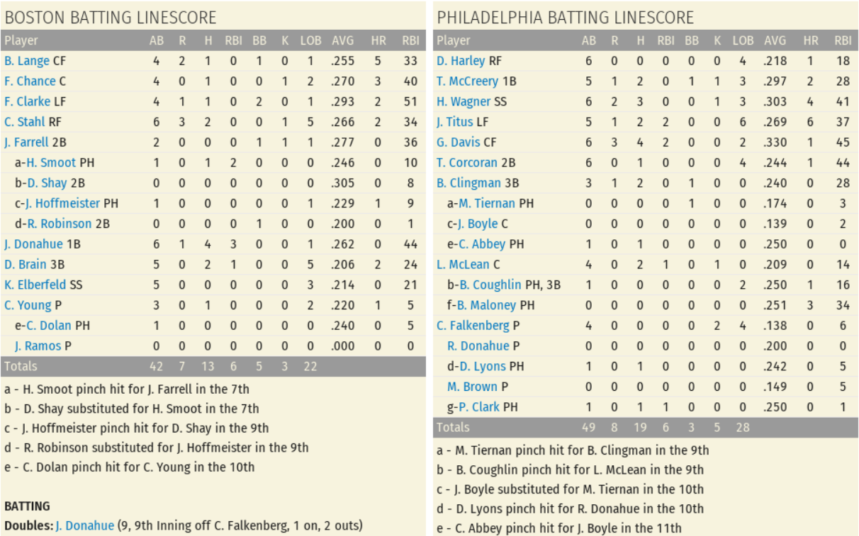 Starter Cy Falkenberg did not factor into the decision after allowing 7 earned runs on 13 hits, 4 walks, and 1 hit batsman in 8 2/3 innings of work; Game Score 28. Red Donahue pitched 1 1/3 innings of scoreless ball before turning it over to Mordecai Brown (13-10) who picked up the win for his 1 inning of relief work. On the other side of the ledger was Cy Young who likewise did not factor into the decision due to his surrendering 7 runs (5 earned) on 15 hits and 2 walks; Game Score 36. Closer Jose Ramos (1-2) was tagged with the loss after allowing 1 earned run on 4 hits and 1 walk. With neither pitching staff having command of their pitches today, opposing batters were locked in. For Philadelphia, George Davis (4 for 6, 3 Runs, 2 Doubles), John Titus (2 for 5, Homerun Run, 2 RBIs), Tom McCreery (2 for 5, 2 Doubles, Run, Walk), and Honus Wager (3 for 6, Double, 2 Runs) each had a fine day at the plate. For Boston, Jiggs Donahue (4 for 6, Double, Run, 3 RBIs), Chick Stahl (2 for 6, 3 Runs, Stolen Base), and Harry Smoot (1 for 1, 2 RBIs) played well in the loss. Player of the Game: George Davis