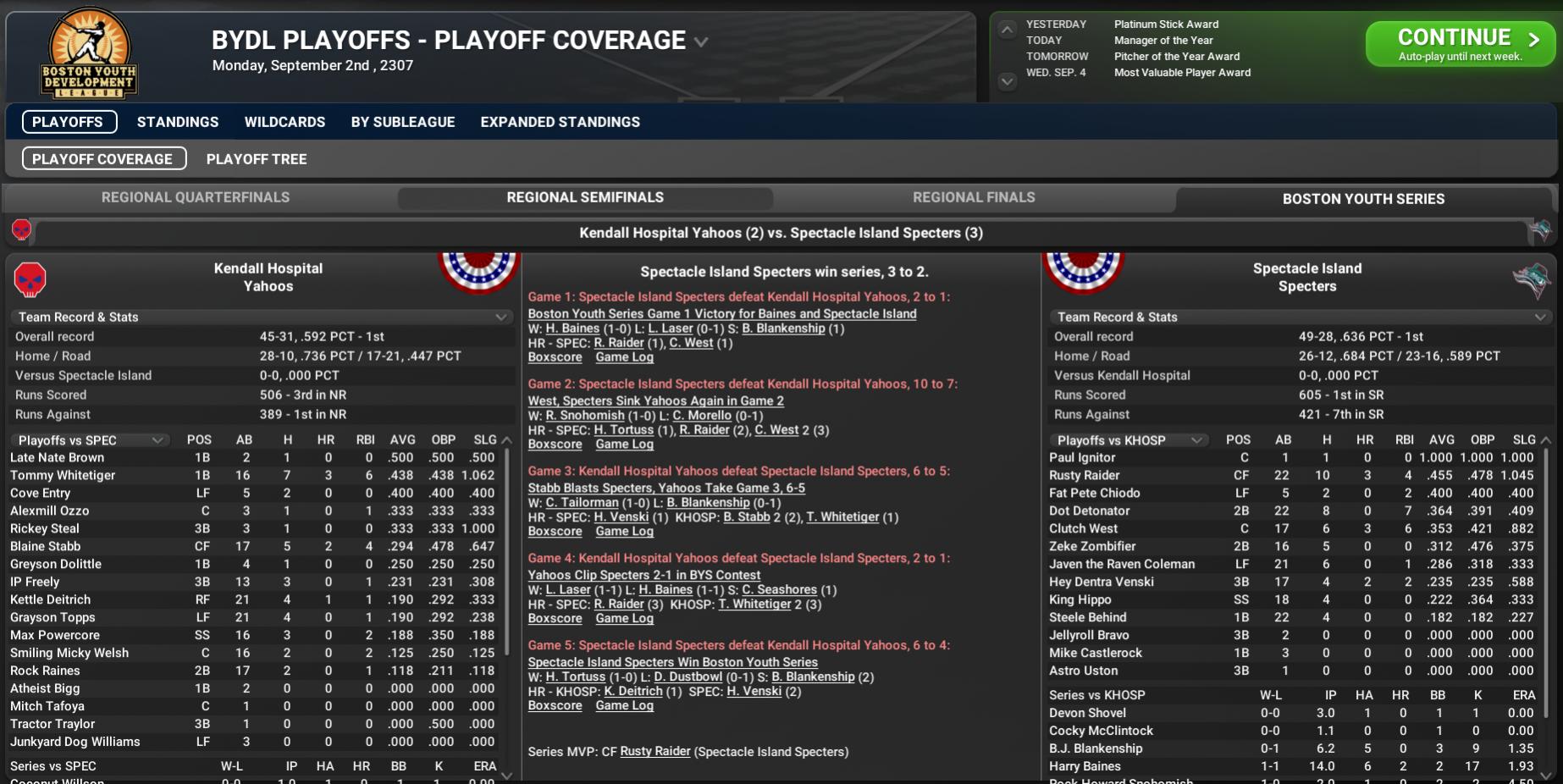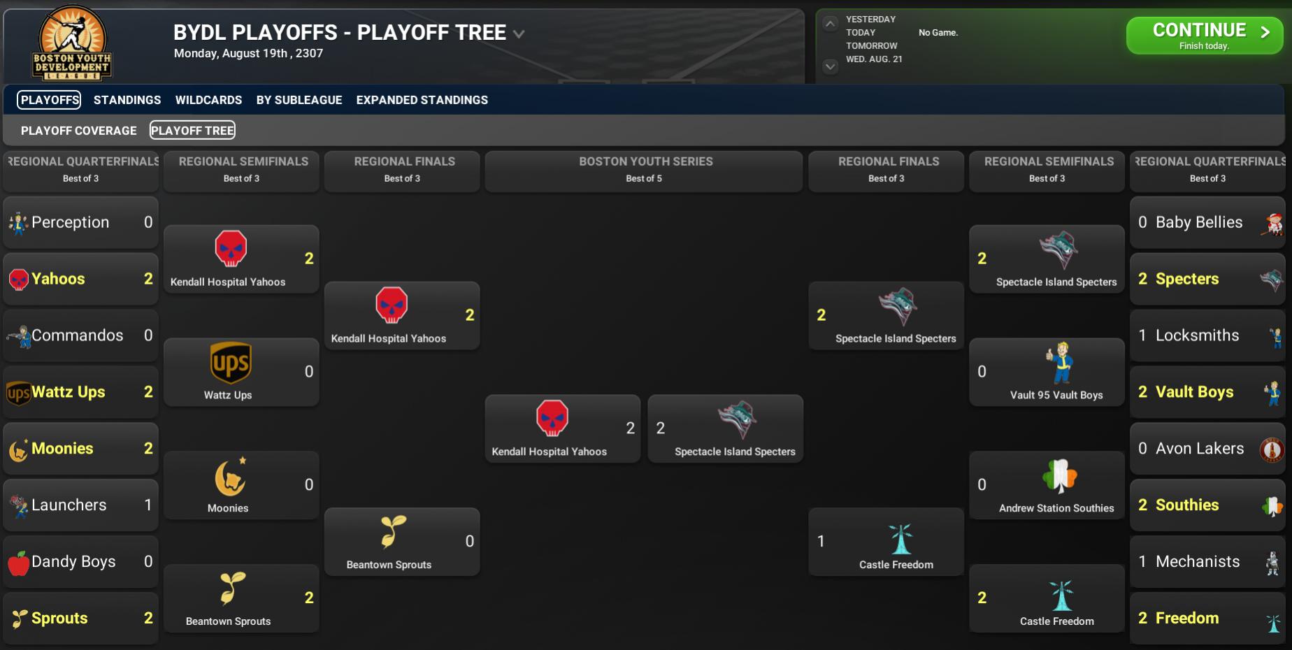 The Spectacle Island Reapers will play against the Roxbury Rad Sox in the next round. Roxbury had a bye in the Play-in Series. The Association Semifinal schedule will be announced after the Play-in Series finishes.