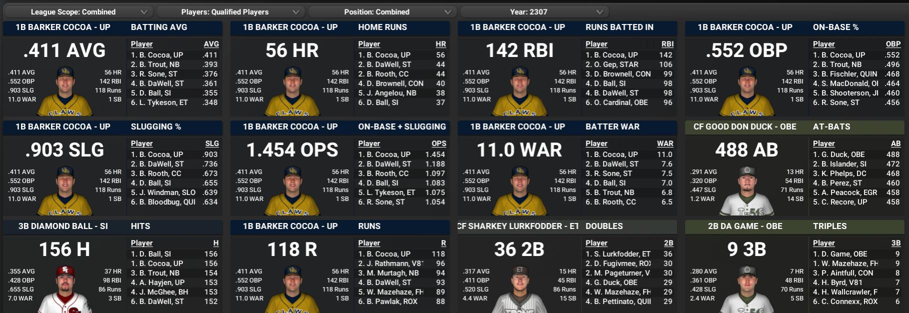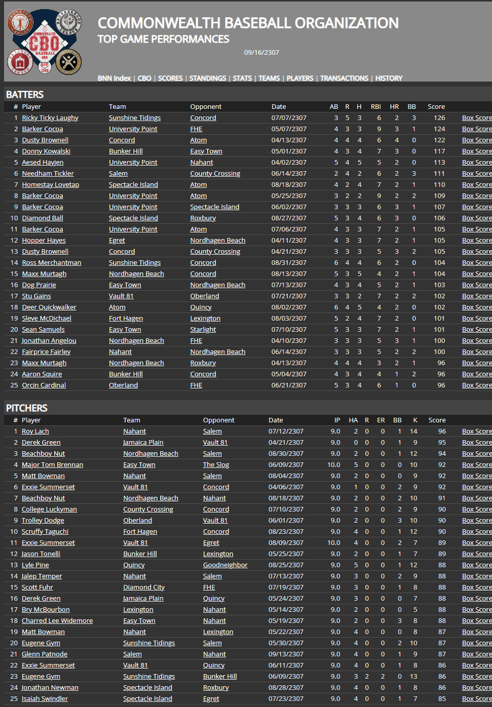 Two weeks ago, Goodneighbor was the worst team in the SCA but not the CBO. Now they are back in contention for the #1 draft pick yet again. It would mark the 3rd-straight season of picking the top player. The last two--LF Handel Alone (,276/6/29) and CF Missile Crews (.342/27/78)--have had outstanding rookie seasons, showing the future is bright for the Hancocks. We will preview the top expected picks later in this update.
