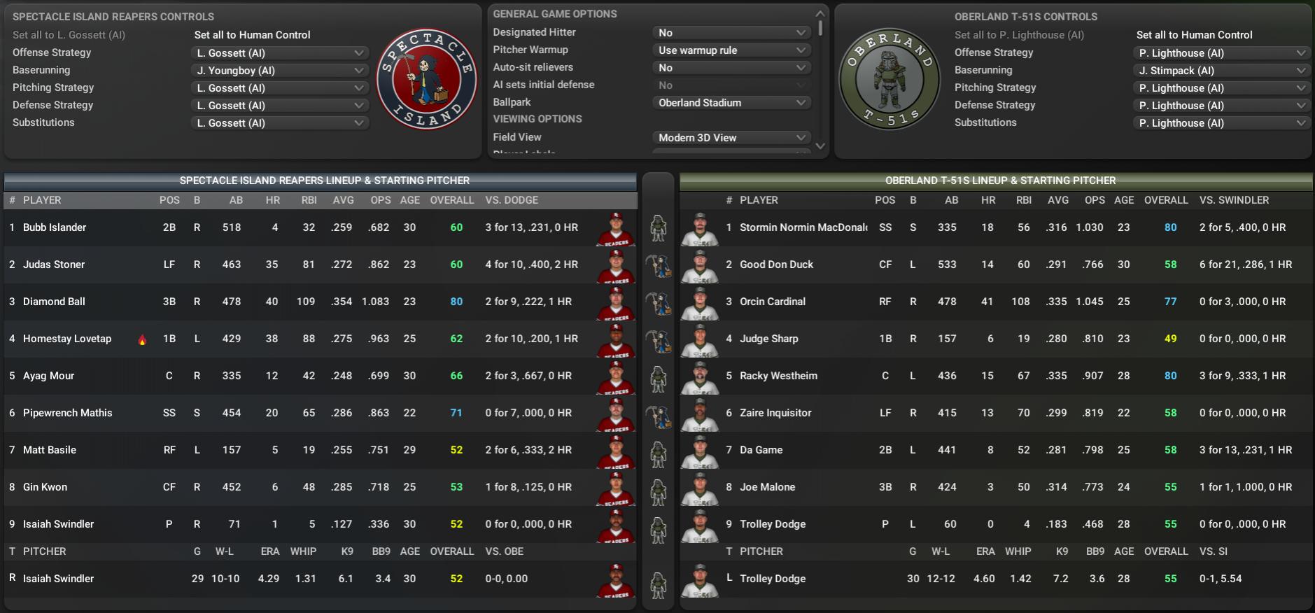 The Spectacle Island Reapers powered past the hometown Oberland T-51s, 4-2, in the opener of the Play-in Series at Oberland Stadium today. Spectacle Island starting pitcher Corey Ware threw 8.0 innings of 7-hit ball, to lead the charge. The Reapers now lead the series 1-0.