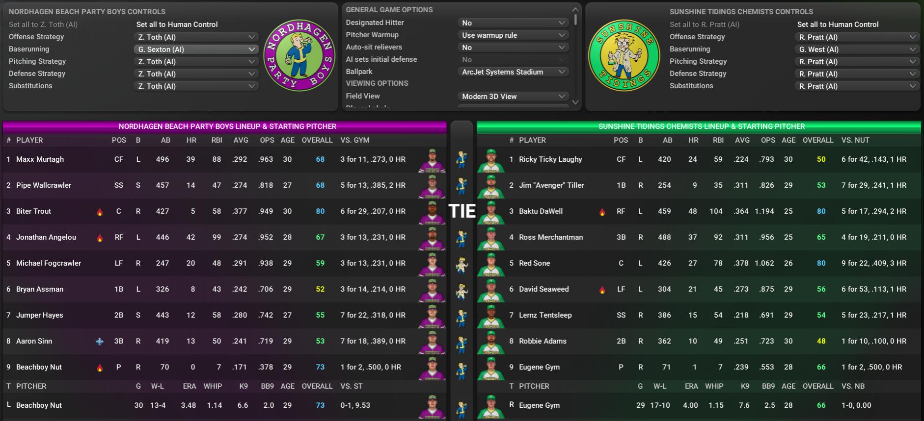 The pitching was quite a bit better, finishing 1st in runs allowed (499) and Bullpen ERA (3.44) and 3rd in Starters ERA (4.18). All three starters for the playoffs--Nuke Laloosh (13-2, 2.99), Urm Rehfeldt (12-5, 3.93), and Chet Arthur (15-9, 4.09)--are capable of shutting down the opposing offense. CL Andy Helium (37 SV, 2.69) was his usual self, with lots of help from Evan Before (3-0, 2.95) and Pray Tell (3-0, 2.28).