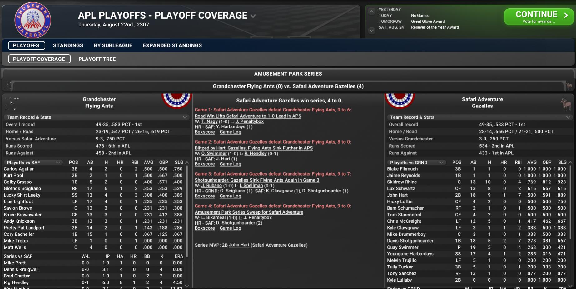 Easy Town finally broke through after teasing earning their first Brotherhood League crown in team history, though they tried to lose the league crown at the end. Now, they are in their sixth playoff appearance and fourth straight. This is just the second time the Assaultrons and County Crossing will meet in the playoffs. In their only other meeting, the roles reversed with the Bloodbugs as the #1 seed and the Trons as #5. In that series, the Bugs got the sweep, 3-0, in 2304.