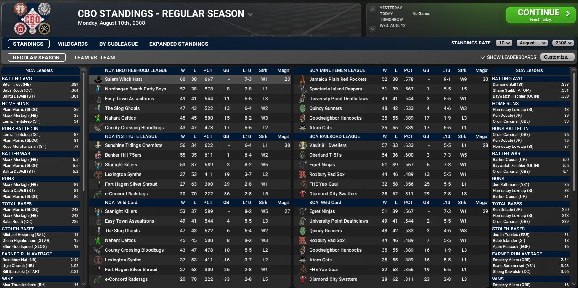 by Nat Wright-Kawolski 7 September 2308 CBO Analysis With 110 games played and 10 more to go, ZERO teams have clinched a playoff berth. There are some unofficial eliminations, but officially, seven teams know for sure they will not be playing in the 2308 postseason. In the Brotherhood League, all six teams are officially alive. However, since Nordhagen Beach and Easy Town face off next weekend, none of Nahant, The Slog, and County Crossing can clinch a playoff spot. If the playoffs were to start today, these would be the seedings: NCA 1. Salem 2. Sunshine Tidings 3. Bunker Hill 4. Easy Town 5. Starlight Salem has a Magic # of 3 to clinch the BL. The Witch Hats also lead Sunshine Tidings by a game for the top seed in the NCA. The Chemists seem to have the easier road down the stretch to clinch the top seed with non-league games at Easy Town and versus County Crossing, with league games hosting Lexington and visiting Starlight. Meanwhile, the Hats will play the IL's Killers on the road and Bunker Hill at home, as well as face The Slog six times to finish the year. In the wildcard race, Easy Town jumped into a BL tie with Nordhagen Beach and has the tiebreaker due to a 6-3 edge in the season series. Bunker Hill and Starlight appear that they will be in some order the #3 and #5 seeds, with the 75ers leading by just a game after getting swept by the Killers this past weekend. SCA 1. Oberland 2. Spectacle Island 3. Vault 81 4. Jamaica Plain 5. Egret The SCA decided to shuffle around its seedings heading into the final two weeks with some great matchups in the final 10 games. In the Minutemen League, Spectacle Island is back in first, going 6-4 in their last 10, while Jamaica Plain went just 4-6. The 3rd-place team, University Point, fell behind by going 3-7, putting them in serious danger of missing the playoffs. The Reapers and Red Rockets meet in Spectacle Island in the last series of the regular season. In the Railroad League, Oberland got hot, going 9-1 in their last 10 to take over control of both the league and the top record in the SCA. Meanwhile, Vault 81 was only 4-6, leading Egret with a five-game winning streak to stand just five back. The Ninjas face both the T-51s and Dwellers in their final two RL series, meaning that Egret largely controls their own destiny to be anywhere from the #1 overall seed to missing the playoffs altogether. In the wildcard race, the Ninjas lead by 5 games over the Deathclaws. Both Roxbury and Quincy are technically eliminated, each trailing by 10 games with 10 to play. Here are the current team power rankings for Commonwealth Baseball Organization: Teams (Total Points, Tendency): 1) Oberland T-51s (121.9, +) - As mentioned, the T-51s went 9-1 in their last 10 to take over control of the SCA. Oberland swept University Point, Vault 81, and Atom before winning two of three at Roxbury. 2) Sunshine Tidings Chemists (117.5, -) - The Chemists went 6-4 with a split with Salem, two of three over Bunker Hill, a split with Nordhagen Beach, and two of three over Concord. 3) Egret Ninjas (113.7, ++) - The Ninjas were 7-3 in their past 10 with a split with Quincy, a series loss at Roxbury, a sweep of the Gunners, and then a sweep of Diamond City. 4) Salem Witch Hats (113.2, -) - The Hats have struggled as of late, going 4-6 with a split at the Chemists, a series loss to Nahant, a split with the Killers, and then another series loss to County Crossing. 5) Starlight Killers (113.0, +) - The Killers went 6-4 in their last 10, but started on a three-game losing streak. Starlight got swept by the Assaultrons, won the series at Fort Hagen, split with the Witch Hats, and then swept the 75ers. 6) Vault 81 Dwellers (106.6, ++) 7) Easy Town Assaultrons (106.1, +) 8) Spectacle Island Reapers (105.7, --) 9) Bunker Hill 75ers (104.6, --) 10) Jamaica Plain Red Rockets (100.5, o) 11) Nordhagen Beach Party Boys (100.1, --) 12) County Crossing Bloodbugs (91.7, ++) 13) University Point Deathclaws (90.5, -) 14) Roxbury Rad Sox (87.4, o) 15) The Slog Ghouls (86.7, +) 16) Nahant Celtics (84.4, --) 17) Quincy Gunners (83.4, o) 18) Goodneighbor Hancocks (72.7, +) 19) Lexington Synths (71.4, ++) 20) Atom Cats (71.0, -) 21) FHE Yao Guai (62.8, o) 22) Diamond City Swatters (59.2, -) 23) Fort Hagen Silver Shroud (57.9, o) 24) Concord Radstags (39.9, o) CBO Standings CBO Players of the Week August 31 - Dusty Brownell is respected by most Sunshine Tidings Chemists fans for his no-frills style of play. The 29-year-old first baseman went about his business with vigor last week to grab the North Charles Association Player of the Week honors. He compiled a .400 average (8-for-20) with 4 home runs, 5 RBIs and 7 runs scored. This year Brownell is batting .283 with 23 home runs and 55 RBIs. Curt Carpenter demonstrated his potential to be a star in the game last week and today he took home the South Charles Association Player of the Week Award. The Quincy first baseman wreaked havoc on opposing pitchers last week, pounding them for a .571 average (12-for-21) with 2 home runs and 6 RBIs on his way to claiming the honor. During the current season Carpenter is batting at a .277 clip with 18 home runs and 54 RBIs. He has played in 99 games and scored 65 times. September 7 - The Player of the Week has been announced by the North Charles Association. The honor went to Ross Merchantman, third baseman of the Sunshine Tidings Chemists. He burned up the league with a .609 average to win the award. Merchantman went 14-for-23 for the week, totaled 5 home runs with 13 RBIs and scored 7 times. This season Merchantman is hitting at a .285 pace with 40 home runs, 103 RBIs and has scored 85 times. Wookie Chewbacca demonstrated his potential to be a star in the game last week and today he took home the South Charles Association Player of the Week Award. The FHE second baseman wreaked havoc on opposing pitchers last week, pounding them for a .571 average (12-for-21) with 2 home runs and 5 RBIs on his way to claiming the ho