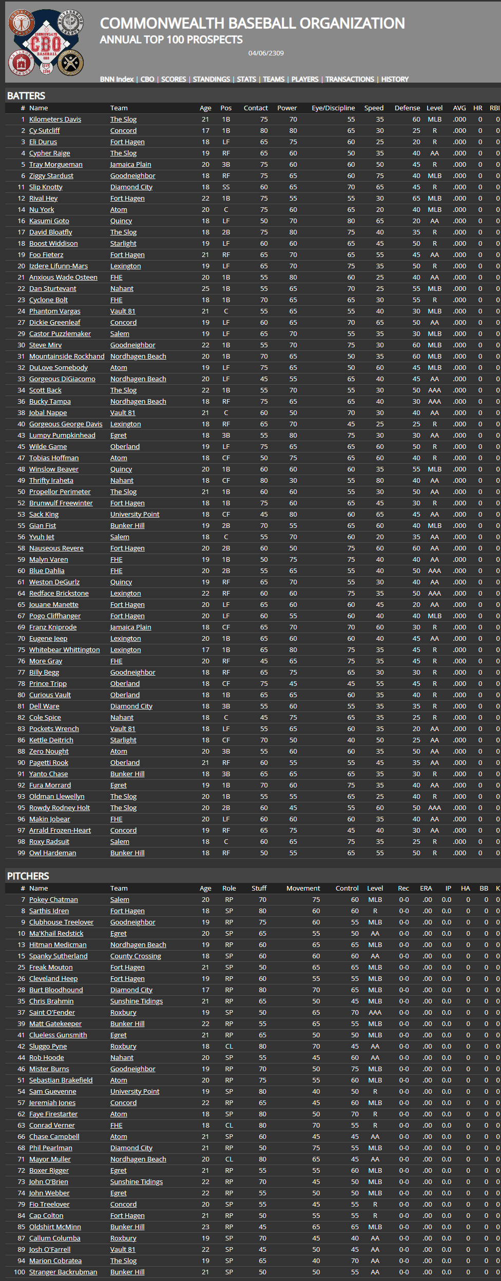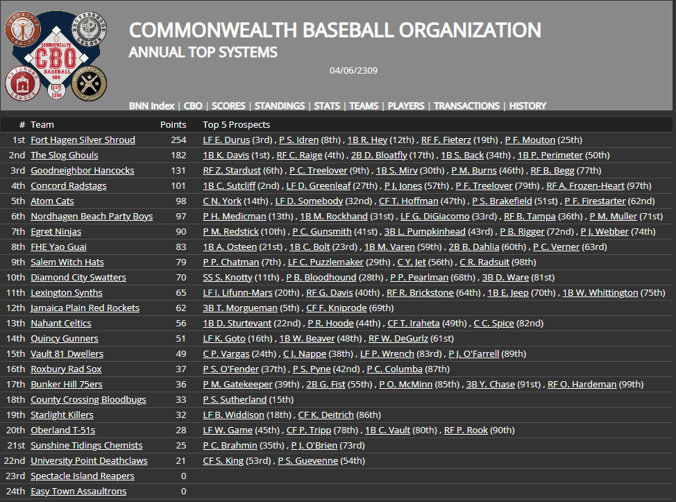 BNN Report News from the CBO, Minors, BCAC, and CYL by Nat Wright-Kawolski 6 April 2309 CBO Begins The 2309 CBO season begins today with 12 scheduled interassociation games. The Brotherhood League visits the Minutemen League, while the Institute League visits the Railroad League. Top Players, Prospects, and Systems CBO Transactions Tuesday, April 6th , 2309 County Crossing Bloodbugs: Placed RP Drama Miller on the restricted list. Bunker Hill 75ers: Released RP Mike Germanfrench. Jamaica Plain Red Rockets: Released 1B Pass Pewitt. Goodneighbor Hancocks: Placed RP Storn Cragstrider on the 7-day injured list, retroactive to 04/03/2309. County Crossing Bloodbugs: Released RP Ponds Scum. Quincy Gunners: Released 3B Conan O'Lyin. Concord Radstags: Released SS Devon Charlesbanker. Quincy Gunners: Released 2B Notso Bland. County Crossing Bloodbugs: Released RP Septimus Signus. Quincy Gunners: Released RP Daynas Valen. County Crossing Bloodbugs: Released SS Terrell Striker. Concord Radstags: Released RP Amray Mukanda. Quincy Gunners: Released RP Zeke Zapper. Concord Radstags: Released RP Ginger Breadman. County Crossing Bloodbugs: Released RP Peter Blastoff. Quincy Gunners: Released RP Zeb Orrelios. Concord Radstags: Released SS Hotstick Reynolds. County Crossing Bloodbugs: Released RP Chris Rockwall. Quincy Gunners: Released RP Andre Copeland. Concord Radstags: Released RP Cluup Mitenought. County Crossing Bloodbugs: Released RP Bobby Dadson. Quincy Gunners: Released RP Quincy Quinney. County Crossing Bloodbugs: Released SS Cobb Vanth. Concord Radstags: Released RP D.J. Alatorre. Quincy Gunners: Released RP Ophir Greene. Concord Radstags: Released RP Closecall Newsome. County Crossing Bloodbugs: Released 3B Joe Lurkhunter. Quincy Gunners: Released RP Chicken Tesla. Starlight Killers: Released 2B Fruki Fratelli. Egret Ninjas: Released RP Boss Celtic. Starlight Killers: Released 2B Green Daye. Egret Ninjas: Released RP Local H. Quincy Gunners: Released RP Dogma Moretooth. Egret Ninjas: Released C Armani Foundwood. Starlight Killers: Released RP Brina Merillis. Quincy Gunners: Released RP Heriberto Chambliss. Egret Ninjas: Released RP Banjo Britz. Starlight Killers: Released RP Sweetness Clement. Quincy Gunners: Released RP Molgrom Twicekilled. Egret Ninjas: Released RP Steel Hand Stan Pipboy. Starlight Killers: Released RP Dremora Valkynaz. Quincy Gunners: Released RP Dick Tracy. Egret Ninjas: Released RP Ray Orphan. Starlight Killers: Released RP Vic Interceptor. Starlight Killers: Released SS Wullf Yularen. Atom Cats: Released RP Ivvy Pantleg. Roxbury Rad Sox: Released RF Enzo Quickly. Atom Cats: Released RP Tony Padre. Roxbury Rad Sox: Released CF Reddy Herring. Atom Cats: Released RP Jefe Manzano. Roxbury Rad Sox: Released RP Mullet Cooper. Lexington Synths: Released SS Narses Yacoubian. Atom Cats: Released RP Juju Schoolteacher. Roxbury Rad Sox: Released RP Darnell Rockland. Lexington Synths: Released SS Bill Packmule. Atom Cats: Released RP Kodiak Whitemane. Roxbury Rad Sox: Released RF Milkwhite Maslanka. Lexington Synths: Released 3B Sho Nironov. Atom Cats: Released RP Joe Glass. Roxbury Rad Sox: Released RP Herluin Lothaire. Lexington Synths: Released RP Ren Siltman. Atom Cats: Released RP Orlie Dumbbell. Roxbury Rad Sox: Released RP Nick Wise. Lexington Synths: Released RP Nino Quantum. Atom Cats: Released RP Ryan Comequickly. Roxbury Rad Sox: Released RP Kid Sundance. Lexington Synths: Released RP Weaver Farmer. Atom Cats: Released RP Cecil Rosa. Roxbury Rad Sox: Released RP Ro Dylande. Lexington Synths: Released RP Sandy Guzman. Atom Cats: Released RP Spoony Brokeman. Roxbury Rad Sox: Released RP Crews Bear. Lexington Synths: Released RP Ground Willie. Roxbury Rad Sox: Released RP Danny Little. Roxbury Rad Sox: Released RF Doogie Greenhill. Roxbury Rad Sox: Released RF Elijah Breezedup. Sunshine Tidings Chemists: Released CF Moose Vanderbilt. Roxbury Rad Sox: Released RF Prince Burrell. Roxbury Rad Sox: Released RF Ferd Mainelander. Roxbury Rad Sox: Released RP Orlando Daltonfarm. Sunshine Tidings Chemists: Released RP Aldon Blaszczyk. Sunshine Tidings Chemists: Released RP Nucky Ostiguin. Sunshine Tidings Chemists: Released RP Sean Lucky. Sunshine Tidings Chemists: Released RP Aloha Ali. Oberland T-51s: Released RP Julio Heyward. Sunshine Tidings Chemists: Released RP Wes Yogurt. Oberland T-51s: Released RP Hyman Krustofsky. Sunshine Tidings Chemists: Released RP Cloud Strife. Oberland T-51s: Released RP Flamethrower Valdez. Sunshine Tidings Chemists: Released RP Wrecker Webb. Oberland T-51s: Released RP Trashbag Ortiz. Oberland T-51s: Released RP Judge Roy McCoy. Oberland T-51s: Released RP Ant Wunette. Fort Hagen Silver Shroud: Released RP Edric Stone. Fort Hagen Silver Shroud: Released C Dwayne Robinson. Fort Hagen Silver Shroud: Released RP Kwick Cola. Fort Hagen Silver Shroud: Released RP Burt Bottlecaps. Vault 81 Dwellers: Released RP Lukewarm Macnamara. Fort Hagen Silver Shroud: Released RP Kamari Coates. Vault 81 Dwellers: Released RP Artichoke Monrow. Fort Hagen Silver Shroud: Released RP Rudyard Kipling Tenner. Vault 81 Dwellers: Released RP Athlete Oak. Fort Hagen Silver Shroud: Released LF Jim Radiant. Fort Hagen Silver Shroud: Released LF Ryan Parkwatch. Vault 81 Dwellers: Released RP Ramiro Gix. Vault 81 Dwellers: Released RP Vitamin Magee. Vault 81 Dwellers: Released RP Merv Deepsea. Bunker Hill 75ers: Released 1B Tom Watts. Vault 81 Dwellers: Released RP Bobby Torres. Bunker Hill 75ers: Released RP Friday Piatek. Vault 81 Dwellers: Released RP Evening Sun Richards. Bunker Hill 75ers: Released RP Cork Kingfish. FHE Yao Guai: Released 2B Hjornskar Headsmasher. Easy Town Assaultrons: Released RP Hainly Abrams. FHE Yao Guai: Released RP Idolaf Battleborn. Easy Town Assaultrons: Released RP Ias Ford. FHE Yao Guai: Released RP Alebana Larkcrow. Easy Town Assaultrons: Released RP Train Corral. FHE Yao Guai: Released RP Chris Aragon. Easy Town Assaultrons: Released RP Razi Daz