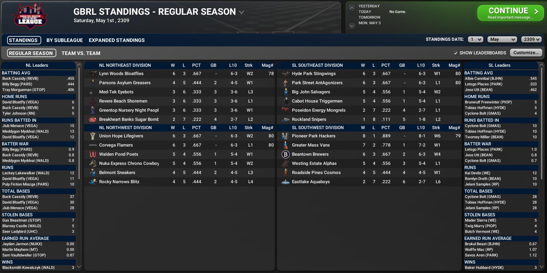 BNN Report News from the CBO, Minors, BCAC, and CYL by Nat Wright-Kawolski 1 May 2309 The May Super Post CBO Players of the Month NCA Hitter - The Slog Ghouls fans believe they've got a talented young star in Kilometers Davis. He did nothing to dissuade that notion in April, as he hit .407 with 10 home runs, 25 RBIs and 19 runs scored. The end result was the first baseman being named the North Charles Association Batter of the Month. SCA Hitter - Ken Debate made his presence known as one of the best young stars in the South Charles Association this past month. The Jamaica Plain Red Rockets left fielder shined through the month of April and has won the Batter of the Month award. The 24-year-old hit .346 with 10 home runs, 26 RBIs and 18 runs scored. NCA Pitcher - The Easy Town Assaultrons felt very secure when they sent Major Tom Brennan out to the hill last month. The 28-year-old starter went after North Charles Association hitters with a vengeance and earned April's Pitcher of the Month award. He went 4-0 with a 3.02 ERA as he struck out 29 in 41.2 innings over 5 starts. SCA Pitcher - Tony Bertha left little doubt in the minds of South Charles Association officials that he should be named April's Pitcher of the Month for his outstanding performance. "I wasn't always confident at the start of a game," said Bertha. "Sometimes it's hard to get into the flow -- the calls aren't going your way or you're trying to spot your pitches too much. You just have to relax and use what you've been taught all your life -- get back to basics -- good mechanics, control, location, keep the ball down." The 32-year-old tossed 40.2 innings of quality baseball -- going 5-0 with a 2.21 ERA and 18 strikeouts. NCA Rookie - Kilometers Davis earned April's Rookie of the Month honors in the North Charles Association for last month's performance. The boyish The Slog first baseman might be wet behind the ears, but he's proving that he has what it takes to play at this level. Davis hit .407 with 10 home runs, 25 RBIs and 19 runs scored this past month on his way to winning the award. SCA Rookie - Youngster Steve Mirv emerged as the latest South Charles Association Rookie of the Month today. The young man from Goodneighbor deserved the honor, batting .246 with 3 home runs and 12 RBI. Is the month of April a harbinger of things to come or just a fluke? We'll find out someday, but for now, we'll just let Mirv enjoy the limelight. MML Analysis We are a month into the 2309 season, and the players trying to vie for a spot back on a CBO roster seem to be the players standing out the most. At the same time, there are some youngsters who could see their first call up to the CBO soon. In the standings, division leaders at the end of April are the Burlington Ferals, Finch Farm Shamrocks, Providence Warlocks, and a tie between the Braintree Robobrains and Warwick Mirelurks. 1B Jackie Shepherd of Braintree (NB) appears to be the player most on his way to an MVP season with a .486 average, 6 home runs, 23 RBI, and an MML-best 1.7 WAR. Shepherd was never able to catch on to the Party Boys since being traded there from Quincy following the 2306 season. However, the 29-year-old has been a force for the Robobrains the past three seasons. MML Players of the Month LL Hitter - It's perhaps an award he'll win many more times through his career, as at age 22 Earhole Watson has a lot of baseball ahead of him. But for now the young Finch Farm Shamrocks star can enjoy the numbers he put up in April, which have garnered him the nod as the Legends League Batter of the Month. His breakout month featured a .365 average with 9 home runs, 30 RBIs and 21 runs scored. SL Hitter - Hester Mechanist may be much younger than other hitters in the Stars League, but he performed like a seasoned veteran in April to win the Batter of the Month award. The 21-year-old Warwick first baseman hit .450 with 9 home runs, 23 RBIs and 20 runs scored. LL Pitcher - Lynn Fortune Finders starter Wicked Good O'Malley has collected the Legends League Pitcher of the Month award for a run of lights-out performances. "This town really appreciates it when you're going well," said O'Malley. "They might boo you when you're getting knocked around, but they love you when you're mowin' them down." In April the 29-year-old compiled a 5-0 record in 5 starts with a 3.96 ERA. He threw 36.1 innings, fanning 34 while walking 23. SL Pitcher - The Stars League hitters didn't have a chance in April when the Warwick Mirelurks manager wrote "Cochrane" on the lineup card. Outing after outing, Homeslice Cochrane held teams in check and usually got a win. He excelled with a 4-0 mark and 2.74 ERA in 4 starts. The talented Mirelurks star pitched 23 innings, fanned 13 and held opposing teams to a .253 average. For his superb mound work Cochrane was named the SL Pitcher of the Month by the baseball writers. BMU Analysis The season is still early in the BMU with teams only having played nine games each thus far. Division leaders are the Brockton Irish; Sanctuary Hills Zetans, Woburn Bobbleheads, Mystic Pines Raybathers, and Littleton Ragers in the Cambridge League; Plymouth Pilgrims and West Roxbury Mole Rats in the Downtown Boston League; and Mayoral Shelter Tricentennials. GBRL Analysis Like the BMU, the GBRL season is still young, thus no players of the month just yet. Early divisional leaders are the Lynn Woods Bloatflies; Union Hope Lifegivers and Corvega Flamers in the Northwest Division; Hyde Park Stingwngs and Park Street AntAgonizers in the Southeast Division; and Pioneer Park Hackers. BCAC Analysis The BCAC enters its second season with a lot of exciting baseball from the "smarter" baseball players in the Commonwealth. Early players to watch include SS Togie Pitt, Fr, Harvard (.451/3/22/1.3 WAR) and SP Freon McMahan, Fr, Mass Bay (2-2, 3.23, 1.1 WAR). The Harvard Crimson and Tufts Jumbos lead the North Division, while the Commonwealth Terriers have a three-game lead in the South Division. BCA