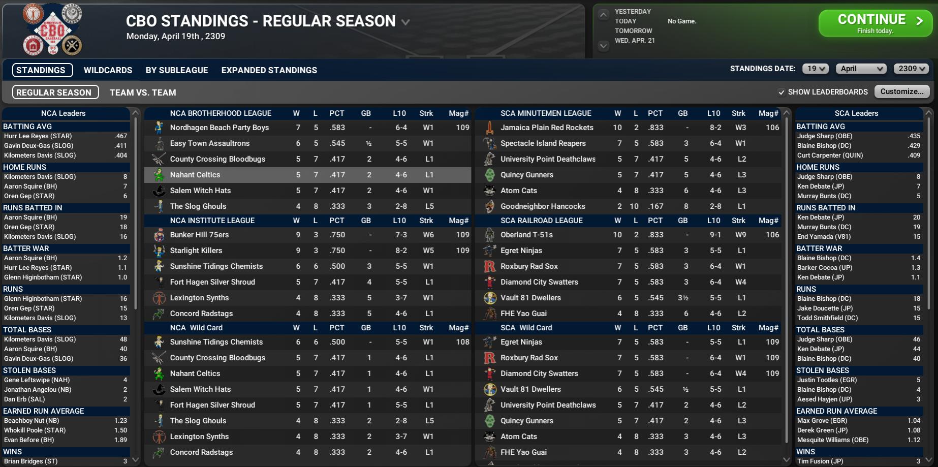 BNN Report News from the CBO, Minors, BCAC, and CYL by Nat Wright-Kawolski 6 April 2309 CBO Begins The 2309 CBO season begins today with 12 scheduled interassociation games. The Brotherhood League visits the Minutemen League, while the Institute League visits the Railroad League. Top Players, Prospects, and Systems CBO Transactions Tuesday, April 6th , 2309 County Crossing Bloodbugs: Placed RP Drama Miller on the restricted list. Bunker Hill 75ers: Released RP Mike Germanfrench. Jamaica Plain Red Rockets: Released 1B Pass Pewitt. Goodneighbor Hancocks: Placed RP Storn Cragstrider on the 7-day injured list, retroactive to 04/03/2309. County Crossing Bloodbugs: Released RP Ponds Scum. Quincy Gunners: Released 3B Conan O'Lyin. Concord Radstags: Released SS Devon Charlesbanker. Quincy Gunners: Released 2B Notso Bland. County Crossing Bloodbugs: Released RP Septimus Signus. Quincy Gunners: Released RP Daynas Valen. County Crossing Bloodbugs: Released SS Terrell Striker. Concord Radstags: Released RP Amray Mukanda. Quincy Gunners: Released RP Zeke Zapper. Concord Radstags: Released RP Ginger Breadman. County Crossing Bloodbugs: Released RP Peter Blastoff. Quincy Gunners: Released RP Zeb Orrelios. Concord Radstags: Released SS Hotstick Reynolds. County Crossing Bloodbugs: Released RP Chris Rockwall. Quincy Gunners: Released RP Andre Copeland. Concord Radstags: Released RP Cluup Mitenought. County Crossing Bloodbugs: Released RP Bobby Dadson. Quincy Gunners: Released RP Quincy Quinney. County Crossing Bloodbugs: Released SS Cobb Vanth. Concord Radstags: Released RP D.J. Alatorre. Quincy Gunners: Released RP Ophir Greene. Concord Radstags: Released RP Closecall Newsome. County Crossing Bloodbugs: Released 3B Joe Lurkhunter. Quincy Gunners: Released RP Chicken Tesla. Starlight Killers: Released 2B Fruki Fratelli. Egret Ninjas: Released RP Boss Celtic. Starlight Killers: Released 2B Green Daye. Egret Ninjas: Released RP Local H. Quincy Gunners: Released RP Dogma Moretooth. Egret Ninjas: Released C Armani Foundwood. Starlight Killers: Released RP Brina Merillis. Quincy Gunners: Released RP Heriberto Chambliss. Egret Ninjas: Released RP Banjo Britz. Starlight Killers: Released RP Sweetness Clement. Quincy Gunners: Released RP Molgrom Twicekilled. Egret Ninjas: Released RP Steel Hand Stan Pipboy. Starlight Killers: Released RP Dremora Valkynaz. Quincy Gunners: Released RP Dick Tracy. Egret Ninjas: Released RP Ray Orphan. Starlight Killers: Released RP Vic Interceptor. Starlight Killers: Released SS Wullf Yularen. Atom Cats: Released RP Ivvy Pantleg. Roxbury Rad Sox: Released RF Enzo Quickly. Atom Cats: Released RP Tony Padre. Roxbury Rad Sox: Released CF Reddy Herring. Atom Cats: Released RP Jefe Manzano. Roxbury Rad Sox: Released RP Mullet Cooper. Lexington Synths: Released SS Narses Yacoubian. Atom Cats: Released RP Juju Schoolteacher. Roxbury Rad Sox: Released RP Darnell Rockland. Lexington Synths: Released SS Bill Packmule. Atom Cats: Released RP Kodiak Whitemane. Roxbury Rad Sox: Released RF Milkwhite Maslanka. Lexington Synths: Released 3B Sho Nironov. Atom Cats: Released RP Joe Glass. Roxbury Rad Sox: Released RP Herluin Lothaire. Lexington Synths: Released RP Ren Siltman. Atom Cats: Released RP Orlie Dumbbell. Roxbury Rad Sox: Released RP Nick Wise. Lexington Synths: Released RP Nino Quantum. Atom Cats: Released RP Ryan Comequickly. Roxbury Rad Sox: Released RP Kid Sundance. Lexington Synths: Released RP Weaver Farmer. Atom Cats: Released RP Cecil Rosa. Roxbury Rad Sox: Released RP Ro Dylande. Lexington Synths: Released RP Sandy Guzman. Atom Cats: Released RP Spoony Brokeman. Roxbury Rad Sox: Released RP Crews Bear. Lexington Synths: Released RP Ground Willie. Roxbury Rad Sox: Released RP Danny Little. Roxbury Rad Sox: Released RF Doogie Greenhill. Roxbury Rad Sox: Released RF Elijah Breezedup. Sunshine Tidings Chemists: Released CF Moose Vanderbilt. Roxbury Rad Sox: Released RF Prince Burrell. Roxbury Rad Sox: Released RF Ferd Mainelander. Roxbury Rad Sox: Released RP Orlando Daltonfarm. Sunshine Tidings Chemists: Released RP Aldon Blaszczyk. Sunshine Tidings Chemists: Released RP Nucky Ostiguin. Sunshine Tidings Chemists: Released RP Sean Lucky. Sunshine Tidings Chemists: Released RP Aloha Ali. Oberland T-51s: Released RP Julio Heyward. Sunshine Tidings Chemists: Released RP Wes Yogurt. Oberland T-51s: Released RP Hyman Krustofsky. Sunshine Tidings Chemists: Released RP Cloud Strife. Oberland T-51s: Released RP Flamethrower Valdez. Sunshine Tidings Chemists: Released RP Wrecker Webb. Oberland T-51s: Released RP Trashbag Ortiz. Oberland T-51s: Released RP Judge Roy McCoy. Oberland T-51s: Released RP Ant Wunette. Fort Hagen Silver Shroud: Released RP Edric Stone. Fort Hagen Silver Shroud: Released C Dwayne Robinson. Fort Hagen Silver Shroud: Released RP Kwick Cola. Fort Hagen Silver Shroud: Released RP Burt Bottlecaps. Vault 81 Dwellers: Released RP Lukewarm Macnamara. Fort Hagen Silver Shroud: Released RP Kamari Coates. Vault 81 Dwellers: Released RP Artichoke Monrow. Fort Hagen Silver Shroud: Released RP Rudyard Kipling Tenner. Vault 81 Dwellers: Released RP Athlete Oak. Fort Hagen Silver Shroud: Released LF Jim Radiant. Fort Hagen Silver Shroud: Released LF Ryan Parkwatch. Vault 81 Dwellers: Released RP Ramiro Gix. Vault 81 Dwellers: Released RP Vitamin Magee. Vault 81 Dwellers: Released RP Merv Deepsea. Bunker Hill 75ers: Released 1B Tom Watts. Vault 81 Dwellers: Released RP Bobby Torres. Bunker Hill 75ers: Released RP Friday Piatek. Vault 81 Dwellers: Released RP Evening Sun Richards. Bunker Hill 75ers: Released RP Cork Kingfish. FHE Yao Guai: Released 2B Hjornskar Headsmasher. Easy Town Assaultrons: Released RP Hainly Abrams. FHE Yao Guai: Released RP Idolaf Battleborn. Easy Town Assaultrons: Released RP Ias Ford. FHE Yao Guai: Released RP Alebana Larkcrow. Easy Town Assaultrons: Released RP Train Corral. FHE Yao Guai: Released RP Chris Aragon. Easy Town Assaultrons: Released RP Razi Daz