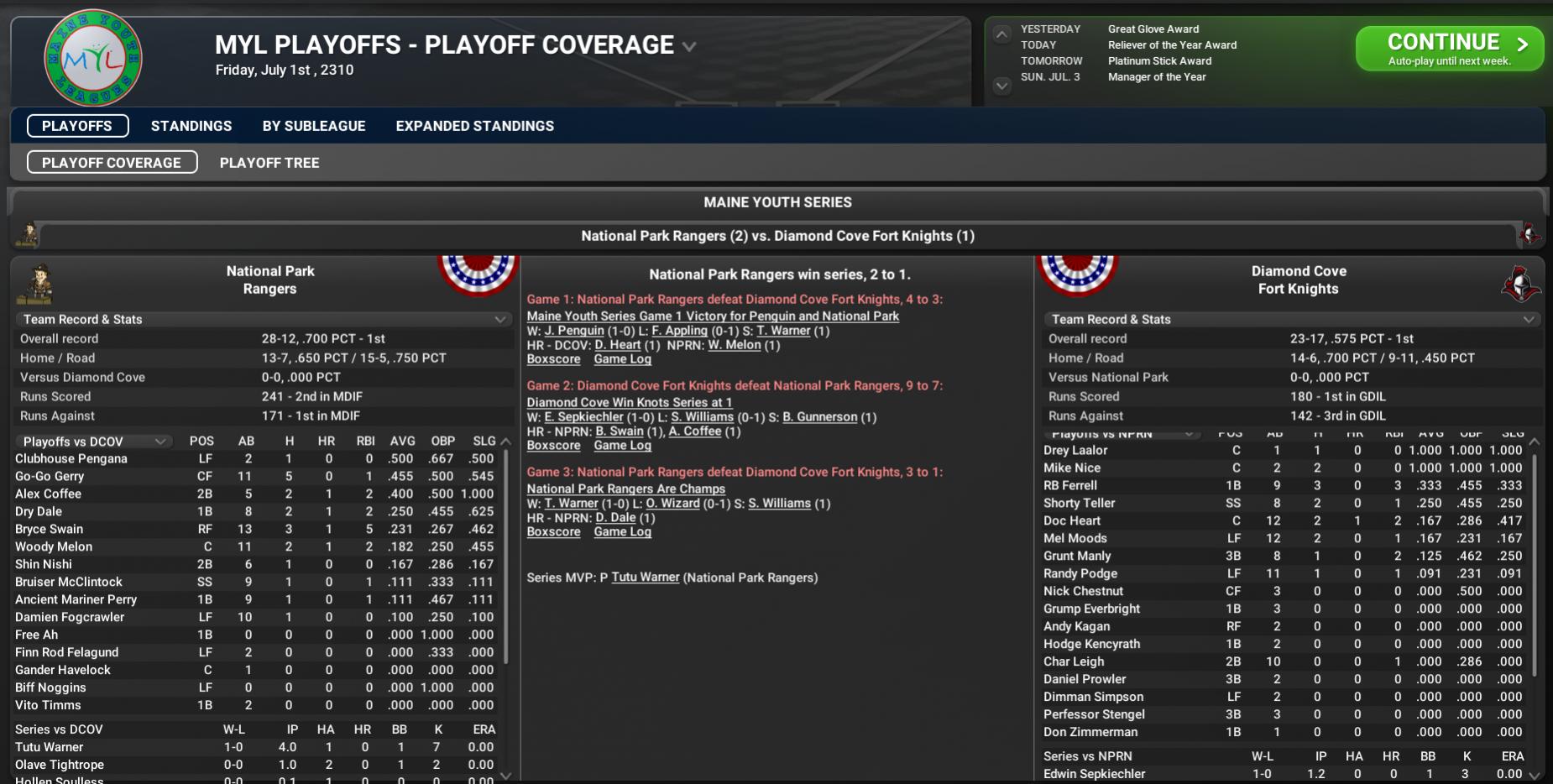 BNN Report News from the CBO, Minors, BCAC, and CYL by Nat Wright-Kawolski 12 July 2310 CYL Playoffs It was all about winning for the Hester Mechanists -- and win they did. There was nothing fancy in how they went about it, players said, they just prepared mentally and physically and then went out and played baseball. "We did the little things right and we did the big things right," said first baseman Freenow Sullivan, who was named series MVP. "Now we're the league champions." Hester, the #6 seed from the NR, defeated the West Quincy Atomatoys, the #8 seed from the SR, by a score of 5-2 at Atomatoys Factory Park to take the series 3-2. "Sometimes you get lucky and sometimes you make your own luck," said Hester manager Want Moreno. "We got lucky a few times, but mostly we did the right things by being prepared for each game and playing the game the way it's meant to be played." Hester defeated #11 Worcester 2-0, #3 Marlborough 2-1, #2 Woburn 2-1, and #1 South Charles Bank 2-1 in the NR playoffs. West Quincy defeated #9 Sandwich 2-1, #1 Andrew Station 2-0, #5 Brown 2-1, and #3 Nauset Beach 2-1 in the SR playoffs. MVP: 1B Freenow Sullivan, Sr, Hester Freenow Sullivan may not be a top prospect in the 2310 CBO Draft, but the senior had a major-league impact on his team in the Commonwealth Youth Series. Named MVP of the Series, Sullivan was 8 of 20 (.400) with two doubles, a home run, a walk, two runs, and four RBI. He was 2 for 5 with an RBI in Game 1; 1 for 3 with a walk in Game 2; 0 for 4 in Game 3; 3 for 4 with a double, a home run, two runs, and two RBI in Game 4; and 2 for 4 with a double and an RBI in Game 5. In his four years with the Mechanists, Sullivan batted .316 in 245 games wit 138 starts with 30 home runs and 102 RBI. He hit a career-high 17 home runs and had a career-high 54 RBI this season. The Buzz Around McDonald Hester's junior right-hander SP Buzzcut McDonald may not have been named the Series MVP, but scouts got a glimpse of how good he can be. In two starts in the Commonwealth Youth Series, McDonald was 2-0 with a 2.81 ERA in 16.0 innings pitched. He allowed 11 hits and five earned runs, walked three batters, and struck out 13. Scouts see McDonald as one of the top pitchers in the 2311 Draft. He is expected to go anywhere from the early to mid-1st round once he completes his youth career, assuming there are no setbacks or injuries to stunt his development. At the same time, scouts do not consider him to be in contention for the #1 overall pick unless he makes significant progress in the next 12 months. Scouts have cited "generational" talent at pitcher to warrant choosing one over a positional player with the #1 pick. Two of the #1 overall picks who have proved that talent are Nordhagen Beach's Beachboy Nut (#1 in 2296) and Roxbury's Nuke Laloosh (#1 in 2299). Two other players taken as #1 overall pitchers are Sunshine Tiding's Eugene Gym (#1 in 2298) and Goodneighbor's Clubhouse Treelover (#1 in 2307). Gym has been a good starter in the CBO but not generational, while the jury is still out for Treelover (6-8, 4.06), who is in his first season as a full-time starter. CBO Playoff Tree