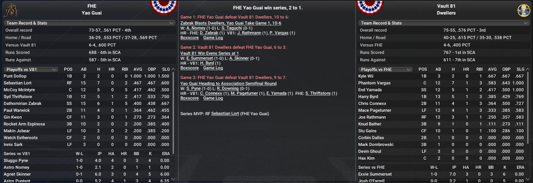 BNN Report News from the CBO, Minors, CCBL, and CYL by Nat Wright-Kawolski 12 September 2311 CBO Playoffs - Association Semifinal Round Previews NCA #4 Fort Hagen Silver Shroud (73-57) vs #1 Starlight Killers (80-50) Season Series Starlight 6, Fort Hagen 4 May 1-3 @Star: Star 6-4, FtH 10-6, FtH 10-8 May 29-30 @FtH: Star 6-0, Star 9-5 June 28-30 @FtH: Star 5-2, Star 10-6, FtH 8-4 August 10-12 @Star: FtH 7-1, Star 5-4 Analysis As much as both of these teams have been to the playoffs, they have only met twice in the playoffs before, both series victories for Fort Hagen. In 2299, the #2 Silver Shroud defeated the #3 Starlight Lady Killers, 3-2, in the Association Semifinals. The teams met again in 2301 in the Play-in Round. There, the Shroud won the series, 2-1. The Killers are now in their 9th overall playoff appearance and sixth-straight. Starlight has never been to the Sole Survivor Series, but they have advanced to the NCA Championship Series twice: 2308 as the #5 seed before falling to #3 Bunker Hill and 2310 as the #6 seed before falling to #1 Nordhagen Beach. In the regular season, Starlight held a slight edge over the Shroud, 6-4. Both 1B Oren Gep (.316/3/5) and LF Glenn Higinbotham (.220/2/11) were the power leaders for Starlight. However, Fort Hagen's SS Brennan Colt-45 (.436/5/13) was out of this world in the series. Both Killers starters Digger Vadim (2-0, 2.04) and Jerry Weisman (2-0, 3.00) were successful in the series. To earn the #1 seed this season, Starlight found its balance on both offense and defense. On offense, the Killers finished tied for 3rd in runs scored (696) with finishes at the top in OBP (.360), WAR (24.5), and SBs (219). Those 219 stolen bases shattered the NCA record of 128 set by The Slog in 2301 and the CBO record of 168 set by Vault 81, also in 2301. As a note, the 219 stolen bases is now a shared record with Egret, which also had 219 steals this season. Two players had more than 50 steals: 2B Looter Knol (.289/11/61/58 SB) and LF Glenn Higinbotham (.281/25/65/54 SB). C Biter Trout (.336/6/55) led the team in average, and Higinbotham was the homers and RBI leader. On the mound, Starlight was 1st in runs allowed (552) and Starters ERA (3.73) and 5th in Bullpen ERA (4.54). All three playoff starters have an ERA below 4.00: Vadim (14-5, 3.41), Shaak Ti (12-11, 3.68), and Whokill Poole (15-8, 3.87). Weisman (14-8, 3.68) will move to the bullpen for the playoffs. CL Justin Wilkerson (36 SV, 2.92) was serviceable, and he had help from Ryan Mills (2-1, 3.38) and Bill Sarnacki (3-0, 3.47). Prediction Starlight is not in its first bid as the #1 team, but the Killers have looked the part all season. They are a loaded team with pitching that dominated most of the season. Fort Hagen comes in as the preseason favorites, though they showed that some of the CBO newcomers on their team were not as adept at handling the established CBO talent. Still, the Silver Shroud are a tough out. This one seems as though it will be close, and for a five-game series any winning streak can tilt the series. We're going to ride the Killers, though. Starlight 3, Fort Hagen 2 NCA #3 Nordhagen Beach Party Boys (76-54) vs #2 Nahant Celtics (77-53) Season Series Nordhagen Beach 6, Nahant 4 April 12-13 @Nah: Nah 7-4, NB 5-2 May 5-7 @NB: Nah 11-3, Nah 10-9 (13), NB 5-2 July 17-19 @Nah: NB 9-8, NB 6-5, NB 4-2 August 5-6 @NB: NB 5-4, Nah 6-3 Analysis Nahant may have won the Brotherhood League crown in 2311, but having to start the playoffs against the back-to-back champions does not seem to be a fun affair. Nahant is making just its second playoff appearance in the full CBO with the last and only appearance coming in 2302 as Finch Farm. In that season, the Four Leafs, as they were known then, got bounced as the #5 seed in the Association Semifinals by #1 Nordhagen Beach. In the regular season, Nordhagen Beach edged the Celtics, 6-4. 3B Jacob Tarberry (.429/5/11) tortured the Nahant pitching. LF Grandson Quarles of the Celts went .429/2/6, having the best overall offensive performance for his team in the season series. One the mound, no one player dominated, though Nahant's SP Zack Million (0-1, 2.16) seemed to have been robbed in his two starts with how well he pitched. We mentioned how Starlight earned their way to the top due to having the best statistical output in the NCA. Well, the Celtics had the 2nd-best statistical output, thus the #2 seed. On offense, the Celts were tied for 3rd in runs scored (696). 3B Diamond Ball (.356/36/102) was the offensive leader, with Quarles (.313/18/63), 1B Bulleye Shooterson (.326/27/81), and RF Gene Leftswipe (.283/21/64/58 SB) being the main contributors. Nahant was 2nd in runs allowed (573), Starters ERA (3.96), and Bullpen ERA (4.41). Much of the Starters ERA was due to the top two starters: Million (13-8, 2.84) and Cohort Williams (20-8, 3.43). SP Lonely Gale (5-2, 2.08) was having a great season before a serious hamstring injury. He is expected back should the Celtics advance to the NCACS. In the bullpen, CL Rob Hoode (41 SV, 3.41) was not outstanding but did tie the CBO saves record. RP Mr X Lopez (1-1, 1.59) was dominant in his appearances. Prediction Why kid ourselves? Nahant has most of the statistical advantage except for the biggest one: playoff success. We really believe that Nordhagen Beach is the only team that can beat Nordhagen Beach. That does not mean the Celtics cannot surprise, but the Party Boys are going to be the favorites in this one, even as the #3 seed. We'll take them. Nordhagen Beach 3, Nahant 1 SCA #5 FHE Yao Guai (73-57) vs #1 University Point Deathclaws (81-49) Season Series University Point 2, FHE 2 June 22-23 @FHE: FHE 7-0, FHE 9-5 August 14-15 @UP: UP 8-2, UP 16-7 Analysis These two teams cannot be more different in their franchise histories at this point in CBO history. We already previewed that FHE is making just its second playoff appearance, earning its first series victory with a Wildcard Round upset of Vault 81. Univer