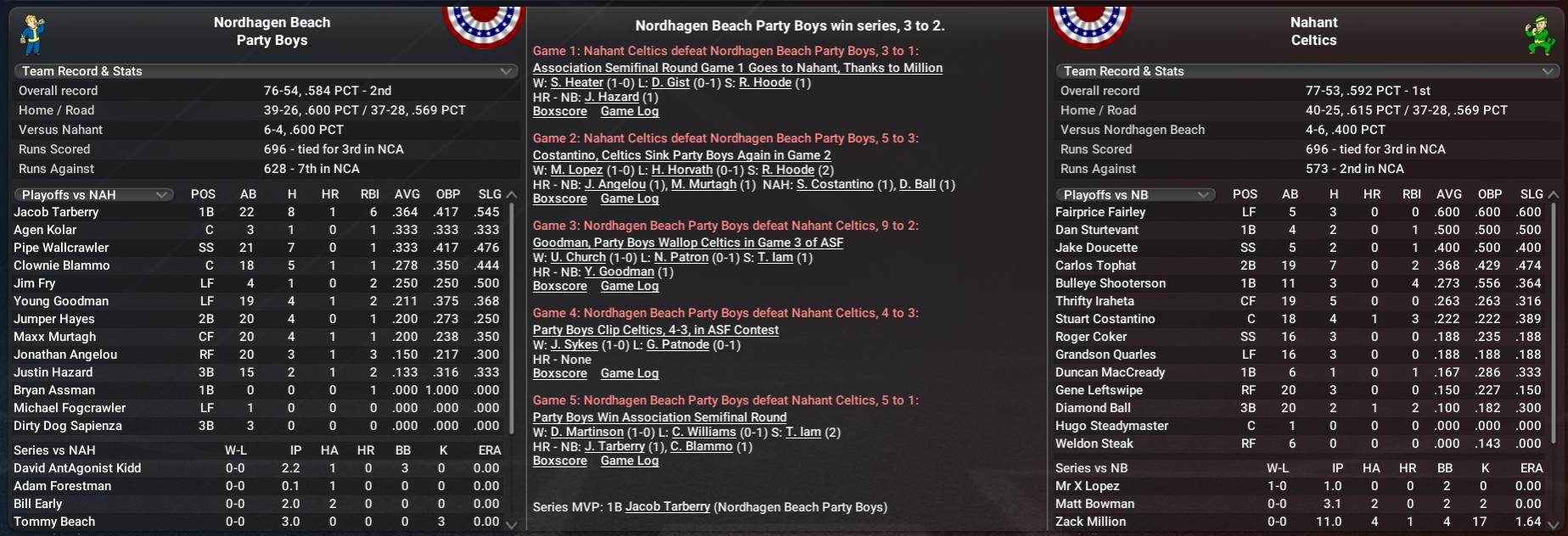 BNN Report News from the CBO, Minors, CCBL, and CYL by Nat Wright-Kawolski 19 September 2311 CBO Association Semifinals Round NCA #4 Fort Hagen Silver Shroud vs #1 Starlight Killers Game 1: Fort Hagen 17, Starlight 7 Fieterz Blasts Killers, Silver Shroud Take Game 1, 17-7 The Fort Hagen Silver Shroud started the Association Semifinal Round in style, winning on the road against the Starlight Killers at Valentine Detective Agency Field by a score of 17-7 to take an early 1-0 lead in the best-of-5 series. Silver Shroud right fielder Foo Fieterz excelled. He hit 2 home runs. He scored 4 times and drove in 3. Fort Hagen used a clutch at-bat from KiJana Mallee to capture the win. The left fielder hammered a 2-run home run in the top of the first inning to put the Silver Shroud ahead, 2-0. It was his lone hit in 3 at-bats, but it was a humdinger. "I just tried to see the ball and put a good swing on it," said Fieterz. The next game is set to be played tomorrow at Valentine Detective Agency Field in Lexington. Game 2: Starlight 6, Fort Hagen 5 Silver Shroud Hammered by Cloyse, Drop Game 2 to Killers With first baseman Goody Cloyse leading the charge, the Starlight Killers defeated the visiting Fort Hagen Silver Shroud, 6-5, in Game 2 of the Association Semifinal Round. Cloyse went 3-4 with a home run and 2 doubles. He scored 2 times and drove in 2 at Valentine Detective Agency Field to help Starlight force a 1-1 tie in the best-of-5 series. Hurr Lee Reyes drove in one run against the Silver Shroud. With the game tied in the bottom of the seventh inning, he hit a sacrifice fly that put Starlight in front, 6-5. "Every team in baseball loses," Silver Shroud manager Matt Ballhawk Getman said. "We're in the playoffs and we still have the same guys that got us here. We'll bounce back." Game 3 is scheduled for Friday at Hubris Comics Park in Fort Hagen. Game 3: Starlight 6, Fort Hagen 2 Road Win Lifts Starlight to 2-1 Lead in ASF The Starlight Killers moved to within one game of the Association Championship Series, downing the Fort Hagen Silver Shroud on the road at Hubris Comics Park by a score of 6-2. Killers third baseman Nick Maris went 3 for 4 with 3 singles, while adding 2 RBI and scoring once. The win gives the Killers a 2-1 advantage in the best-of-5 Association Semifinal Round. The game was on the line with two out in the bottom of the seventh inning, but Jerry Weisman didn't flinch. With runners on 2nd and 3rd and Fort Hagen trailing 4-2, Weisman retired Brennan Colt-45 to end the threat. "Nothing to it," said Weisman, with a wink. The next game is set to be played tomorrow at Hubris Comics Park in Fort Hagen. Game 4: Starlight 7, Fort Hagen 0 Killers Win Association Semifinal Round The Starlight Killers clubhouse was filled with glee and celebration tonight, while the Fort Hagen Silver Shroud room was filled with despair and sadness after the Association Semifinal Round concluded. "Someone's got to win and someone's got to lose, we're just glad we're on the good end of it tonight and can enjoy this," said Biter Trout, who was named MVP for a strong series of offensive performance. Starlight won the final game by a 7-0 count at Hubris Comics Park and the series 3-1. Fort Hagen manager Matt Ballhawk Getman was simple and to-the-point in his assessment of the series. "They were the better team and deserve to move on," he said. For the series, Trout hit .438 with a .474 on-base percentage. He had 0 home runs, drove in 4 RBI and scored 5 runs. The Starlight Killers don't know who they will face in the next round. They will play the winner of the Nordhagen Beach Party Boys - Nahant Celtics series. That series is tied at 2 games apiece. The Association Championship Series schedule will be announced after the Association Semifinal Round finishes. NCA #3 Nordhagen Beach Party Boys vs #2 Nahant Celtics Game 1: Nahant 3, Nordhagen Beach 1 Association Semifinal Round Game 1 Goes to Nahant, Thanks to Million The Nahant Celtics powered past the visiting Nordhagen Beach Party Boys, 3-1, in the opener of the Association Semifinal Round at Finch Family Park. Nahant starting pitcher Zack Million threw 5.0 innings of 2-hit ball, to lead the charge. The Celtics now lead the series 1-0. Had Duncan MacCready not delivered a key base hit in the bottom of the seventh, the outcome might have been different. Instead, with two down and a runner on 2nd, MacCready hit a run-scoring double. That made the score 2-1, in favor of the Celtics. "It's nice to deliver when your team's counting on you," said MacCready. The next game is set to be played tomorrow at Finch Family Park in Nahant. Game 2: Nahant 5, Nordhagen Beach 3 Costantino, Celtics Sink Party Boys Again in Game 2 The Nahant Celtics moved to within one game of the Association Championship Series, downing the visiting Nordhagen Beach Party Boys at Finch Family Park by a score of 5-3. Celtics catcher Stuart Costantino did some major damage. He went 3-4 with a home run and 2 singles, while adding 3 RBI and scoring once. The win gives the Celtics a 2-0 advantage in the best-of-5 Association Semifinal Round. With the game tied, 3-3, in the bottom of the sixth, Costantino had a key at-bat for Nahant. With runners on 1st and 2nd, Costantino hit a run-scoring single off Hard John Horvath, making the score 4-3, Celtics. "You need to show up when your number's called," said Costantino. The next game is set to be played for Friday, September 15th , 2311 at Slocum's Joe Seaside Stadium in Winthrop. Game 3: Nordhagen Beach 9, Nahant 2 Goodman, Party Boys Wallop Celtics in Game 3 of ASF The Nordhagen Beach Party Boys have closed some of the gap between themselves and the series-leading Nahant Celtics, winning, 9-2, at Slocum's Joe Seaside Stadium. Party Boys left fielder Young Goodman was 2-3 with a home run and 2 walks. He scored 2 runs and drove in 2. The win cuts the deficit facing the Party Boys to 2-1 in the best-of-5 Association Semifinal Round. Nahant had a runner on 2nd