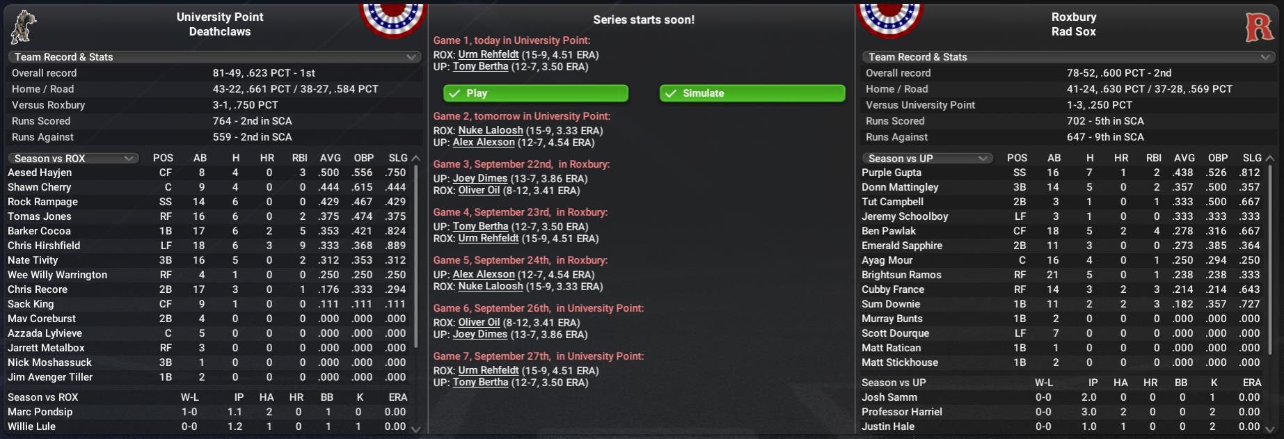 BNN Report News from the CBO, Minors, CCBL, and CYL by Nat Wright-Kawolski 20 September 2311 CBO Association Championship Series NCA #3 Nordhagen Beach Party Boys vs #1 Starlight Killers Season Series Starlight 3, Nordhagen Beach 1 May 24-25 @NB: Star 8-1, Star 11-3 July 29-30 @Star: Star 4-2, NB 3-1 Analysis Fourteen years of the CBO, and 14 playoff appearances for Nordhagen Beach. We are almost surprised if they are NOT in the NCA Championship Series. In fact, in those 14 appearances, including this season, this marks the 10th trip to the NCACS. In the first nine appearances, the Party Boys won the NCACS six times, including the past two seasons. the Boys are also the kings of championships, having won four. No team is as accomplished, so obviously Starlight is not in that number. Still, compared to other NCA teams not counting the Boys, the Killers stack up well. This is their 9th playoff appearance, including their sixth-straight. However, in those previous eight years, the Killers have never won the NCA, thus no Sole Survivor Series appearances. They have appeared in two NCACS before, including this rematch from a season ago. They also appeared in 2308 against Bunker Hill. This matchup represents just the third time Nordhagen Beach and Starlight will meet in the playoffs. They first met in 2308 as the #4 and #5 teams, respectively. In the Play-in Round Series, the Killers came out on top, 2-0, on their way to their first NCACS appearance. In 2310, these teams met as the #1 and #6 teams respectively, with the Boys coming out on top in the NCACS, 4-2. In the regular season, this matchup was all Starlight. In the four-game series, the Killers held the Party Boys to just nine total runs, winning the scoring battle, 24-9. Each team's ace won their one game started (not directly matched up). SP Beachboy Nut (1-0, 1.23) allowed just one earned run in 7.1 innings pitched. SP Digger Vadim (1-0, 1.23) did exactly the same. On offense, neither team showed much power with nine players each hitting a home run apiece. C Biter Trout of the Killers hit .33 with a home run and four RBI against his former team. LF Young Goodman of the Boys led his team in hits with five, batting .500, but he had no homers nor RBI. Looking at the matchups by position, we can see some advantages. Starlight and Nordhagen Beach each tied for 3rd in the NCA in runs scored (696). However, the Killers had a 552 (1st) to 628 (7th) advantage in runs allowed. Here are side-by-side comparisons based on OSA ratings with Nordhagen Beach players listed first and Starlight players listed second: SP1 - Beachboy Nut > Digger Vadim SP2 - Deedee Martinson > Shaak Ti SP3 - Ugio Church > Whokill Poole RP1 - David "AntAgonist" Kidd > Closecall Zamora CL - Ted Iam < Justin Wilkerson C - Clownie Blamms < Biter Trout 1B - Jacob Tarberry > Goody Cloyse 2B - Jumper Hayes < Looter Knol 3B - Justin Hazard < Nick Maris SS - Pipe Wallcrawler > Wolf McQuaid LF - Young Goodman < Glenn Higinbotham CF - Maxx Murtagh > Willy Mazehaze RF - Jonathan Angelou < Hurr Lee Reyes Prediction Based on everything seeming to come together for Starlight, there is no doubt that they have been one of, if not, the best teams in the CBO. While the talent seems to be lagging behind in pitching for the Killers, they were absolutely better than the Party Boys in 2311. Of course, the Nut factor is an almost-guaranteed win in those games, but the other games are wide open with Starlight also seeming to have more talent across the board on offense and Nordhagen Beach's aging players. Looking at this series from a historical perspective, though, there is no doubt that the Party Boys are THE team when it comes to the playoffs. As defending back-to-back champions, all roads pass through the settlements of Winthrop and its stadium on the beach. Starlight may be an up-and-coming franchise ready to take control. Until they do, though, it is impossible to pick against the champions. Nordhagen Beach 4, Starlight 2 SCA #3 Roxbury Rad Sox vs #1 University Point Deathclaws Season Series University Point 3, Roxbury 1 April 10-11 @Rox: UP 9-7, Rox 6-5 July 27-28 @UP: UP 7-6 (11), UP 4-2 Analysis This is Roxbury's 8th trip to the playoffs and second-straight after a two-year absence. For University Point, it is making its 11th playoff appearance, and third-straight. Interestingly enough, despite these two teams being the SCA's most successful, at least in the last decade, they have only met ONCE prior to this season. In 2303, the #1 Rad Sox defeated the #2 Deathclaws, 4 games to 1, in the SCA Championship Series. The Sox then went on to defeat Fort Hagen in the Sole Survivor Series for their first of two-straight championships. In the regular season, the Claws held the advantage, 3-1, with all four games being settled by two runs or fewer. Both LF Chris Hirshfield (.333/3/9) and 1B Barker Cocoa (.353/2/5) did their thing for University Point on offense. Three players for Roxbury had two home runs each in the season series: CF Ben Pawlak (.278/2/4), RF Cubby France (.214/2/3), and 1B Sum Downie (.182/2/3). No pitcher particularly stood out in the season series, but the Deathclaws' SP Alex Alexson allowed just one earned run in two starts and 11.1 innings pitched, walking six and striking out 11. He had no decisions in both starts. Looking at the matchups, the Claws seem to have all the advantages. University Point was 2nd in the SCA with 764 runs scored and 2nd in runs allowed (559). Meanwhile, the Sox were 5th in runs scored (702) and 9th in runs allowed (647). Despite the Rad Sox's bad statistical output relatively, there is no doubt that they can match the Claws' talent. By a breakdown of positions, here is what we've got with the Roxbury player listed first and University Point player listed second: SP1 - Nuke Laloosh > Tony Bertha SP2 - Oliver Oil > Joey Dimes SP3 - Urm Rehfeldt > Alex Alexson RP1 - Dobbie Radoncis < Matt Hoernig CL - Professor Harriel > Willie Lule C - Ayag Mour > Sh