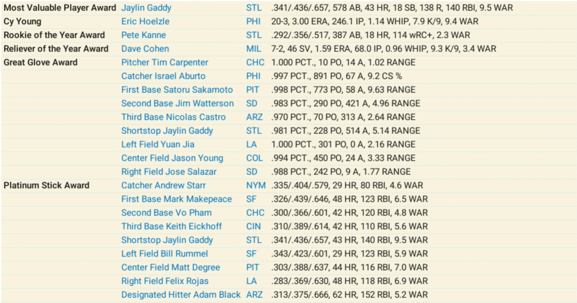 According to the prognosticators, the Valmara Vipers will ever so slightly edge out the defending IPA champion Marston Nine for the Ruthandian Union title. In the Tycobbian Union, Bayview and Kenwood will tie for first place. The Red Bluff Red Sox, who have won the first three TU pennants, will fall to fifth place. |