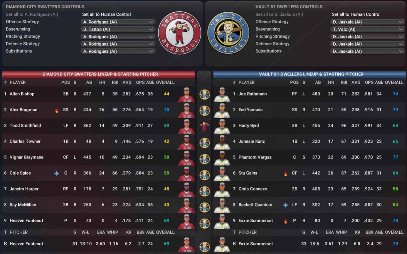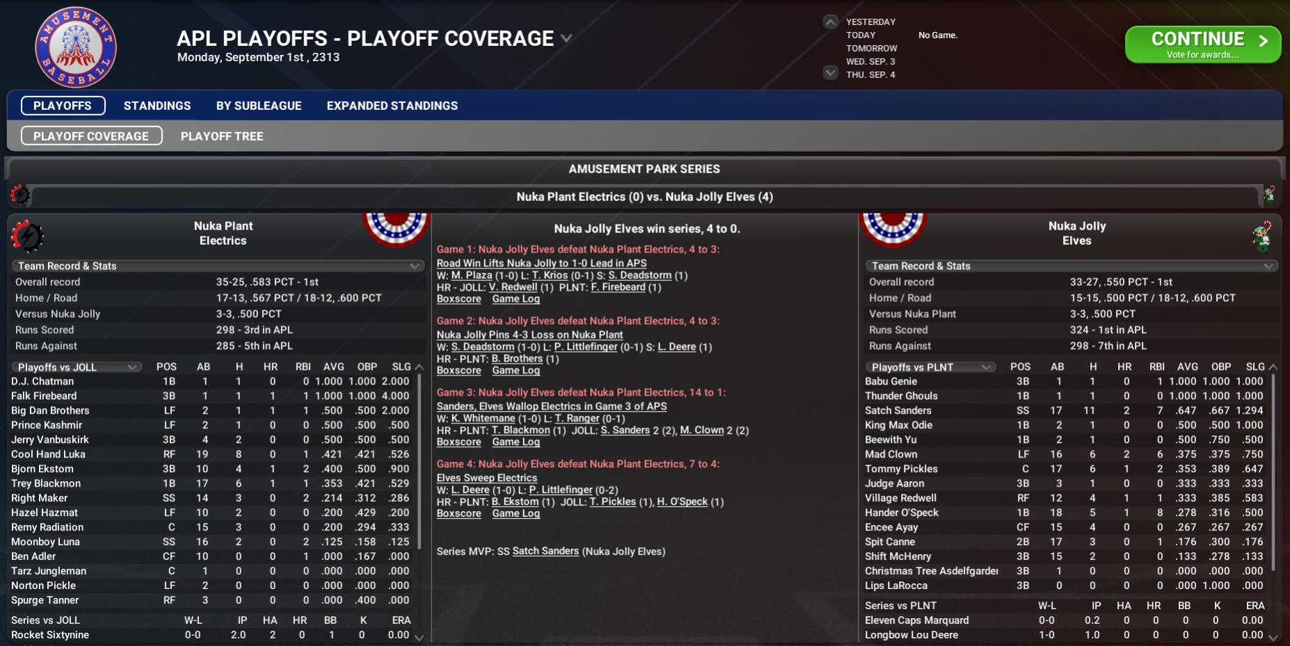 As far as the Radscorpions are concerned, I was pulling for them, too, as the ultimate Cinderella story. Oh well, maybe next year. They should be happy with how well they are developing players. I may need to make a deep dive into their front office to see what's up. They most certainly have not benefited from my interference.