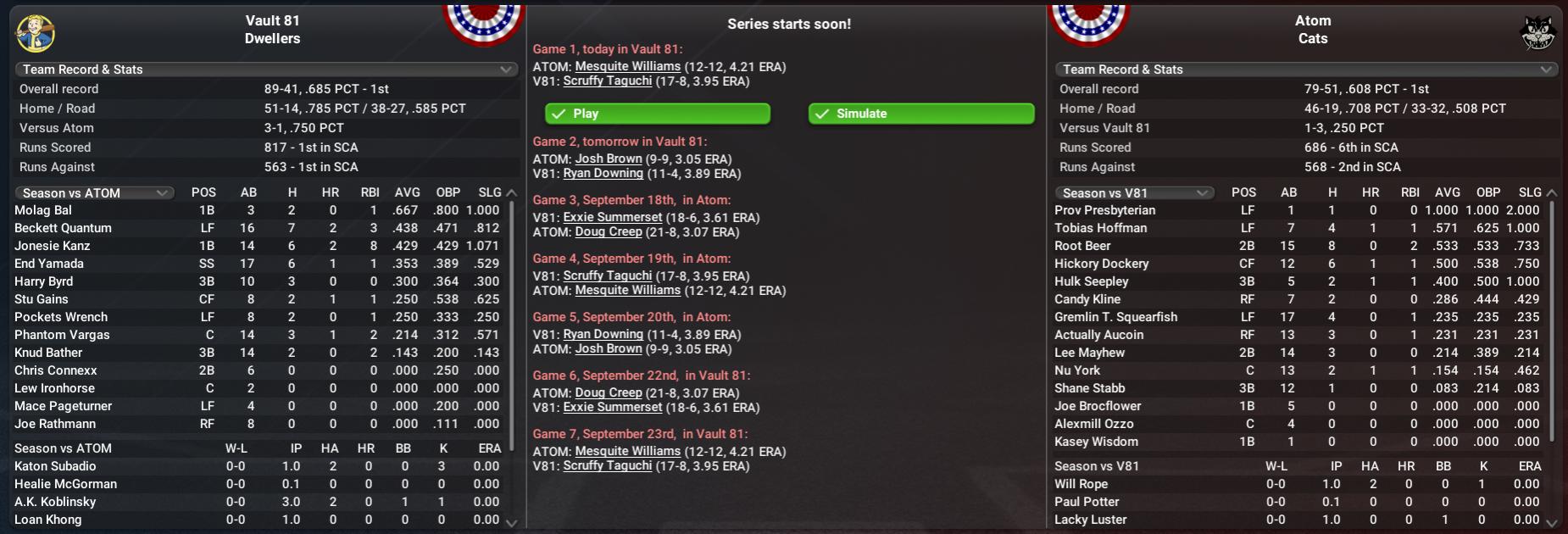 BNN Report News from the CBO, Minors, CCBL, and CYL by Nat Wright-Kawolski 8 September 2313 CBO Playoffs 2313 SCA Semifinal Round: #3 FHE Yao Guai (78-52) vs #2 Atom Cats (79-51) Season Series: FHE 2, Atom 2 June 17-18 @FHE: FHE 5-4, Atom 6-5 August 13-14 @Atom: Atom 8-2, FHE 11-5 Analysis From 2301-2305, the Atom Cats were players in the CBO playoffs, including 2301 when they advanced to the Sole Survivor Series as the #3 seed before falling to Nordhagen Beach. Still, in all those seasons, the Cats were unable to win the Minutemen League. Until this year. Atom has won its first Minutemen League crown and now enters the playoffs as the highest seed (2) that it has ever been. The Cats' reward is to play against one of the CBO's top teams in FHE. During the season, the two teams split the series, 2-2. There was little knowledge to gain and use in that four-game series, but seeing how the teams matched up could reveal this to be the CBO's best Semifinal Round series. This season also marks only the second time that FHE and Atom are in the playoffs at the same time with the first being 2303. This will be their first playoff meeting. Atom has not hit the cover off the ball in 2313, though their offense was decent. The Cats finished 6th in runs scored (686) with their best categories being OPS (.806) and wOBA (.349), both 3rd in the SCA. 3B Shane Stabb (.345/17/71) had a great year with the help from three other .300 hitters in RF Candy Kline (.339/13/53/17 SB), LF Gremlin T. Squearfish (.320/14/69), and SS Patrick Funday-Monday (.345/3/12). 2B Lee Mayhew (.277/22/65) led the team in homers. On the mound, the Cats were much better, finishing 2nd in runs allowed (568), including holding the top Starters ERA (3.80). Starters Doug Creep (21-8, 3.07) and Josh Brown (9-9, 3.05) held opposing hitters down. Creep's 21 wins led the CBO and fell just one short of tying the CBO record of 22 wins. The bullpen was not bad either, with CL Lacky Luster (26 SV, 1.80) being in serious discussion for the Fallon's Reliever Award. Prediction We already mentioned that we feel these two teams are evenly matched, so we are predicting this one to go the distance of five games. We feel that Atom slightly overperformed this season and is at best the third-best SCA team, so we think this series will go to the Yao Guai. FHE 3, Atom 2 SCA Semifinal Round: #5 Diamond City Swatters (66-64) vs #1 Vault 81 Dwellers (89-41) Season Series: Vault 81 6, Diamond City 4 May 16-18 @DC: DC 6-5, V81 4-2, V81 5-4 June 30-July 1 @V81: DC 5-4 (10), V81 18-4 August 22-24 @V81: V81 7-2, V81 6-1, V81 12-6 August 28-29 @DC: DC 8-5, DC 8-4 Analysis The first and only time the Diamond City Swatters and Vault 81 Dwellers met in the playoffs, it came in the 2300 season when the #3 Swatters were trying to defend their championship over the #1 Dwellers. In the end, Diamond City took the series, 4-3, and went on to defeat Fort Hagen for the second-straight time in the Sole Survivor Series. This season, that matchup should look much different with the Dwellers sporting the CBO's top record, 23 games better than Diamond City. In the season series, Vault 81 had the slight edge, but we are expecting something different as the Dwellers are looking to defend their SCA crown. Vault 81 is certainly statistically the team to beat. On offense, the Dwellers were tops in every statistic but stolen bases (8th at 92). They led in runs (817) and home runs (213). Those 817 runs scored beats University Point's 2310 team record of 789. No player in the eight-man lineup hit fewer than 17 home runs, showing that the entire lineup is stacked against opposing pitchers. The top three were CF Stu Gains (.262/26/87), 3B Harry Byrd (.327/24/96), and 2B Chris Connexx (.289/23/65). 1B Jonesie Kanz (.331/17/67) was the top hitter on the team for batting average, though he had too few at bats to qualify as the team leader. On the mound, the Dwellers were also 1st in runs allowed (563), including 2nd in Starters ERA (4.01). The three playoff starters all have ERAs below 4.00: Exxie Summerset (18-6, 3.61), Scruffy Taguchi (17-8, 3.95), and Ryan Downing (11-4, 3.89). In the bullpen, there are two players with at least 10 saves: A.K. Koblinsky (23 SV, 3.46) and Dynamite Delaney (10 SV, 3.73). Prediction This will not be close. Vault 81 is great. Diamond City is riding a late-season surge and a first-time playoff team matchup to get this far. The radbuck stops here. Vault 81 3, Diamond City 0