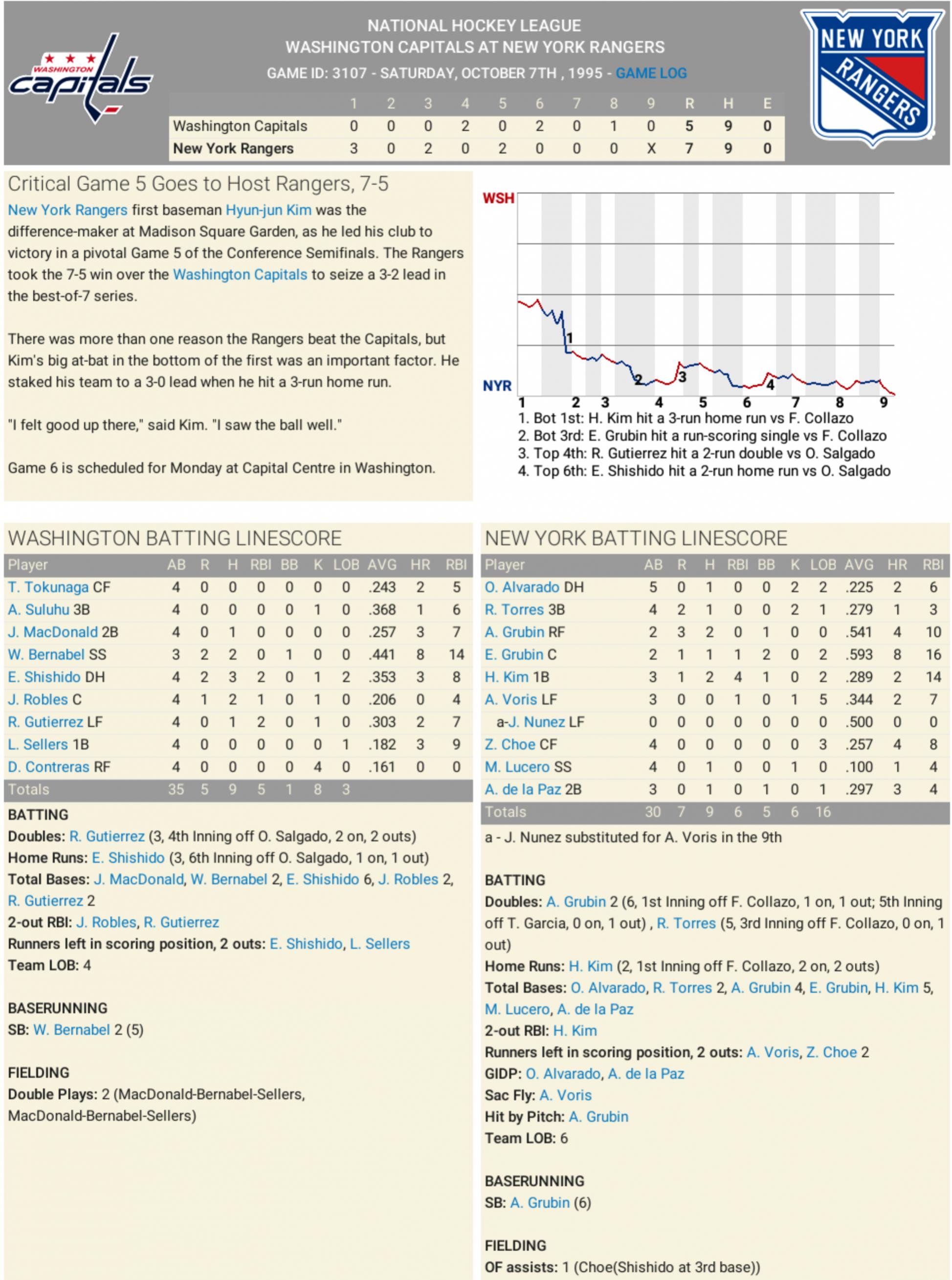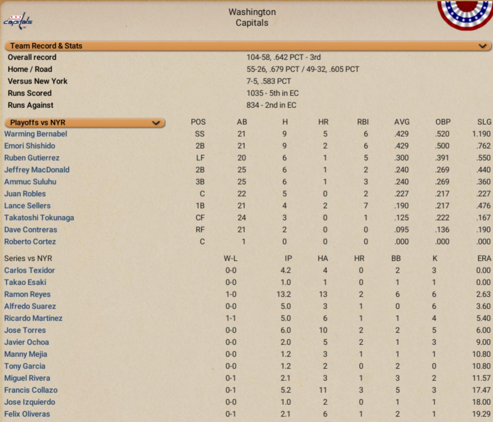 Lance Sellers, Capitals 1st baseman, at the age of 39 this year had announced his plans for retirement earlier this season.. A good fielder with some pop in his bat, but not really known for his offense, appears to have had one final hurrah, winning Game 4 of the East Conference Semifinals vs. the Rangers with a walk-off 2-run clout in the bottom of the ninth, capping off Washington's rally to tie the series at 2-2. Sellers has bounced around the league with a few different teams over his career. In fact, the Caps are his 4th different team in the past 4 years. This is the kind of story that makes OOTP great.