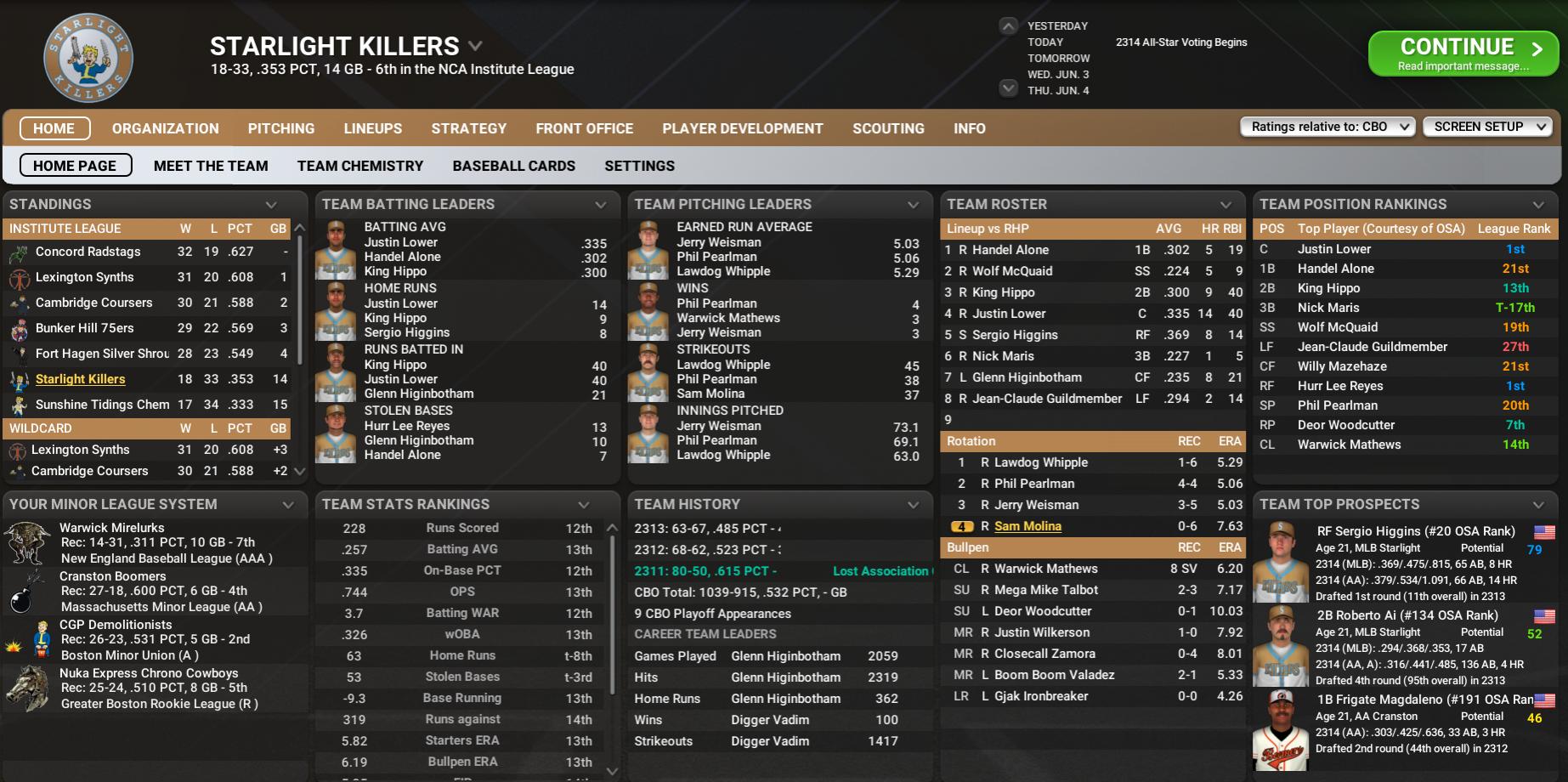 News from the CBO, Minors, CCBL, and CYL by Nat Wright-Kawolski 1 June 2314 The June 1 Super Post, Part 1 CBO Analysis It is both time for a Monday update and the first day of the month. That means we will have three articles posted in addition to our friends in Bradberton and Far Harbor posting their June 1 updates. In the CBO, every team has now played 50 or 51 games, putting us at the 40% mark of the season. We have a new king of the hill in Vault 81 (36-15), now a half-game above The Slog for the CBO's top record. Only seven teams have won 30 or more games with three of them coming from one league, the Institute League. Here are the current team power rankings for Commonwealth Baseball Organization: Teams (Total Points, Tendency): 1) The Slog Ghouls (129.0, +) 2) Vault 81 Dwellers (128.1, -) 3) University Point Deathclaws (118.4, ++) 4) Cambridge Coursers (108.8, o) 5) Lexington Synths (108.4, o) 6) Quincy Gunners (106.8, o) 7) Concord Radstags (105.9, --) 8) Glowing Sea Radscorpions (103.4, o) 9) Fort Hagen Silver Shroud (101.8, ++) 10) Diamond City Swatters (99.8, ++) 11) Bunker Hill 75ers (99.4, -) 12) Oberland T-51s (98.8, +) 13) Atom Cats (98.2, --) 14) FHE Yao Guai (97.2, --) 15) Nordhagen Beach Party Boys (90.8, ++) 16) Southie Brews (87.0, -) 17) Easy Town Assaultrons (84.2, o) 18) Salem Witch Hats (82.8, -) 19) Nahant Celtics (75.2, +) 20) Goodneighbor Hancocks (73.6, ++) 21) County Crossing Bloodbugs (71.6, -) 22) Egret Ninjas (71.0, ++) 23) Jamaica Plain Red Rockets (67.6, o) 24) Malden Grognaks (67.2, --) 25) Spectacle Island Reapers (67.1, --) 26) Roxbury Rad Sox (62.5, -) 27) Starlight Killers (60.5, -) 28) Sunshine Tidings Chemists (55.9, o) Brotherhood League The Slog is starting to run away with this league. Although they had a bit of a bad start last week to allow Vault 81 to catch up and surpass them, the Ghouls have gone 6-4 in their last 10, helping to pull themselves to an 11.5-game lead over Salem and Nordhagen Beach. The Witch Hats and Party Boys also announced a big trade today with the Boys sending LF Gorgeous DiGiacomo (.310/5/27) to the Hats for two minor leaguers, Pudding Pop and Posky Enchtull. The remaining order of the BL is Easy Town, County Crossing, and a tie for 6th between Malden and Nahant. Salem is appearing that it is looking to put itself in a position to be a 2314 playoff team, though the Hats currently trail the 6th team in the NCA, Fort Hagen but four games. Still, adding an All-Star like DiGiacomo may give them a boost to an offense scoring runs (4th at 270) but struggling in a lot of offensive categories, particularly average where the Hats are 9th (.271). We are not sure where DiGiacomo fits in with LF Jig McGhee (.318/11/26) already doing well, but we will guess that the Witch Hats have a plan. That plan may be looking for pitching help where Salem is 11th in runs allowed (279) mostly because of the bullpen (11th with a 5.96 ERA). Jaa Thirtysix (4-5, 3.84) is doing OK, but he is the only starter with a sub-4.00 ERA. CL Corpulus Vinius (8 SV, 4.32) has one of the best bullpen ERAs, which shows where the Hats are falling short. Institute League The IL has become a suddenly tight and competitive league with five teams within four games of 1st place, all with a one-game difference. The top five are Concord, Lexington, Cambridge, Bunker Hill, and Fort Hagen, which would occupy seeds 2-6 if the playoffs were to start today. Starlight and Sunshine Tidings are competing for the CBO's #1 pick at this point. The Killers were heavy contenders just three years ago, making the playoffs six-straight years with two IL titles, including in 2311. They dropped out, barely missing the playoffs in 2312, and then finished four games below .500 last season. This season, they are not good at 18-33.Starlight is 12th in runs scored (228) and dead last in runs allowed (319), tied with Spectacle Island for the CBO's worst and one of only three teams (Sunshine Tidings) who have allowed 300+ runs. On offense, there are some pieces in place to help, with second-year C Justin Lower (.335/14/40) and rookie RF Sergio Higgins (.369/8/14) making some waves. The pitching is unsalvageable right now with the lowest ERA on the team being 4.26 for RP Gjak Ironbreaker. Ace Lawdog Whipple (1-6, 5.29) is past his prime after being traded from University Point. The Killers need to invest heavily in pitching. Minutemen League Speaking of the dev--deathclaw, University Point has been the CBO's hottest team, surging into 1st place in the ML. The Claws were a CBO-best (tied) 20-8 in May, along with Vault 81. Quincy is just a game back, followed by Atom, Southie, Goodneighbor, Jamaica Plain, and Spectacle Island. The Brews had a great April but a miserable May to drop them to .500. University Point is 3rd in runs scored (284) and 4th in runs allowed (230), so they still have some work to do. But they are good. Of course, Barker Cocoa (.335/20/48) leads the CBO in homers and total bases (133). What may kill the Claws' momentum is the injury to Ziggy Stardust (.341/5/24), ending his 2314 campaign. The top two starters, Digger Vadim (7-3, 3.45) and Tony Bertha (4-4, 3.79) have been doing what it takes to win. The Killers score a lot when Alex Alexson (7-4, 4.54) starts. Closer Swampy Tamragouri (16 SV, 0.00) has been a stellar offseason acquisition. Tamragouri claims he comes from the Swamplands of the South and heard about the CBO. Great addition to the league! But maybe unfair that he was able to sign with the Claws. Spolier: scouts think the 0.00 has been more luck than skill since they rate him as the 3rd-best closer in the CBO based on current scouting. Railroad League Vault 81 has a seven-game lead over Glowing Sea, giving the Dwellers the second-largest lead in the CBO. After the Radscorpions, there is Oberland and Diamond City tied for 3rd, FHE at 5th, Egret, and then Roxbury. The first five teams are above .500, though the Yao Guai would be both if the playoffs began today. The 