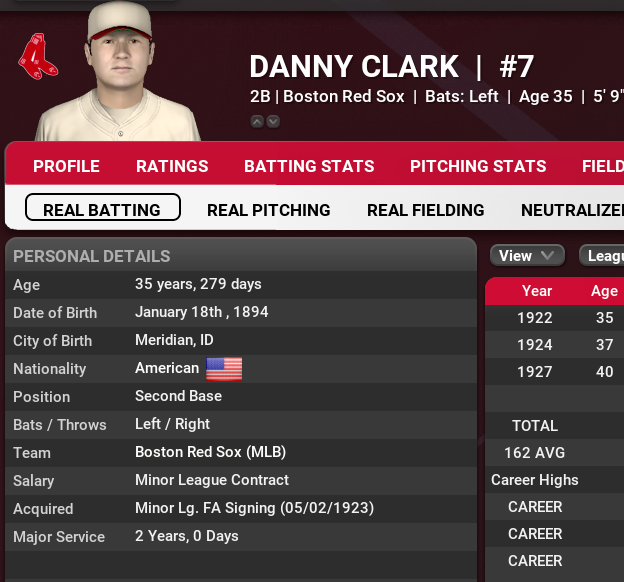 Also, 1920s pitcher Sam Gray comes into the game as "Dolly" Gray. I see no reference to this name on BBRef. He should be Sam with the nickname Sad Sam as is the case. I think this might have been improperly transcribed from Dolly Gray. One more. DOB is correct but for some reason the age-seasons for Danny Clark's IRL stats are out of whack. Thanks G