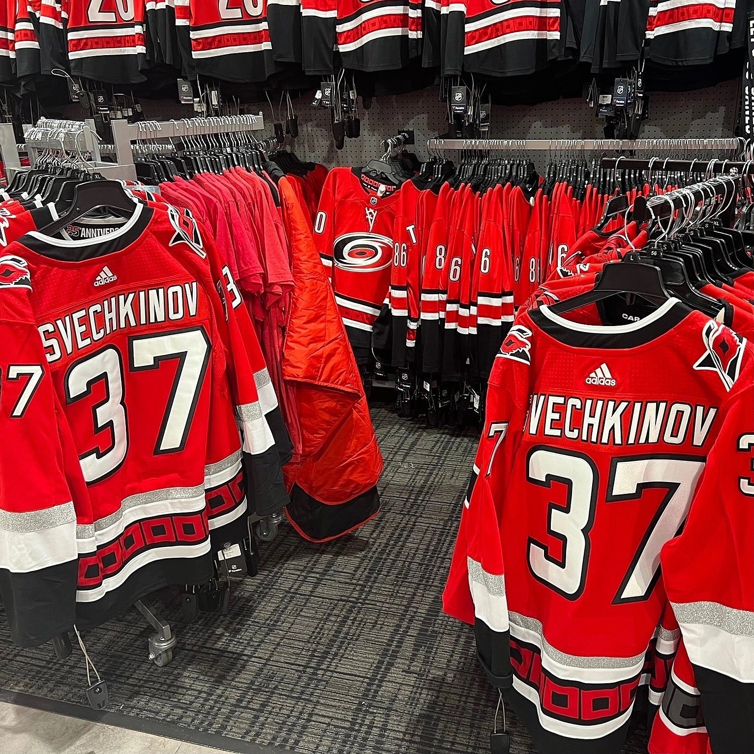 Fresh jerseys @ The EYE, Canes merchandise store in Lenovo Center. Somebody is going to get fired.