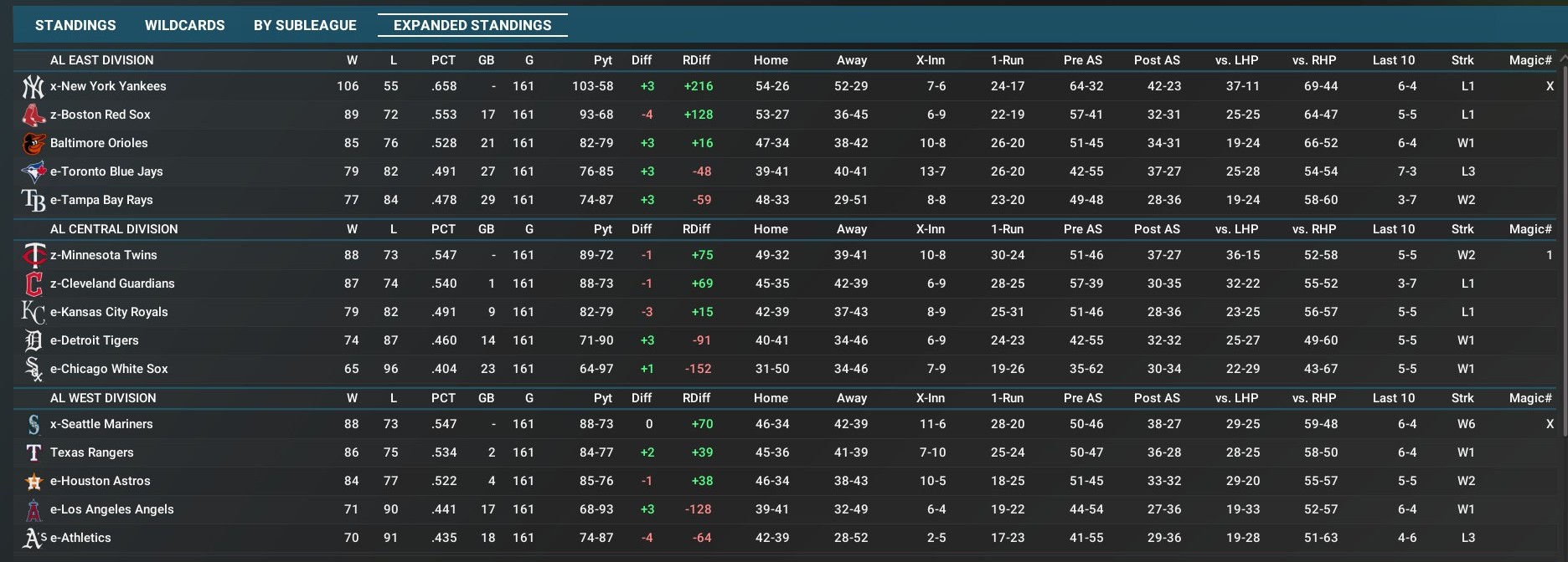 At 87-73, the Mariners sit two games ahead of the Texas Rangers with two games remaining in the regular season. Seattle owns an 8-5 edge in regular-season play, which would give it the advantage should the division end in a tie. Seattle has never reached the World Series. |