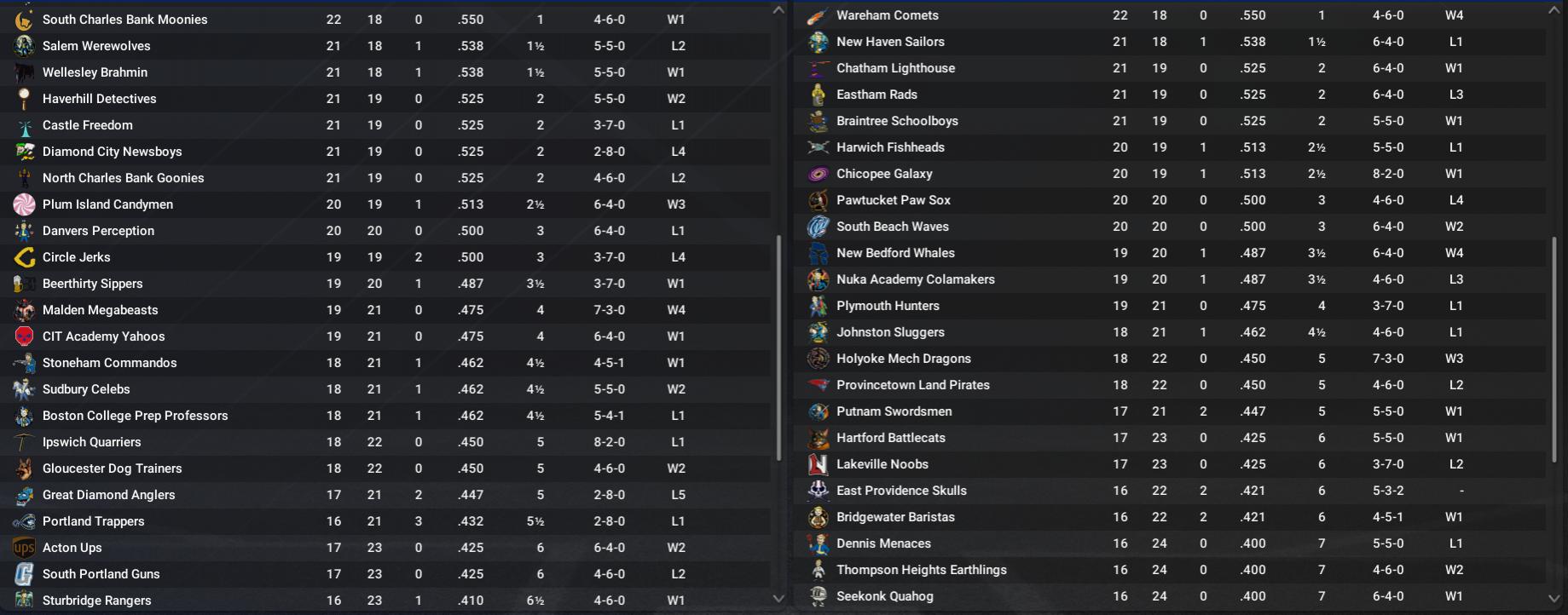 BNN Report News from the CBO, Minors, CCBL, and CYL by Nat Wright-Kawolski 17 May 2315 CBO Analysis We are 38 games into the 2315 season, and one team, Salem, is already near 30 victories at 29-9. Another team, Lexington, is not that far behind, while the rest of the CBO appears to be at the standard deviation. There are few surprises at the bottom of the standings, but there are a few surprises, like Roxbury being alone in 1st place in the Railroad League. We will break down each league, but first, here are the current team power rankings for the Commonwealth Baseball Organization: Teams (Total Points, Tendency): 1) Salem Witch Hats (144.3, o) 2) Lexington Synths (136.0, o) 3) University Point Deathclaws (118.8, +) 4) Roxbury Rad Sox (116.9, +) 5) Atom Cats (109.2, +) 6) Glowing Sea Radscorpions (108.2, ++) 7) Bunker Hill 75ers (100.5, +) 8) Oberland T-51s (98.7, --) 9) Quincy Gunners (98.7, ++) 10) Malden Grognaks (95.0, ++) 11) Vault 81 Dwellers (93.5, --) 12) Sunshine Tidings Chemists (93.0, o) 13) Southie Brews (90.3, +) 14) Easy Town Assaultrons (89.3, ++) 15) Diamond City Swatters (84.3, o) 16) Jamaica Plain Red Rockets (83.5, ++) 17) The Slog Ghouls (81.3, -) 18) County Crossing Bloodbugs (79.5, +) 19) Egret Ninjas (79.5, ++) 20) Spectacle Island Reapers (79.3, --) 21) Fort Hagen Silver Shroud (79.0, --) 22) Cambridge Coursers (75.8, +) 23) Nahant Celtics (75.3, --) 24) Concord Radstags (72.8, --) 25) FHE Yao Guai (71.8, +) 26) Starlight Killers (55.9, +) 27) Nordhagen Beach Party Boys (52.6, -) 28) Goodneighbor Hancocks (50.2, --) Brotherhood League The Witch Hats, which we will feature this week in our readers' choice of the 'S' teams with one stretch, is 10 games up on Malden. The rest of the BL is below .500, with a three-way tie for 3rd (Easy Town, Nahant, and The Slog), followed by County Crossing and Nordhagen Beach. The Hats have been dominant so far, though the statistics do not fully reflect that dominance so far. Salem is 4th in runs scored (197) with their best category on offense being OBP (1st at .366). At the top of hitting for average are 2B Seemly Sam Tucker (.362/2/34), RF Thatch Heard (.340/4/21), and 1B Brian DeLong (.317/4/19). On the mound, the Witch Hats are dominant, leading in all of runs allowed (146), Starters ERA (3.50), and Bullpen ERA (3.55). The top three starters--Paul Stains (6-3, 3.39), Jaa Thirtysix (5-2, 3.31), and Chris Teddybear (7-2, 2.97)--have led that charge, while 4th-starter, Bry McBourbon (5-1, 4.31), may be the best end-of-rotation pitcher in the CBO. CL Corpulus Vinus (10 SV, 0.00) has been perfect. Institute League With an 8-2 mark in their last ten, tied for the CBO-best with Southie and Roxbury, the Synths have taken a commanding lead in the IL. Bunker Hill sits at six back as the only other team with a record above .500. Fort Hagen and Sunshine Tidings are both 19-19, followed by Cambridge, Concord, and Starlight as the CBO's current worst team despite their current three-game winning streak. The Killers went from dangerous to pint-sized slashers in a short period of time. Just four seasons ago, the former Lady Killers had clinched a sixth-straight playoff appearance and their second IL title in three years. Today, Starlight is on pace for selecting SP Mike Searocker or whoever may be the 1st-overall pick in the 2315 Draft. For the Killers, they are 13th in runs scored (161) and 11th in runs allowed (194), meaning they are outscored nearly a run per game. Some standouts on offense have been 1B Hey Dentra Venski (.325/8/23), C Justin Lower (.300/4/17), and 2B King Hippo (.310/1/19). RF Henry Hampster (.279/7/27) is second on the team in homers and first in RBI. On the mound, the Starters' ERA (4.74) is 10th-best, though the efforts of third starter Sam Molina (1-5, 6.48) seem to be the main factor in that high ERA. CL Warwick Mathews (4 SV, 9.24) needs to be moved elsewhere pronto after a decent 31-save, 3.86 ERA 2314 season. Minutemen League Welcome back to the veteran squad, University Point. The Deathclaws currently hold a two-game edge over Atom, followed by Quincy, Sepctacle Island and Southie, Jamaica Plain, and a very cold Goodneighbor team on an eight-game losing streak. At 8-2 in their last 10, the Brews suddenly look competitive. However, their statistical output so far indicates that they can expect to finish at or near the bottom at the close of the 2315 season. Southie is 12th in runs scored (170) and 8th in runs allowed (184). For hitters, RF Huge Hugh Testerman (.317/7/20) is the only player hitting above .300 and is tied with CF Glove Payton (.277/7/15) for the team lead in homers. The starters have been pretty good, ranked 4th in ERA (3.94). The player struggling the most may be ace Buzzcut McDonald (4-2, 4.48), though his career ERA of 4.21 in his fourth season and third as a starter may indicate he is not a staff ace.The bullpen has not been great, but CL Hutch Wellspring (7 SV, 2.91) has been decent. Railroad League As mentioned, the Rad Sox are now in 1st place thanks to their string of going 8-2 in their last 10. With four teams above .500--Sox, Glowing Sea, Vault 81, and Oberland--the RL is the toughest top to bottom team in the CBO. Diamond City, Egret, and FHE are all below .500, but the Yao Guai at 16-22 are the CBO's best 7th-place team. Since no settlement in the RL begins with 'S,' we went the alliteration route in this week's update, focusing on the Diamond City Swatters. The Swatters appeared to be a playoff team, but their hitting has been atrocious. The Swatters are 14th in runs scored (158), only two runs more than the CBO's worst team, Cambridge (156). With just 26 team home runs, led by six each from 2B Alex Bragman (.264/6/23) and RF Magnum Peaeye (.235/6/16), Diamond City will need to find power somewhere to be competitive in 2315. Part of the wonder of what the Swatters will do comes from the trade earlier in the season for Beachboy Nut (5-1, 3.25) who has been dominant. The Swatters lead the