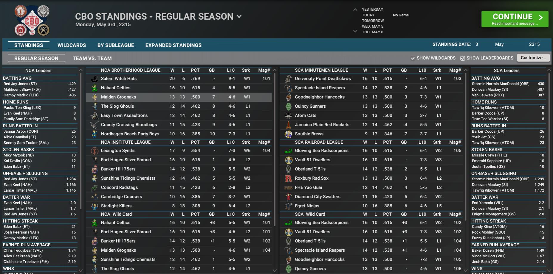 BNN Report News from the CBO, Minors, CCBL, and CYL by Nat Wright-Kawolski 19 April 2315 CBO Analysis We are 13 games into the 2315 CBO season with some teams already possessing huge leads over others. While it is never too late for a team to surge or falter, there are signs that some storylines are afoot. Two teams atop the CBO power rankings already have 10 victories, while another two already have more than 10 losses. Here are the Power Rankings: Here are the current team power rankings for Commonwealth Baseball Organization: Teams (Total Points, Tendency): 1) Fort Hagen Silver Shroud (141.4, ++) 2) Nahant Celtics (141.4, -) 3) Spectacle Island Reapers (137.6, ++) 4) Oberland T-51s (129.6, -) 5) Quincy Gunners (129.6, o) 6) Atom Cats (118.7, +) 7) Vault 81 Dwellers (115.7, ++) 8) Salem Witch Hats (114.7, ++) 9) Concord Radstags (111.7, --) 10) Glowing Sea Radscorpions (108.7, --) 11) Lexington Synths (100.8, ++) 12) Roxbury Rad Sox (99.8, --) 13) University Point Deathclaws (97.8, --) 14) FHE Yao Guai (87.2, ++) 15) The Slog Ghouls (87.2, ++) 16) Bunker Hill 75ers (84.2, ++) 17) Malden Grognaks (83.2, --) 18) Jamaica Plain Red Rockets (81.2, --) 19) Southie Brews (77.2, --) 20) Diamond City Swatters (70.3, +) 21) Egret Ninjas (68.3, --) 22) Easy Town Assaultrons (66.3, +) 23) Sunshine Tidings Chemists (64.3, -) 24) County Crossing Bloodbugs (63.3, --) 25) Goodneighbor Hancocks (62.3, --) 26) Cambridge Coursers (59.3, --) 27) Starlight Killers (20.7, +) 28) Nordhagen Beach Party Boys (2.9, -) Brotherhood League The largest league lead is here with the team tied for the CBO's top record, Nahant, holding a nine-game lead over the team with the CBO's worst record, Nordhagen Beach. Second through sixth include Salem at two back, The Slog and Malden at four back, and County Crossing and Easy Town at five back. We will have more about the Bloodbugs in the Noteworthy News section. But first, let's break down the disaster that has been the Nordhagen Beach regular season up to this point. First of all, the Party Boys looked as though they were back in the Nuka Cup Tournament, advancing all the way to the semifinals before succumbing to Atom, the eventual Nuka Cup champions. However, the regular season did not remain on that high. In fact, the Boys started 0-9 before a 9th-inning rally of five runs helped them to defeat the Ghouls, 8-5. Six of the 12 losses have been by two runs or fewer, including three extra-inning losses. There was also that 18-0 loss to the Celtics. Nordhagen Beach made a panic move, too, dumping SP Beachboy Nut and SS Pipe Wallcrawler for four Diamond City prospects and a 2nd-round pick. We feel as though more veterans will end up getting dumped for a complete rebuild. Institute League The other team tied atop the CBO's standings, Fort Hagen, also has a large lead over the last-place Starlight Killers, whose 0-9 start matched the Boys. Teams in the middle of the league are Concord at two back, Lexington at three back, Bunker Hill at four back, and Sunshine Tidings and Cambridge at five back. The Silver Shroud have been on fire to start the season with a combination of good hitting and pitching. The Shroud are 2nd in the BL in runs scored (69) and runs allowed (46). While their home run production (tied for 10th with nine) has not been great, Fort Hagen is 1st in batting average (.300). Most of that high average is thanks to the outstanding start for C Malificent Shaw (.556/1/12). Unfortunately for the Shroud, 3B Diamond Ball (.219/2/7) was injured by a frag grenade and will miss the rest of the regular season. On the mound, 34-year-old Nuke Laloosh (0-2, 6.97) has been the only pitcher struggling, while La'Ray Kalel (3-0, 2.82), Sarthis Idren (3-0, 1.16), and Clubhouse Treelover (2-1, 2.55) have been dominant. Minutemen League In the ML, there is a jumble so far with four games separating 1st from 7th. Quincy and Spectacle Island are atop the league, while Atom (one back), University Point (two back), Southie and Jamaica Plain (three back), and Goodneighbor (four back) round out the league standings. Atom, coming off the Nuka Cup Tournament championship, has won four straight (tied for 2nd best in the CBO behind the Reapers' seven-game streak) to plant themselves just behind the Gunners and Spectacle Island. Part of that success has been to the crazy hot start of C Tawfiq Kibowen (.359/8/19), the CBO's homers and RBI leader, among other statistics. The next closest in homers is five, shared by three players. RF Candy Kline (.292/4/11) has also contributed to the power of the SCA's second-best home run hitting team (18). Ace Doug Creep (3-0, 2.76) has paced the SCA's second-best starting rotation (3.18 ERA). Railroad League Always listed last, but hardly ever a weak league, the RL also has a four-game gap from 1st through 4th. Oberland is atop, followed by Glowing Sea and Vault 81 at one back, Roxburty at two back, FHE at three back, and Egret and Diamond City at four back. The Swatters have benefited from the acquisition of Nut, whose pitching has contributed to two of their five victories and a 5-5 mark since the trade. The T-51s may be atop the RL right now, but we are not expecting them to stay there once the Dwellers warm up. For now, their offense (80 runs, 2nd in SCA) has carried them. SS Stormin Normin MacDonald (.429/2/12) has powered the machine, along with veteran C Racky Westheim (,.342/1/5). Pitching has not been as good, not counting ace Ahsoka Tano (3-0, 2.25), who has carried the team 9th in runs allowed (61) and 11th in Starters ERA (5.20). The other three starters have to pitch better for the T-51s to maintain this win rate. CBO Standings CBO Players of the Week April 12 - His critics are starting to suggest that Nahant's Edward Cox doesn't have much left, but the 36-year-old Cox prefers not to think that way. He cooked up a remarkable week in the last seven days, topping it off with the Player of the Week Award in the North Charles Association. The veteran