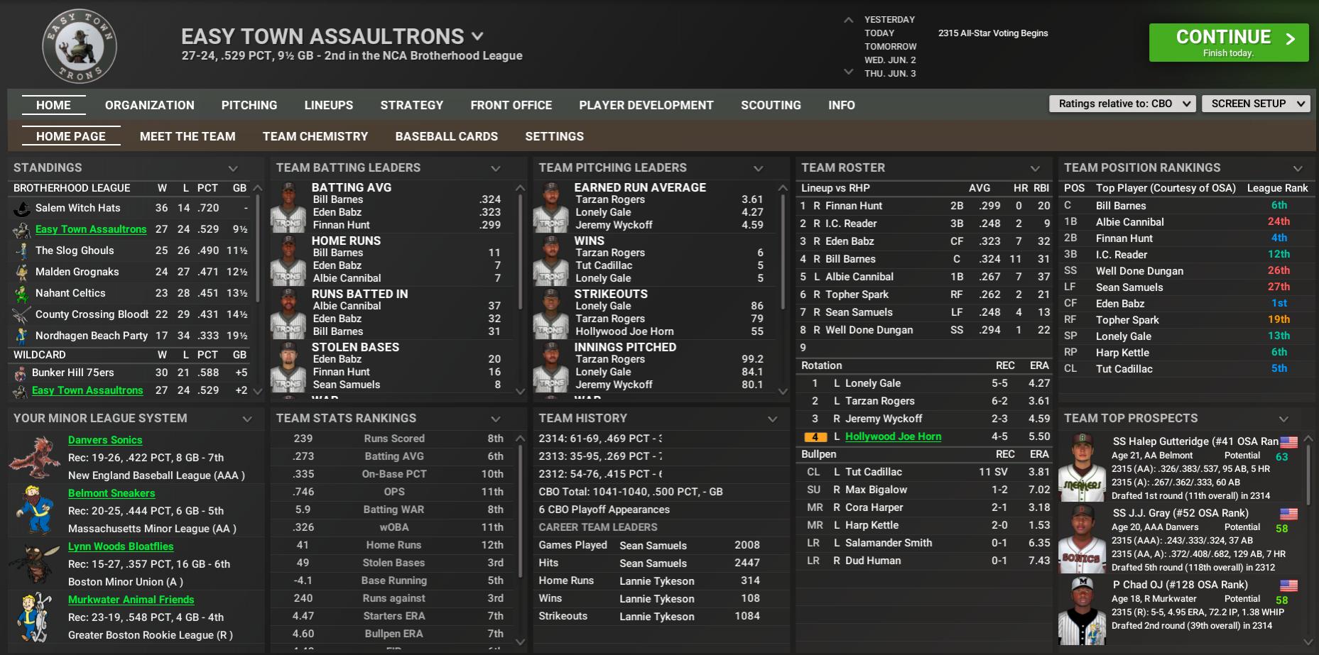 The day after posting this, my laptop finally went kaput, at least at the functional level. Among the slow downs, I think my graphics card died because OOTP and other games I tried instacrashed. I went ahead and saved files to an external hard drive, but something may have been awry. As of today, I have bought a PC, the first tower I have had in many years. As a constantly traveling person (and a person who lived on another continent for over a decade), I figured a gaming laptop was my best purchase. Well, they are way out of my price range, unless I want to play games only made before 2020. ![]() So, here I am. I came to the immediate realization, though, that I had to purchase OOTP 26 at full price since OOTP 25 is not available for purchase. Since I bought it directly from OOTP, it is just not an option. Damn. 25 was the one to buy on Steam! Oh well. Loaded it up and my league is loaded and converted from 25. Yay! However, it reverted back a week. Therefore, what I posted as the May 1, 2315, post never happened on my new iteration of the CBO. No problem, though. I will pretend it did. ![]() I have no idea if I am going to get the basketball game back. I think I will go ahead and download it and see if I can use a new license or email Gary Gorski if I cannot. If not, I'll maybe try to log in to my old laptop again, let it creep through the Finals, report on that, and then kill the basketball league. Anyway, I am now simming the CBO up until May 3 to write a report about the first month of the season.