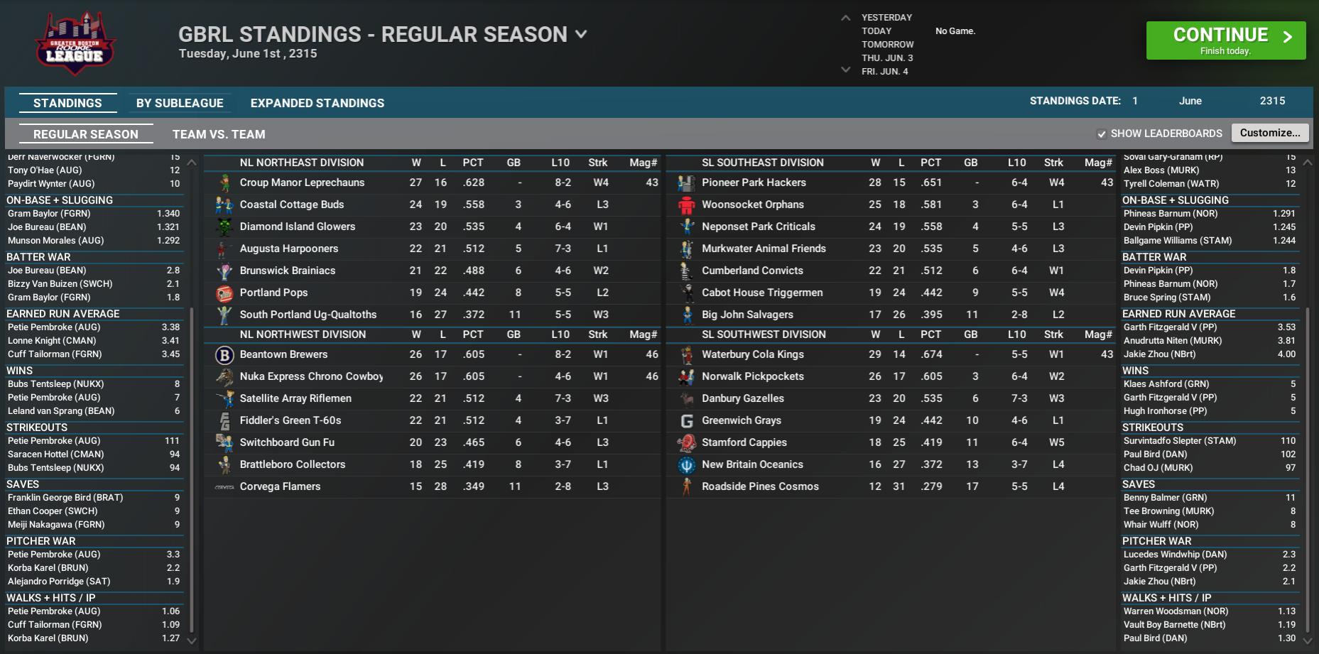 BNN Report News from the CBO, Minors, CCBL, CYL, and CBA by Nat Wright-Kawolski 1 June 2315 The June 1 Super Post CBO Top Performances We already reported about it yesterday in the Noteworthy News, but Oberland's Odd Todd Walker had a performance on May 28 that may already have clinched the season's top spot. With a game score of 135, Walker catapulted over Barker Cocoa's performance last month by 27(!) points. In a 14-4 victory at Nahant, Walker was 6 for 6 with two doubles, a triple, and two home runs, accounting for an amazing 16 total bases in hitting for the cycle. Walker added two runs and drove in nine RBI. His six hits and nine RBI each tied SCA records. The six hits was matched by three other people, with the last being Jamaica Plain's Sheedy Smith almost exactly a year before. The nine RBI was reached six other times, with Smith also being the last to achieve that feat. Fort Hagen's Andrew Nuka set the record of 11 in 2304. It may not be as impressive as the hitting performance, but Vault 81's Scruffy Taguchi had May's top pitching performance with a 92 score. On May 30, Taguchi pitched a complete-game four-hitter, striking out a season-tying high 13 batters in the Dwellers' 6-0 win at Starlight. Taguchi is 10th all-time with 187 victories after that dominating performance, tying Nervous Patron's April performance for the top performance this season. CBO Players of the Month NCA Hitter - To Hurr Lee Reyes, age is just a number. He may be 35 years old, but the Lexington Synths right fielder proved in May that he's still got what it takes to compete at an elite level. With a .398 average, 9 home runs, 23 RBIs, and 32 runs scored, Reyes had all the numbers that counted and has won the North Charles Association Batter of the Month award. So far this season, Reyes has gotten 69 hits in 192 at-bats for a .359 batting average with 15 home runs. His stats include 37 RBIs and 50 runs scored. He has played in 51 games. SCA Hitter - When Tawfiq Kibowen stepped up to the plate in May he did it with confidence, and today he was honored with the South Charles Association Batter of the Month award. The young Atom catcher posted a .337 batting average with 10 home runs, 27 RBIs and scored 26 runs. Kibowen also worked pitchers for 11 walks to post a .415 on-base percentage. In 42 games Kibowen is hitting .346 this season with 54 hits, 20 home runs, 50 RBIs, 20 walks, .420 OBP and has scored 41 runs. NCA Pitcher - There was little doubt around the North Charles Association that Paul Stains would be awarded Pitcher of the Month honors for May. Today, they made it official, naming the 26-year-old Salem Witch Hats starter the latest honoree. He thoroughly dominated the hitters who stood in against him, holding them to a .205 batting average while fashioning a 2.55 ERA in 7 starts. His record for the month was 5-2 in 60 innings of work. His record for the year is 8-4 in 12 starts and Stains has a 3.14 ERA. SCA Pitcher - Doug Creep of Atom had an excellent May with a 5-1 record and was selected as the Pitcher of the Month in the South Charles Association. He finished the month with a 2.31 ERA while piling up 42 strikeouts in 58.1 innings and holding opposing hitters to a .234 batting average. In 13 starts this season, Creep has recorded 8 wins and absorbed 3 losses. He has pitched 100 innings, allowed 94 hits, struck out 81 and has a 3.51 ERA. NCA Rookie - Waterbug Grant's eyes seem to light up whenever he sees the baseball. The young Nordhagen Beach left fielder has been hitting everything in sight for the better part of a month. In May he was voted the Rookie of the Month. During the month he hit .268 with 4 doubles, no triples and 9 home runs. Grant also scored 18 times and drove in 19 runs. For the season, Grant is batting .270 with 38 hits and 10 home runs. He has scored 24 times and batted in 25. SCA Rookie - University Point's Pop Dylan collected 28 hits to snare the South Charles Association Rookie of the Month for May. He batted .311 with 6 home runs, 24 RBIs and 16 runs scored. The 21-year-old is barely old enough to shave, but he could definitely contend for Rookie of the Year if he keeps up this pace. In 43 games this season, Dylan has compiled a .301 batting average with 41 hits and 8 home runs. He has also scored 23 times and knocked in 35 runs. NEBL Analysis The NEBL is 46 games into the 2315 season, and there has been a lot of buzz on a recent increase in overall talent at this level. Part of the criticism was that it was overloaded with former CBO players no longer talented enough for the Big League squad. Now, an eruption of younger talent is making the NEBL the place to play. Current division leaders are the Manchester Granites, Abernathy Adamantium, a tie between the Braintree Robobrains and Sandwich Bay Snakes, and a three-way tie among the Providence Warlocks, Wellesley Wanderers, and Worcester Cannons. NEBL Players of the Month PL Hitter - In May, Ryoo Ree was the toughest out in the Patriot League and that is the prime reason he was voted the Batter of the Month. The Greenfield shortstop rapped out 39 hits in 90 at-bats for a .433 batting average, hit 3 home runs, drove in 17 runs and scored 24 times. Hitting .385 to date, Ree has 4 home runs and 20 RBIs. He has played in 33 games. YL Hitter - Worcester Cannons fans believe they've got a talented young star in Barbarus Bailey. He did nothing to dissuade that notion in May, as he hit .412 with 6 home runs, 20 RBIs and 16 runs scored. The end result was the third baseman being named the Yankee League Batter of the Month. In 41 games this season, Bailey is batting .367 with 54 hits and 10 home runs. He has scored 25 runs and driven in 34. PL Pitcher - An outstanding 5-0 record in May earned Cohort Williams the Pitcher of the Month Award in the Patriot League. When his name was penciled in to start on the Greenfield lineup card, it meant trouble for opposing teams. In 38 innings of work, Williams limited opposing batters to 29 bas