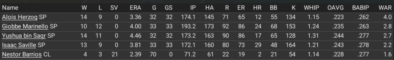 Overall record and position: 85-77 (7th). A 7th position finish in the European division for two years in a row is not bad, and we did improve our record from last year by two wins. This was also the first season we’ve exceeded our expected record (by 2). 2059 also saw our highest attendance. The bar for the playoffs in the European, Africa and Asia conference ended up being a high 92 wins, so we were some way off that in the end despite a very promising start to the season. Overall our pitching far outperformed our hitting. We were generally in the top 10 teams in the conference (that’s 72 teams) for all defensive stats and were first in opponents average (.243). On the offensive side we were hovering around the 60th mark in the conference on most stats, including 66th in batting average and 63rd in runs scored. Position Players Top 5 WAR and awards ![]() Adam Koehler easily takes the team’s Golden Glove award, with superb performances as catcher throughout the season. Impressively, he was also second in the running for the Silver Slugger award, but that ended up going to Sergio Rutz, whose OPS was just slightly higher over the season due to more doubles and triples. Both were tied with 27 home runs, and now lie joint 6th in the home runs/season table, some way behind Willie Perez with 50 last year! While we’re talking about our hero Willie, you’ll be interested to know he hit 42 dingers for the St Louis Flycatchers this year, in another great season. Racking up 3.1 WAR at the age of 38. Pitching Top 5 WAR and awards ![]() Herzog somewhat ran away with the Starter of the Year award, racking up a solid 4 WAR with an ERA of 3.36, the second lowest ERA posted by a Hare, below only his own record set last year. Bin Saqr and Marinello also had decent seasons, with the former still leading in most stats for the team from a career perspective, having played for them in every year of their existence so far. Reliever of the Year has to go to Nestor Barrios, who racked up a massive 21 saves as our closer, with an ERA of 2.39 as he was consistently relied upon in high leverage situations. Rey Ochoa also deserves a mention, who was practically unhittable before he got injured, with 18 saves in only 36 starts, and an ERA of 1.89. Eskinder Ali also deserves a mention, as despite a lengthy injury, he managed to put together a total of 3.1 WAR (2.0 as a position player, 1.1 as a pitcher) in his rookie season, easily winning the team’s Rookie of the Year. We’re all holding our breath hoping he signs an extension. The MVP award has to go to Adam Koehler this season, who was super both offensively and defensively this season. From a WAR perspective it was the second best season ever by a Hare, behind only Abdul-Karim bin Jameel’s incredible 2057 all-star season, where he had a WAR of 5.9. He’s also moved up to 3rd in career home runs for the new team, with 62 Other records worth mentioning Isaac Saville beat both the the team’s single-season strikeout (164) and home runs allowed (27) records this year. So he certainly made his mark… Nestor Barrios broke the team’s games pitched record with 70, as they turned to him again and again from the bullpen.
