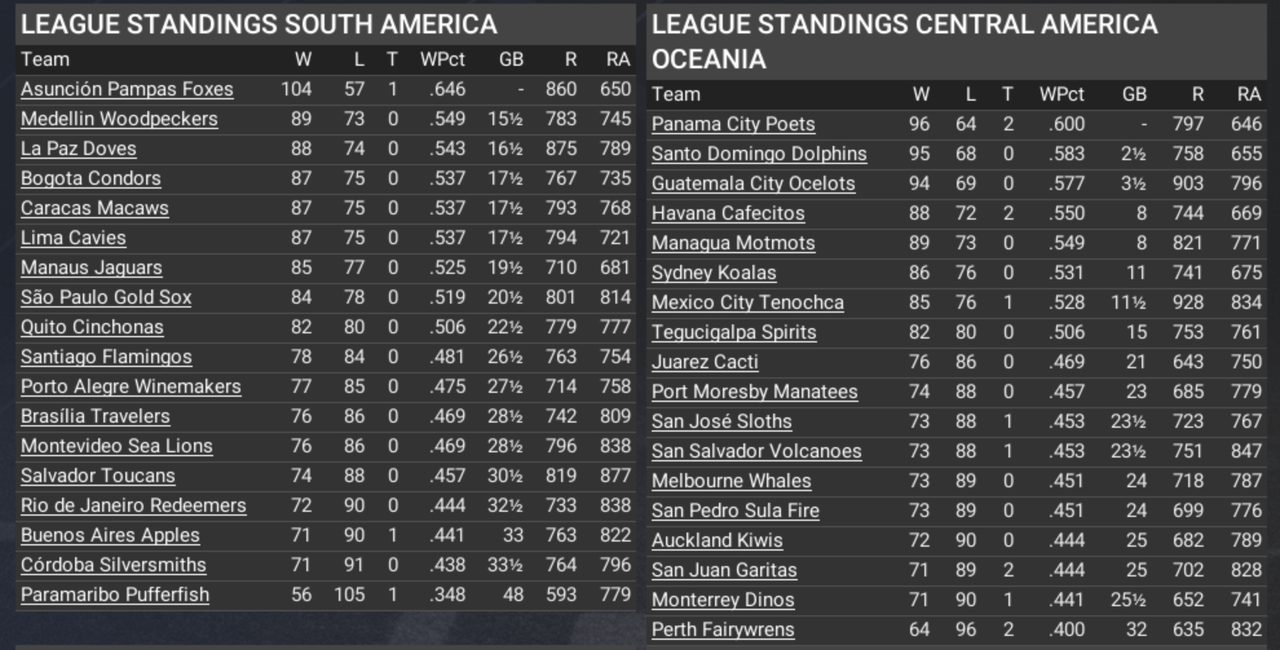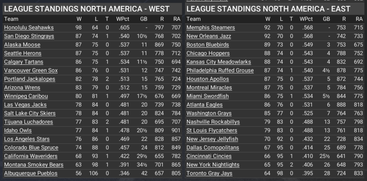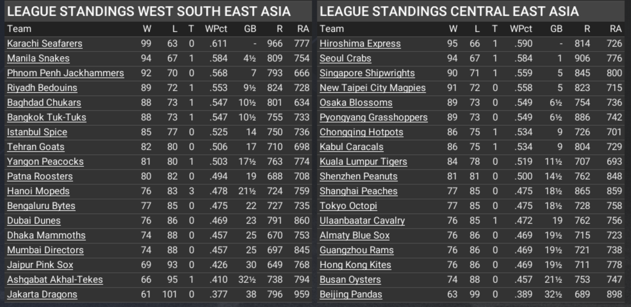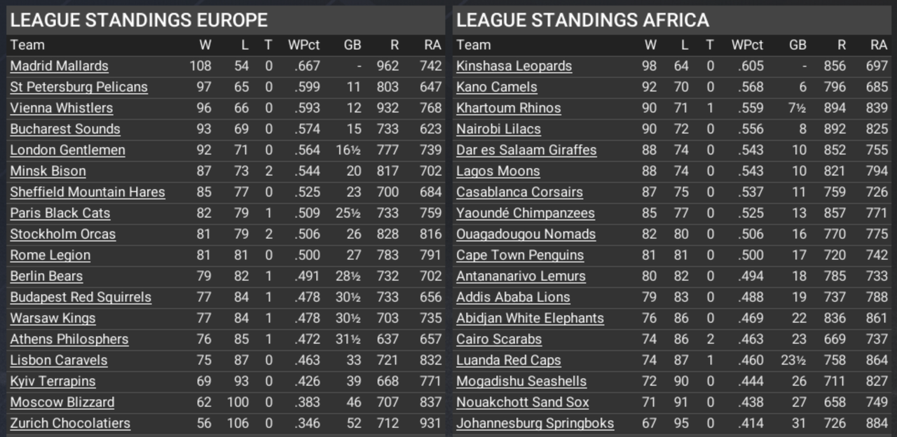 As my second favourite team, the Havana Cafecitos, have made it to the playoffs, we'll be following them specifically, while also looking at the whole playoff bracket in the next post. But before we do that, here's the standings at the end of the season. ![]() ![]() ![]()