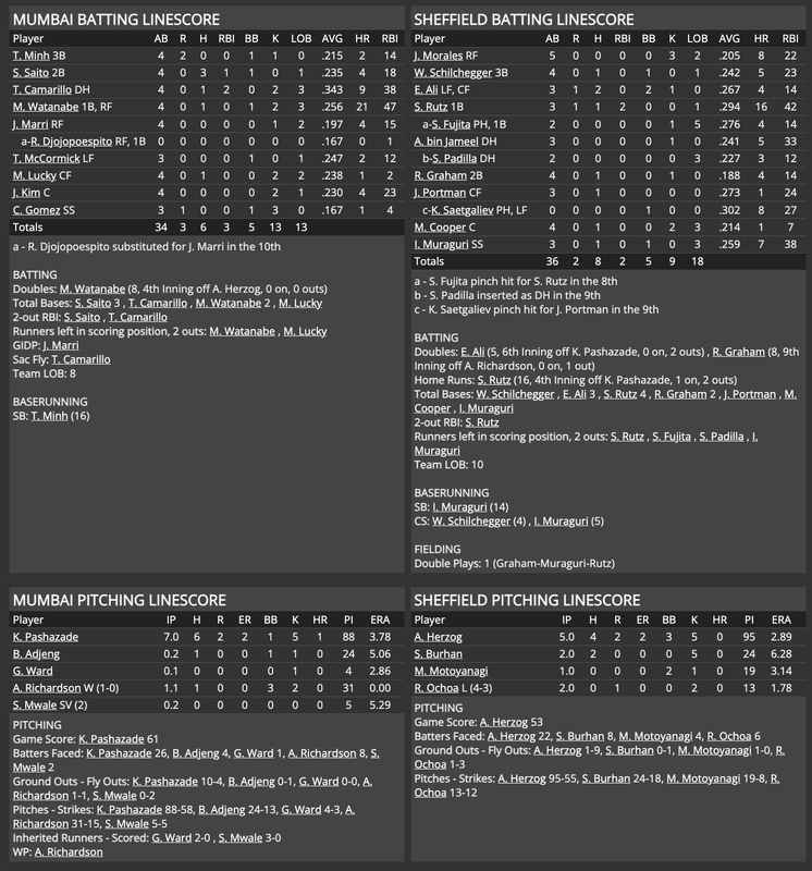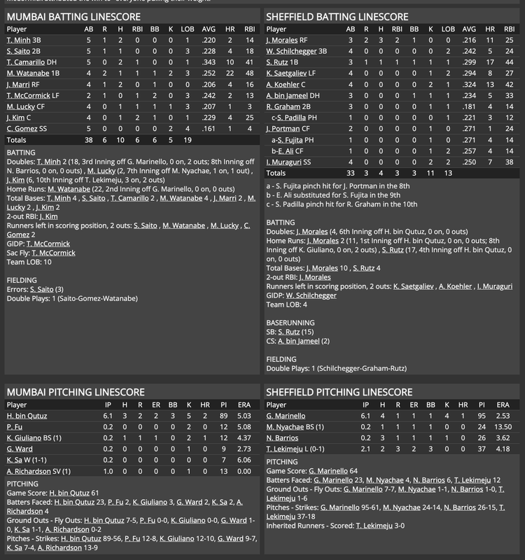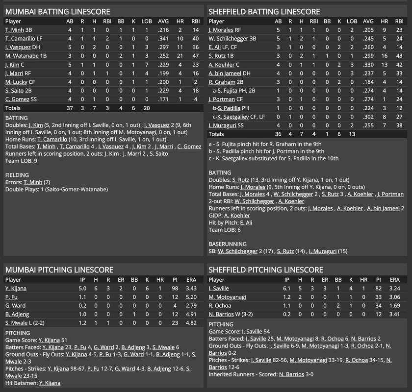 ![]() Team Profile: Mumbai Directors Banners: West & South Asia Divisional Champions (2050, 2051) Playoff appearances: 5 Last season: 68-94 (16th) This season: 37-32 Having made the playoffs in each of the first 5 years of the WBL, the Directors haven’t appeared since, though they’re having they’re on course for their best finish for numerous years as they sit in 5th place. Game 1 SP: Alois Herzog The Mumbai Directors defeated the Sheffield Mountain Hares, 3-2, in a tight 10 innings at Kingfisher Park. Mumbai pitcher Khachatur Pashazade had a standout performance. The Azeri power pitcher went 7 innings, giving up 6 hits and 2 runs. Tony Camarillo was the hero for the Directors, contributing a run-scoring sacrifice fly in the top of the tenth inning to put Mumbai up, 3-2. Both of Sheffield’s runs came from a towering Sergio Rutz home run in the 4th. Herzog gave up 2 runs in 5 innings in a solid start. Player of the game: Khachatur Pashazade ![]() Game 2 SP: Isaac Saville Sheffield earn a hard-fought 4-3 win despite only getting 7 hits. Isaac Saville put in a solid start, giving up 3 runs in 6.1 innings, while Motoyanagi, Ochoa and Barrios shut the Directors out for the remainder of the game. Jesus Morales got a crucial home run in the 5th, but it was Schilchegger’s run scoring single in the tenth that won the Hares the game and got the home crowd dancing. Player of the game: Isaac Saville ![]() Game 3 SP: Giobbe Marinello The Hares seem to be having a lot of extra-innings games this year, and unfortunately this one ended in a 6-3 loss, as the Directors racked up three runs in the 10th inning to take the series, all started by a Tim McCormick sacrifice fly which put them up 4-3. Morales hit his second and third home run is 2 games, going 3 for 3, while Rutz increased his season home-run tally to 17. Marinello was superb on the mound too, going 6.1 innings and giving up just 1 run - but it all wasn’t enough, as the Hares dropped to 44-28, remaining in 3rd in the Division. Player of the game: Jesus Morales