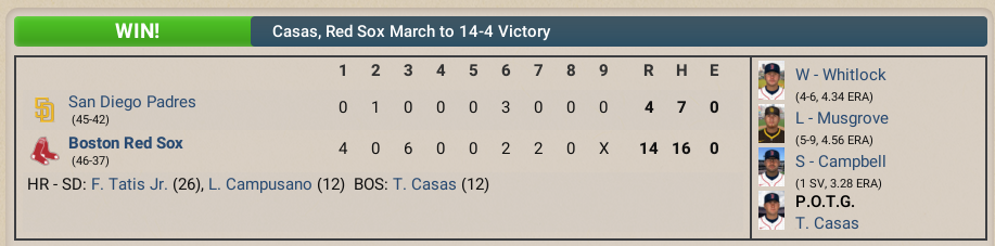 Garrett Whitlock (4-6) picked up the win but again had a shaky performance in which he allowed 4 earned runs on 7 hits and 2 walks while striking out 6 in 6 innings of play; Game Score 46. Isiah Campbell (SV 1) picked up the save for his 3 innings of scoreless relief work. I am not very confident in games Whitlock starts and have started to consider moving him to the bullpen and bring Pivetta back into the rotation. The Red Sox offense was firing well today, led by Tristan Casas (1 for 2, Homerun, 4 Runs, 2 RBI, 2 Walks, Hit-by-Pitch), Jarren Duran (3 for 4, 3 Doubles, 3 Runs, Walk), Rafael Devers (2 for 5, Double, Triple, 3 RBI), Marcelo Meyer (2 for 5, Double, Run, 4 RBI), and Masataka Yoshida (3 for 4, Double, 3 Runs, RBI, Walk). The Padres turned to Joe Musgrove (5-9) for the start, but he lasted just 2 innings after serving up 7 earned runs on 6 hits, 4 walks, and a hit batsman; Game Score 10. The combined relief work of Wandy Peralta (3 earned runs on 3 hits and 1 walk) and Stephen Kolek (4 earned runs on 6 hits and 1 walk) were ineffective. Former Red Sox Chris Martin pitched a scoreless final inning. At the plate, Fernando Tatis Jr. (1 for 4, Homerun, Run, RBI), Luis Campusano (1 for 4, Homerun, Run, RBI), and Jake Croenworth (2 for 4, 2 RBI, Stolen Base) had a solid day. Player of the Game: Tristan Casas (Season: #3) AL East Standings: 1st Place, 1 Game Lead