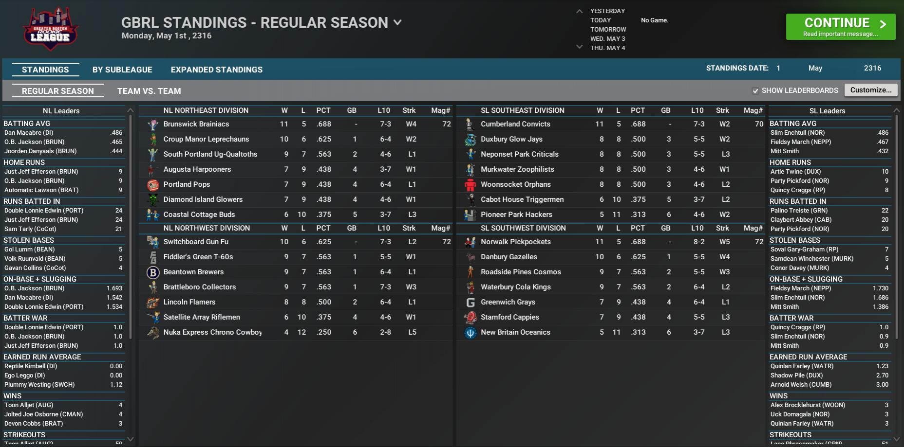 BNN Report News from the CBO, Minors, CCBL, and CYL by Nat Wright-Kawolski 8 May 2316 Winning Balance? 16 Teams Above .500 We have just completed the four-week mark of the 2316 CBO season, and there is a bizarre arrangement of teams in the standings. Sixteen of the CBO's 28 teams currently hold a record of at least two games over .500. There is also a 4-22 team, and it is not the team that started 0-13. Here are the current team power rankings for the Commonwealth Baseball Organization: Teams (Total Points, Tendency): 1) Bunker Hill 75ers (121.7, ++) 2) Glowing Sea Radscorpions (118.7, o) 3) Atom Cats (117.0, ++) 4) University Point Deathclaws (114.7, o) 5) Vault 81 Dwellers (111.7, o) 6) Cambridge Coursers (107.9, ++) 7) Malden Grognaks (107.7, --) 8) Diamond City Swatters (105.7, --) 9) Easy Town Assaultrons (104.9, -) 10) Fort Hagen Silver Shroud (104.9, ++) 11) Spectacle Island Reapers (100.9, -) 12) Lexington Synths (100.8, ++) 13) Concord Radstags (99.9, -) 14) Goodneighbor Hancocks (97.8, +) 15) Nahant Celtics (97.8, --) 16) Quincy Gunners (95.8, -) 17) County Crossing Bloodbugs (91.2, ++) 18) Oberland T-51s (89.0, -) 19) Nordhagen Beach Party Boys (84.2, -) 20) The Slog Ghouls (82.2, o) 21) Roxbury Rad Sox (81.1, -) 22) FHE Yao Guai (73.0, ++) 23) Salem Witch Hats (70.3, -) 24) Egret Ninjas (64.3, ++) 25) Southie Brews (57.3, --) 26) Jamaica Plain Red Rockets (52.4, o) 27) Sunshine Tidings Chemists (52.4, --) 28) Starlight Killers (7.7, o) Brotherhood League The BL is the tightest league in the CBO with the 1st place team, Malden, leading the 7th place team, Salem, by only six games. No team has had an outstanding or disappointing 10-game stretch, with County Crossing currently holding the best mark at 7-3 and The Slog the worst stretch at 4-6. In order of the league: the Grognaks, Easy Town, Nahant, a tie among Nordhagen Beach, the Slog, and the Bloodbugs for 4th place, and the Witch Hats in 7th. The Hats did not expect to be in 7th place. In fact, with five straight playoff appearances, including the Brotherhood League crown in 2315, Salem expects to be at the top. One problem is that two star players, 1B Brian DeLong and 2B Seemly Sam Tucker, are out with injuries and will not be back before June. Salem is 10th in runs scored with CF Andy Dogleash (.375/2/12) being the only player on offense truly standing out. On the mound, the Witch Hats have allowed 125 runs (11th in NCA). Ace SP Paul Stains (2-3, 3.23) is pitching well but not getting run support. SP Gary Harvard (4-1, 2.87) has pitched well and has had run support. CL Deor Woodcutter (4 SV, 2.63) is doing OK, but the Bullpen ERA (3.94) is 11th in the NCA. Institute League Five teams in the Institute League are in it, while the last two, especially the last one, should consider blowing it all up. Bunker Hill is comfortably at the top with the NCA's best record and a tie with University Point and Glowing Sea for the CBO's best record. Three teams--Fort Hagen, Concord, and Cambridge--are tied for 2nd at two games back. Lexington is the final team above .500, while Sunshine Tidings at 8-18 and Starlight at 4-22 are out of the running in 2316. The Killers really need to blow it up. On a 10-game losing streak and with a .154 clip, Starlight is on pace to blow away Cambridge's record 30-100 (.231) season in 2310. At this pace, the Killers would be about 21-109 at season's end. The most apparent struggle is that the entire team cannot hit. At 14th in the NCA in most offensive categories, including runs scored (51 or 1.96/game) and average (,222). 2B King Hippo (.216/3/9) is the only qualifying player batting over .200. 1B Jordan Young (.339/4/10) has had more time recently and should play every day. On the mound, Starlight is 12th in runs allowed (126). Ace Mercury Morris (1-2, 2.23) and fourth pitcher Sam Molina (1-4, 2.76) have pitched well but need run support to win games. Minutemen League We already mentioned that the Deathclaws are tied for the CBO's best record, giving them a 1.5-game lead over 2nd-place Atom. Spectacle Island, Goodneighbor, and Quincy are all above .500. Southie is in 6th, and Jamaica Plain (8-5 in the past two weeks) has recovered but still maintains the SCA's worst record. For the Claws, the beginning of their demise has been paused. While statistically speaking, they are not dominating, the Deathclaws are showing strength across all aspects of their team. On offense, University Point is 3rd in scoring, thanks in part to being tied for 2nd in home runs (22). No player is killing it in average, with SS Rock Rampage (.294/3/15) leading in average and tied for 2nd in home runs. Both CF Ziggy Stardust and LF Pop Dylan are on the injury list, taking away two good bats. 1B Barker Cocoa (.258/3/13) has seen a drop in average but is still a leader on offense. For pitching, the Claws are 5th in runs allowed (95). Digger Vadim (1-2, 3.70) and Alex Alexson (2-0, 2.31) have been the two best starters. CL Swampy Tamraguri (5 SV, 1.08) has been outstanding. Railroad League There are only three teams above .500 in the Railroad League, but those three teams are in a raging battle. The Radscorpions are tied with the Claws for the top record in the SCA (and CBO). Vault 81 and Diamond City are just a game back. Oberland is at .500, while all of Roxbury, FHE, and Egret have a lot of work to do to get in the playoff discussion. Glowing Sea may be ready after making the playoffs two of the past three seasons. The Scorpions are currently in 1st place thanks in large part to good pitching, currently 2nd in runs allowed (85) and 1st in Starters ERA (2.63). All four starters have a sub-4.00 ERA with Alex Language (2-1, 1.13) and Hot Lips Houlihan (3-2, 2.55) have been the best. The bullpen has not been great with CL Mar Gotfenning (9 SV, 6.43) struggling. RP Pink Floyd (3-0, 0.57) has been the best there. Hitting is not as good and will need to get much better for a playoff run. The Scorpions are 12th in runs scored (91) and hav