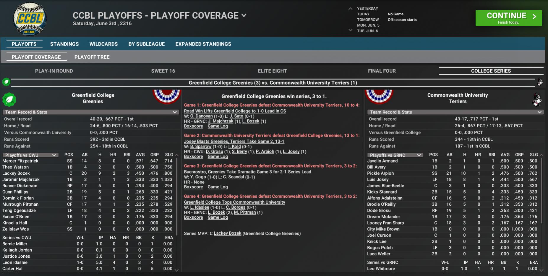 BNN Report News from the CBO, Minors, CCBL, and CYL by Nat Wright-Kawolski 4 June 2316 Greenfield College Claims CCBL Title The Greenfield College Greenies were good enough to get past the Commonwealth University Terriers at George Grennell Jr. Stadium today and secure the 1st championship in franchise history. "When you wear Greenies on your shirt, you're good at something," Greenfield College skipper Slick Ricky Silva told the press. Greenies catcher Lackey Bozek was named MVP of the series after he went .450 with 2 home runs and 3 runs batted in. "It feels totally incredible," Bozek said. "I could live to 1,000 years old and I'd remember this moment." The new champions capped off a great season with a 3-2 victory over the Terriers to win the College Series 3-1. Commonwealth University was playing in its third College Series in three years. The Terriers won the title in 2314.