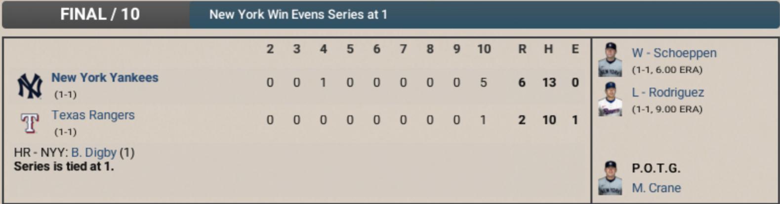 "THEEEEEEEEEEEE YANKEES WIN!!! ... THEEEEEEEEEEEE YANKEES... WIN!" Oh, what a day, what a moment—what a series! From the heart of Texas, at Globe Life Field, the Bronx Bombers come through in the clutch, shutting out the Rangers 4-0 in a masterful Game 3 to punch their ticket to the Division Series! Justin Bowles—oh my, Justin-time Bowles! The right-hander was cool as the other side of the pillow tonight! Seven dazzling innings, five hits, no runs, not a single strikeout needed! Just a steady diet of ground balls and outs! You want postseason poise? You just saw it! And now... it’s time for a MARK CRANE MOONSHOT! It’s a high fly to center... KISS IT GOODBYE!!! “Crane-train leaving the station!” A two-run blast in the top of the first to set the tone. That’s Crane’s first of the postseason—and boy, it couldn’t have come at a better time! And how about the MVP of the series—Ben Digby! Oh, Benjamin... my Ben! He’s hittin’ .417 in the series, driving in runs, scoring ‘em, flashing the leather at first base. Folks, that’s a gamer. That’s a Yankee. Now let’s give some love to the defense—three double plays turned! Smooth as Sinatra, baby! Schultz to Ruiz to Digby? That’s a tune we’ll play all October long! Texas? They gave it all they had. Tucker pitched his heart out—eight innings, one big mistake to Crane. But the Yanks? Too strong. Too tough. Too ready. And now? It’s on to Baltimore! The Yankees and the Orioles—two titans of the American League East set to clash in the Division Series. You want drama? You want history? You got it. From Globe Life to the Bronx... The Yankees are movin’ on! And so, once again... "THEEEEEEEEEEEE YANKEES WIN!" 🎙️✨ |