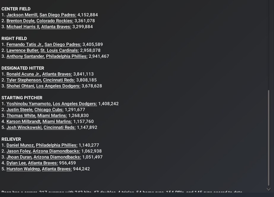 It is the first All-Star game for both, who also are full-time starters for the first time this season. Baro, 23, will be the starting second baseman for the NL winning the fan vote. In 88 games/86 starts, Baro has hit .286 with 10 home runs 40 RBIs and 47 runs scored. The 26-year-old Crooks has played in 67 games/66 starts during which he has hit .278 with 10 home runs, 27 RBIs and 31 runs scored. Mathews has gone 8-3 in 19 starts with a 3.00 ERA. The 27-year-old has worked 111.0 innings, striking out 109 and posting a 1.23 WHIP. Last edited by rink23; 08-09-2025 at 06:04 AM. |