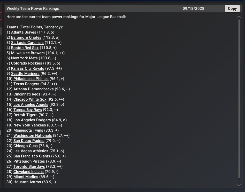 At 93-52, the Braves own the best record in MLB and in their division sit nine games ahead of the Washington Nationals in the National League East Division with 17 games remaining in the season. The second-best record in the NL belongs to the NL West leading Arizona Diamondbacks at 85-60. The Baltimore Orioles have the best record in the American League at 90-56. This is the 12th consecutive season Atlanta has reached the postseason. The Braves last World Series appearance came in 2026, when they lost to the Cleveland Indians. Last edited by rink23; 08-17-2025 at 04:26 AM. |