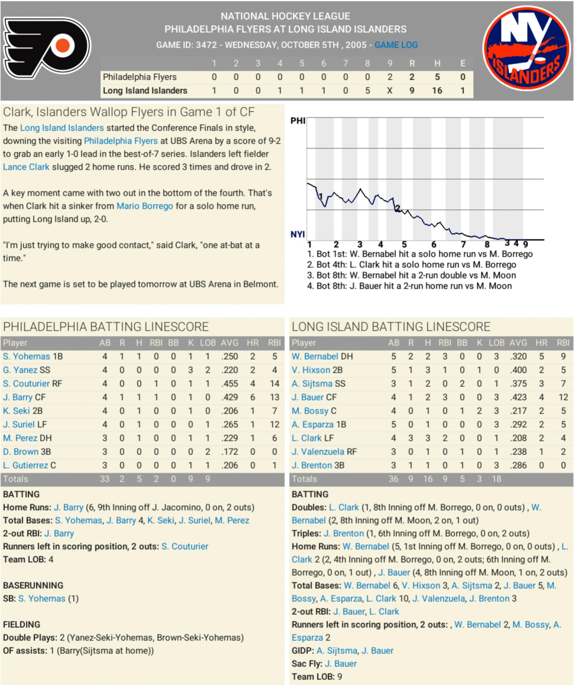 Gio: Yeah Booms, and it started out fine, right? Flyers put up four in the second inning, you’re thinking, “Hey, maybe they got somethin’ goin’.” Barry hits a homer, Gutierrez — the catcher, not the pitcher — hits a three-run bomb. They’re up 4–2. And then, ahhh… it all falls apart. Boomer: Completely fell apart. Vinny Hixson, three-run shot in the fourth, Adrie Sijtsma — and I love this kid, by the way, I love the way he plays — goes deep later, drives in three, scores three. He’s just everywhere. Gio: Yeah, and Pastor, the Islanders starter, he wasn’t even that sharp. Gives up four runs in the second inning. But the Phillies — excuse me, Flyers — couldn’t touch him after that. He ends up going seven-plus innings, keeps his team in it, and then the Islanders offense just explodes. Boomer: Explodes. Bossy with four hits, Bauer drives in two, Valenzuela has three hits, Bernabel steals a couple bases… they’re running wild. Sixteen runs on sixteen hits. It was a laugher by the fifth inning. Gio: And meanwhile, the Phillies — the Flyers, whatever — five hits total. That’s it. Nothing after the second inning. Completely dead. You can’t win playoff games like that. Boomer: And you know what this sets up now, Gio? Islanders in complete control. They go to Philly up 2–0, Wells Fargo Center’s gonna be loud, sure, but the Flyers better figure it out or this thing’s gonna be over quick. Gio: Yeah, and I just don’t see how they stop this lineup. I mean, Sijtsma, Bauer, Bossy, Valenzuela — it’s relentless. You can pitch around one guy, but the next guy’s gonna burn you. Boomer: Islanders win 16–4, total domination. Player of the game: Adrie Sijtsma. Flyers on the ropes. Gio: Flat out ugly. |