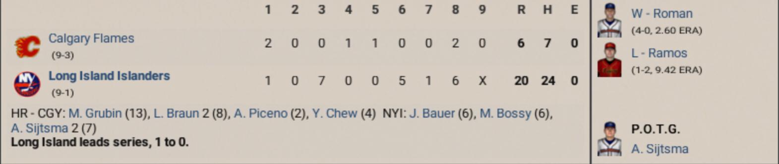 Tiki: Evan, it was embarrassing. This was Game 3 of the Conference Finals! You’re at home in Philly, series on the line, and you get blown out like that? Bernabel was unstoppable — 4-for-6, homer, triple, seven RBI. Seven! He looked like Barry Bonds out there. Evan: And it wasn’t just Bernabel. Bossy with two bombs, Valenzuela goes deep, Esparza with a two-run shot, Clark and de la Cerda each four hits… the whole lineup just destroyed Philly pitching. Twenty-seven hits! Tiki: Meanwhile, the Flyers? Three hits. That’s it. You can’t win anything when you’ve got three hits in your own building. Couturier had a triple, Suriel drove in the lone run, and that was all she wrote. Evan: And let’s not forget van Laar. Eight and two-thirds, only one run, didn’t even blink with that giant lead. He kept it professional. Tiki: Yeah, compare that to the Flyers’ staff — Madrid, Sanchez, Cobos, Zhu… everybody who came in just poured gasoline on the fire. That bullpen ERA is comical. Evan: And now, Islanders are up 3–0 in the series. This thing is over. I don’t care what anybody says — Flyers aren’t coming back from down 3–0 after losing 23–1. Tiki: No chance. Their manager called it a “punch in the kisser.” I’d call it a knockout punch. Islanders are going to the Finals. Evan: Islanders 23, Flyers 1. Bernabel the star, but honestly, the whole team was the star. This was historic. |