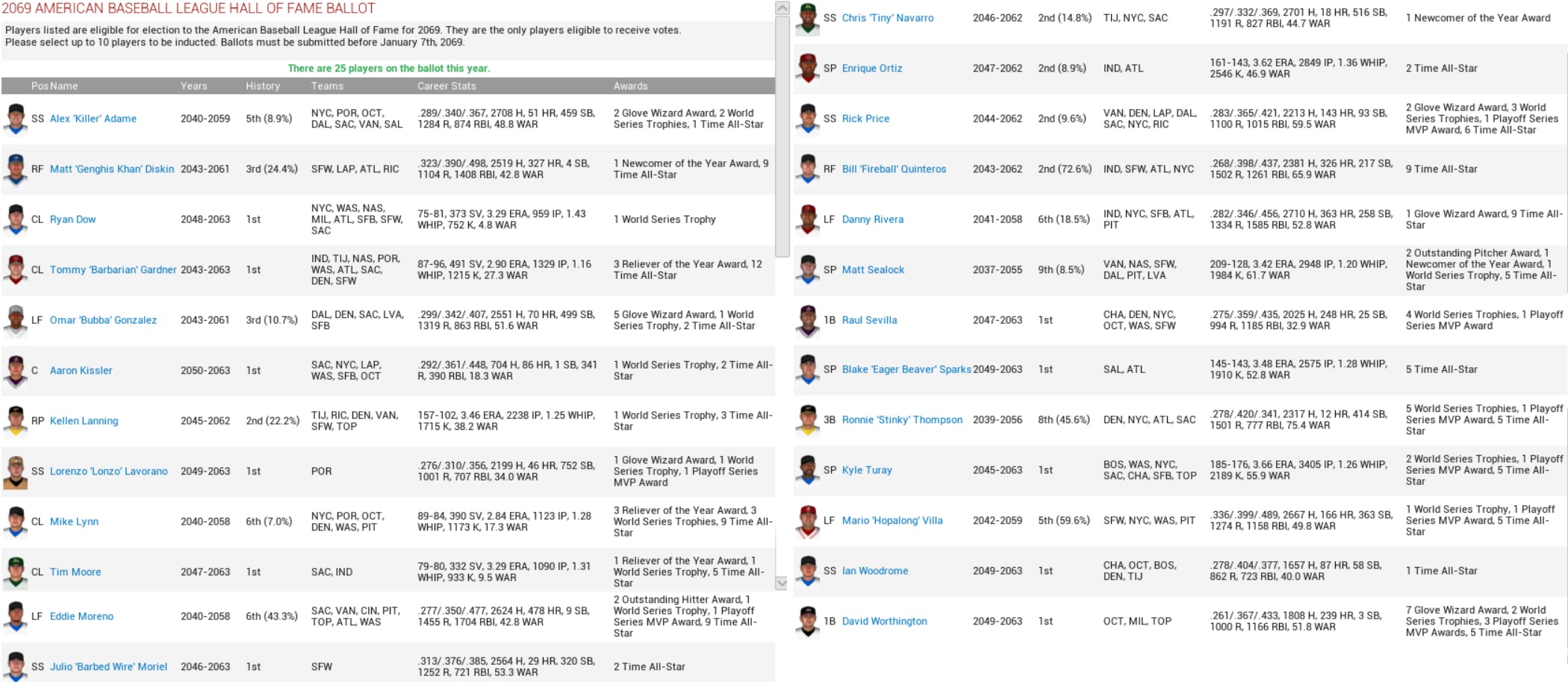 Jesse Dover was signed to a 3-year contract worth $3.8M. He would make $1M in 2069, and then $1.4M in the two years after that. Pedro Valentin signed a flat 4-year deal worth $9.2M, or $2.3M annually. That should sort out the backend of the pen for a while… The odd trade offer for Jimmy Wharton aside, that was really all that was going on in Portland before the arbitration hearings, which we did not have to attend since both Alex Dominguez and Eddy Ramirez declined, thus qualifying the Raccoons for draft pick compensation, and we had resigned or non-tendered every other player that was eligible. +++ November 13 – Charlotte brings in 3B/2B Paul Weber (.253, 36 HR, 152 RBI) in a trade with the Indians, who receive right-hander Kao-kan Ngui (10-13, 4.21 ERA). November 13 – The Miners acquire OF Norm Chapman (.273, 7 HR, 67 RBI) from the Gold Sox in exchange for SS/2B Ross Dunlop (.307, 5 HR, 23 RBI) and #22 prospect CL Kelvin Castillo. November 13 – The Crusaders trade SS/2B/LF Scott Masterson (.204, 11 HR, 46 RBI) to the Indians for C John Edwards (.287, 5 HR, 40 RBI) and a prospect. +++ 2068 ABL AWARDS Players of the Year: DAL CF Tyler Wharton (.352, 40 HR, 153 RBI) and MIL 1B/RF/LF Cesar Ramirez (.362, 26 HR, 139 RBI) Pitchers of the Year: PIT SP Steven Fenstermacher (21-6, 3.08 ERA) and OCT SP Ken Nielsen (20-7, 2.43 ERA) Rookies of the Year: CIN OF Anthony Schneider (.278, 11 HR, 83 RBI) and BOS LF/RF/1B Manuel Garcia (.263, 22 HR, 104 RBI) Relievers of the Year: SFW MR Neil Mongillo (8-1, 1.58 ERA, 3 SV) and OCT CL Erik Swain (6-4, 2.12 ERA, 39 SV) Platinum Sticks (FL): P SAL Gary Peoples – C PIT Nick Dingman – 1B PIT Mike White – 2B RIC Matthew Selep – 3B SAC J.P. Gallo – SS PIT Robert Ortiz – LF LAP John Miller – CF DAL Tyler Wharton – RF NAS Austin Gordon Platinum Sticks (CL): P TIJ Miguel Lopez – C BOS Jorge Arviso – 1B MIL Cesar Ramirez – 2B OCT Carlos Gutierrez – 3B LVA Victor Morales – SS OCT Jose Palominos – LF MIL Carlos Dominguez – CF BOS Eddie Marcotte – RF IND Tony Torres Gold Gloves (FL): P PIT Jesus Ordonez – C CIN Ryan Marty – 1B SFW Jared Allen – 2B PIT Roland Hood – 3B SFW Beau Metz – SS SFW Tomas Guangorena – LF DEN Norm Chapman – CF DAL Tyler Wharton – RF RIC Willie Ospina Gold Gloves (CL): P CHA Edgar Mauricio – C TIJ Mike Brann – 1B MIL Cesar Ramirez – 2B OCT Carlos Gutierrez – 3B MIL Rafael Murcia – SS CHA Trent Taylor – LF BOS Steve Humphries – CF NYC Bryant Box – RF SFB Jake Ward Pedro Valentin came second in the Reliever of the Year contest in the CL. Nick Walla didn’t even make the top three for pitchers. +++ Well, well, look who’s a free agent….