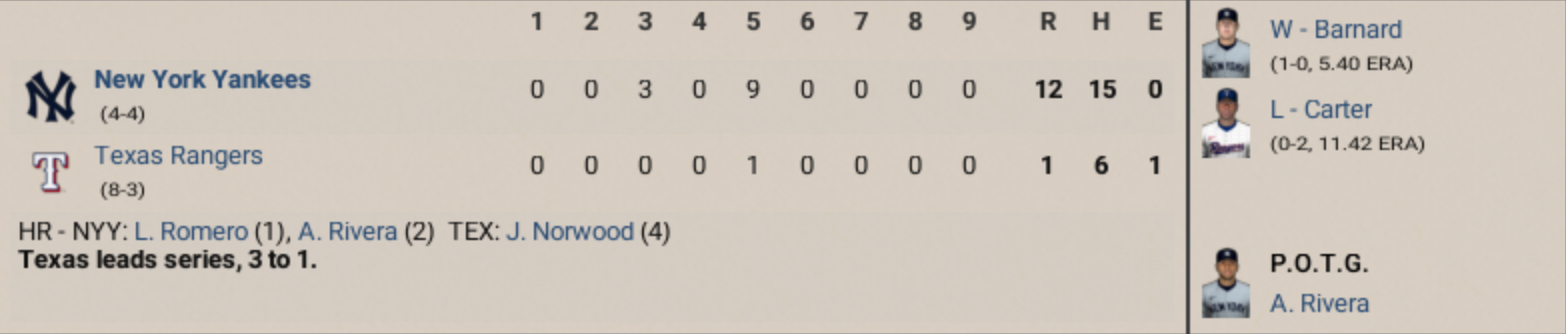 ALEJANDRO “THE HAMMER” RIVERA, DUUUUDE — that guy was swingin’ the bat like a steel chair, JACK! Three hits, a homer, a double, three RBIs, three runs — he was tearin’ it up like Hulkamania in the ‘80s, brother! Every time he stepped in the box, the Rangers’ pitchers were lookin’ like they’d just taken a leg drop to the soul, man! Then you had Leo Romero comin’ in hot with a big-time two-run blast in the fifth, brother! The Yankees exploded for NINE runs that inning, JACK! NINE! It was a full-on Bronx Bombing raid right in the middle of Texas, dude! Bobby Barnard was dealin’ on the mound for the Yankees, man — 7 and 2/3 innings of pure power pitching, brother! He gave up just one run, kept the Rangers in check, and flexed that pinstripe muscle, DUUUUDE! But for the Rangers, it was a rough one, brother. Josh Norwood hit a solo shot in the fifth to get ‘em on the board, but after that, the bats went cold as ice, JACK. The Rangers’ pitchers were hittin’ the mat left and right — Carter, Carrizosa, Cruz, Scott — it was like a tag team that ran outta partners, DUUUUDE! And the New York Yankees — the defending American League champions — said, “NOT TODAY, BROTHER!” They live to fight another day, JACK! So now, the series is three games to one, and the Yankees got a little life back in those pinstripes, man! Tomorrow, they’re gonna come out swingin’ again, tryin’ to keep Hulkamania-style momentum rollin’, brother! But the Rangers? They’re still just one win away from the pennant, DUUUUDE! So the question is… WHATCHA GONNA DO, BROTHER — WHEN THE NEW YORK YANKEES RUN WILD ON YOU?!? |