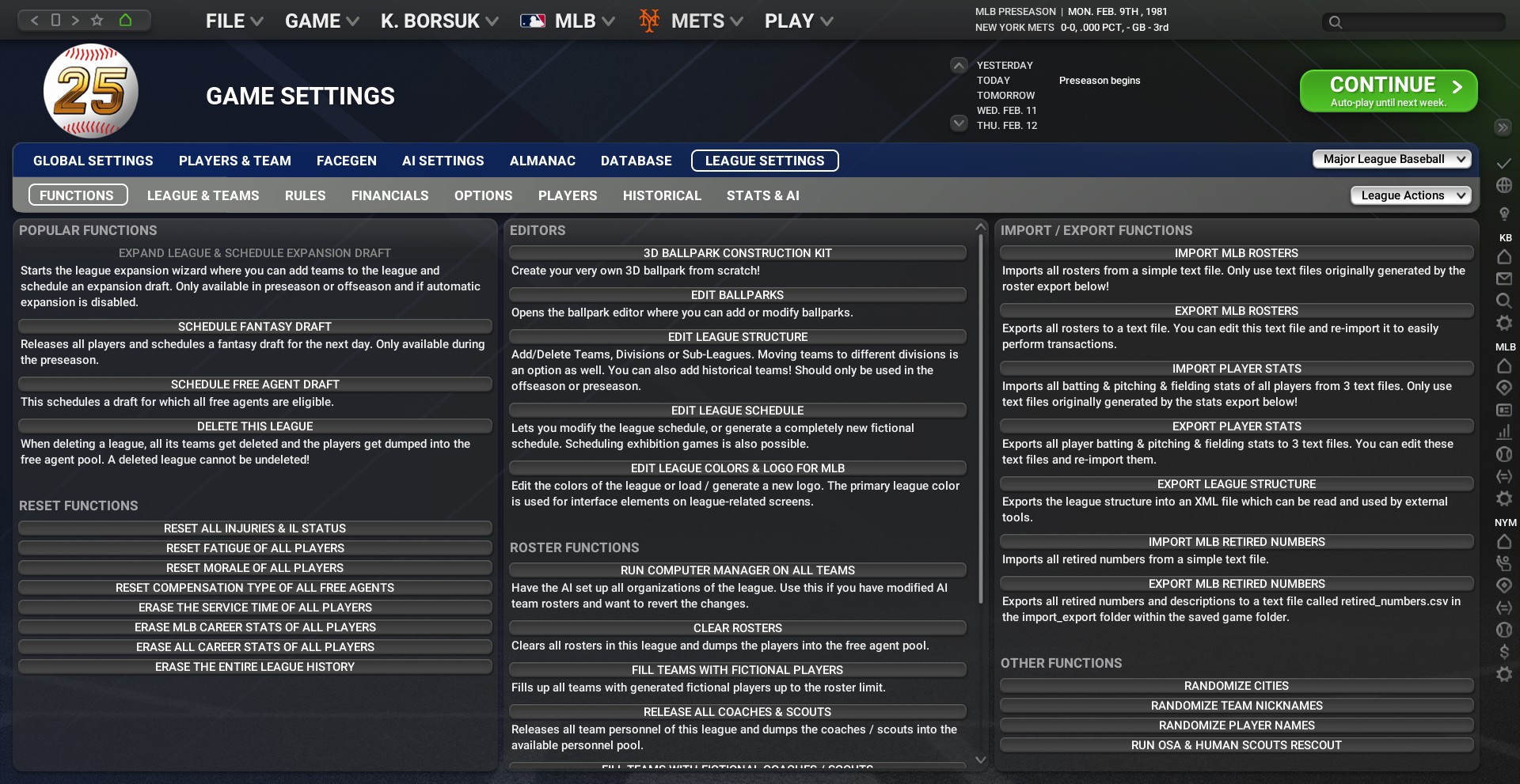 I am looking to play the 1981 season with the strike happening and the playoff structure for that season in place. I had asked previously how to do that and I got this excellent advice: "League Settings, Options, top right Edit League Schedule, Actions, Import from file and then select the schedule Brad listed. You have to do this is preseason." But I am in preseason now and I cannot seem to find "edit league schedule" I have attached the screenshot of my screen. where can I find it? I suspect the 25 OOTP is not much different than 26 OOTP any help is appreciated ![]() thanks! |