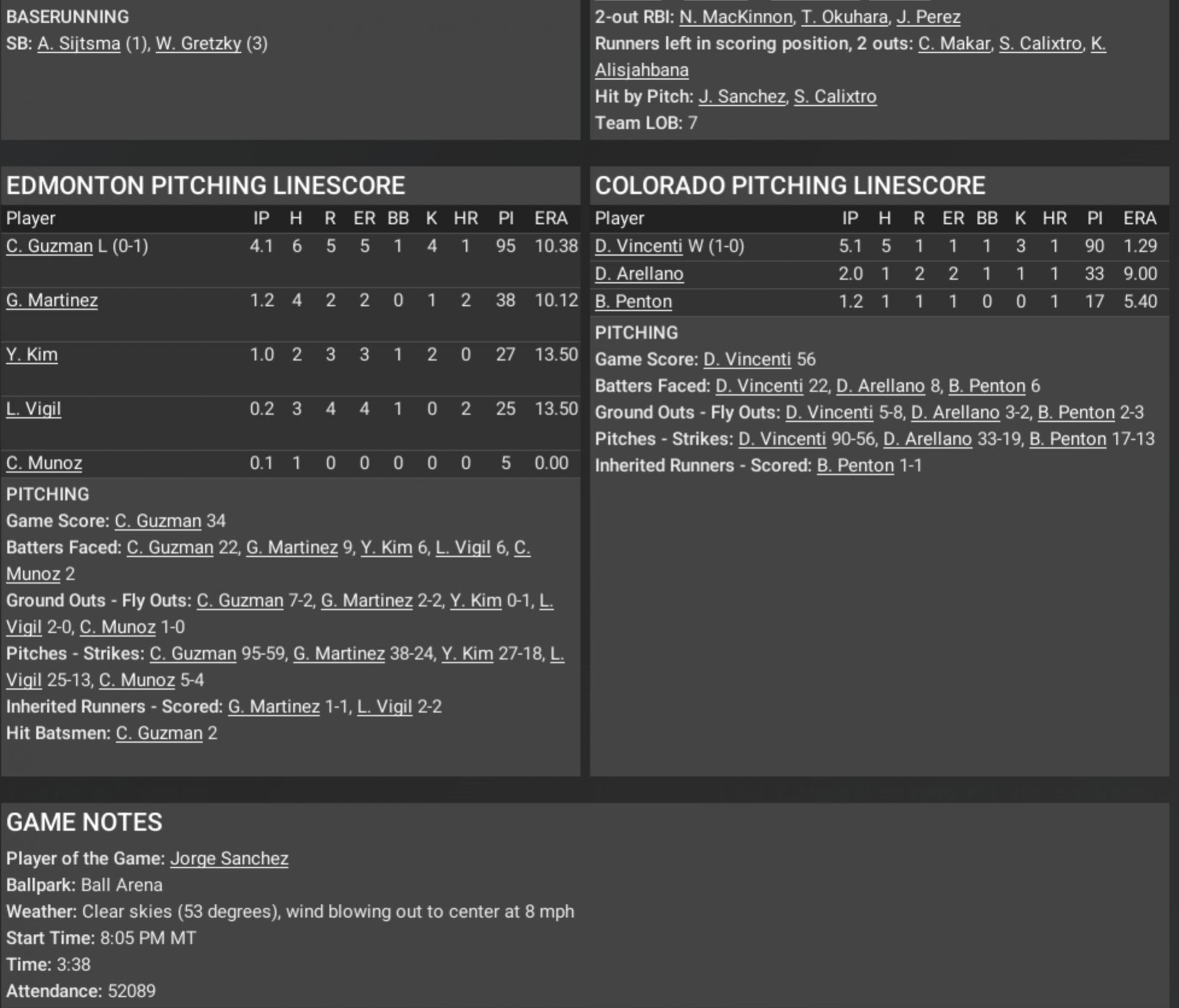 Jorge Sanchez was simply spectacular. Three hits in four at-bats, two home runs, a double, scored three, drove in three. That’s the kind of offensive performance that turns a game from competitive to one-sided almost immediately. And let’s not overlook Cale Makar, who came up in the eighth with the bases loaded and absolutely unloaded—a grand slam that made it 12-4, a three-hit night with a homer, a triple, and a double. Simply extraordinary. Colorado set the tone early, and they never let up. Every corner of the diamond produced runs, with MacKinnon, Calixtro, Okuhara, Perez, all contributing to a remarkable 14-run output. When your lineup can score like that, you’re hard to beat, and the Oilers were on the receiving end of a clinic. On the pitching side, Denver’s D. Vincenti gave up just one earned run over five and a third innings, managing to keep the Oilers’ power in check before the bullpen finished the job. Guzman for Edmonton had a tough night—five runs over four and a third, the kind of night that tests a pitcher’s resilience. The Avalanche now hold a commanding 3-1 lead in this best-of-seven series. They’ll travel to Rogers Place in Edmonton for Game 5, where a victory would punch their ticket to the Conference Finals. If Colorado continues to swing the bats with this kind of precision, there’s no reason to believe they won’t get the job done. It was a night where the offense dazzled, the home crowd roared, and the Avalanche reminded everyone why they’re a formidable postseason team. Truly, a game for the record books. |