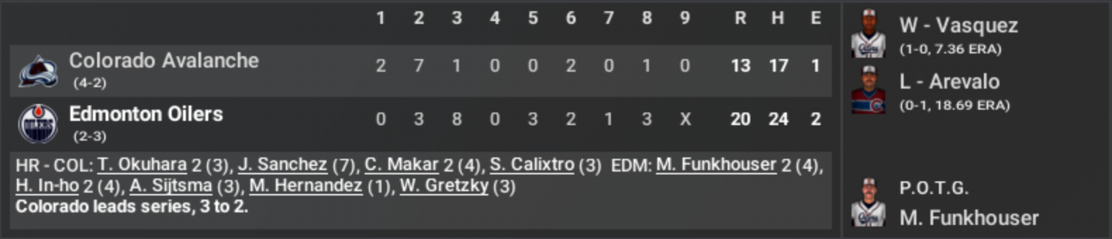 Mad Dog: “I’m tellin’ ya, Mike… this is the kinda performance that makes you wonder why we even have pitching rules! 20 runs for Edmonton! TWENTY! And Colorado scores 13! This is like an episode of ‘Hardcore Hockey meets Home Run Derby.’” Mike: “I mean, you’ve got Sanchez goin’ two for two with a homer… Makar with a pair of homers… and it still isn’t enough! The Oilers just keep comin’! Funkhouser clears the bases in the second with a triple… bases loaded… two outs… you get the picture!” Mad Dog: “Colorado’s pitching staff looks like a sieve! Amador, Arevalo… every time they throw the ball, it’s a line drive, a homer, a triple… you name it, Edmonton’s takin’ it!” Mike: “And let’s talk about the crowd at Rogers Place. 38,882 fans… probably thinkin’, ‘Do we need a scoreboard for this, or just trust Funkhouser?’” Mad Dog: “Funkhouser ties the Edmonton playoff record for hits and RBI. Sijtsma sets the record for runs. And here’s the kicker—this is Game 5! The series isn’t over. The Avalanche still lead 3-2… but man, if you’re Colorado, you’re sittin’ there, scratching your head, thinkin’, ‘Who just hit us like that?’” Mike: “Game 6 in Denver on Sunday. I’m tellin’ ya, if Funkhouser shows up like this again, the Avalanche are gonna need a miracle. Marty’s playin’ like it’s his last postseason… and maybe it is, and he’s makin’ it count!” Mad Dog: “Twenty to thirteen! That’s not a game, that’s a shootout! Only difference? No pads, Mike. No pads, just bats and balls flying everywhere!” Mike: “Folks, get your popcorn, get your scoreboard ready… and watch Marty Funkhouser do what only Marty Funkhouser can do. I’m tellin’ ya, this is the kind of game you tell your grandkids about!” Mad Dog: “And we’re not even talkin’ about the wind—12 mph left to right… who cares! Funkhouser’s hittin’ rockets! I love it!” Mike: “Sunday, Denver. Avalanche need a win. Oilers? They just showed they ain’t goin’ quietly.” Mad Dog: “Mike, if Funkhouser plays like this, I’m buying a jersey. Maybe two.” Mike: “Make it three, Mad Dog. Make it three.” Final Score: Edmonton Oilers 20, Colorado Avalanche 13. Player of the Game: Marty Funkhouser. Legendary. |