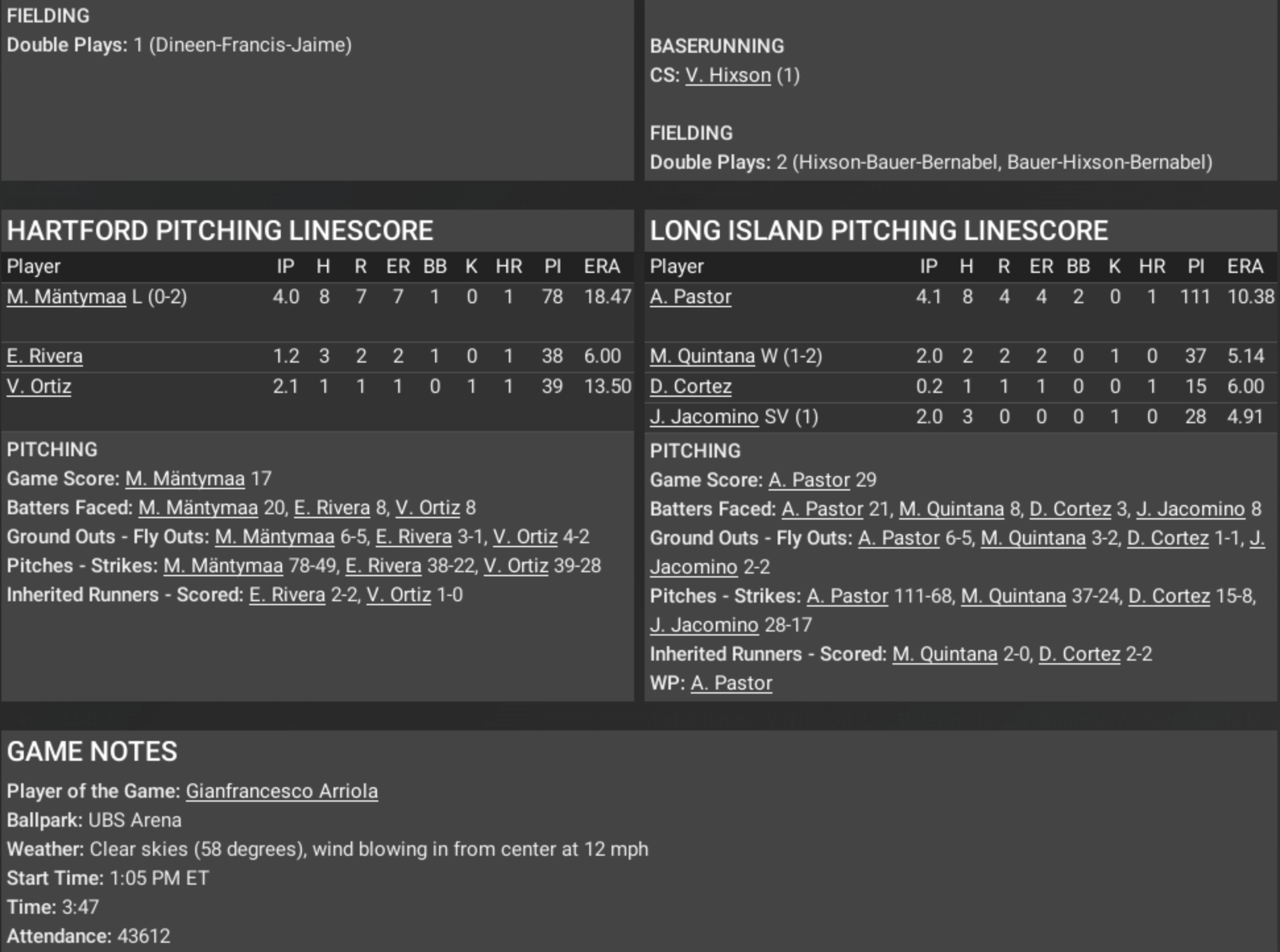 Mad Dog: “I’m tellin’ ya, Mike… this was back-and-forth all day. Hartford jumps out early, Whalers get a couple runs in the first, they’re lookin’ good… but then Long Island just explodes in the fifth! Seven runs in one inning! SEVEN!” Mike: “Gianfrancesco Arriola, 3 for 4, a home run, two singles, a walk, three RBI… the guy’s a one-man wrecking crew! And Jon Valenzuela, with runners on first and second, no outs… doubles to center, knocks in the go-ahead run! That’s clutch, folks!” Mad Dog: “And don’t forget, Mike, Hartford’s battin’ too—Zuke with a homer, Arriola with another… seven runs! I mean, it’s like a fireworks show out there. Bases loaded, runners all over the place… what a game!” Mike: “But the Islanders get it done, the crowd is wild, and now the series is tied 3-3. Monday, it’s all on the line in Hartford Civic Center. You’ve got the defending champs fightin’ to stay alive, and the Whalers looking to punch their ticket. I tell ya, this is playoff baseball at its finest!” Mad Dog: “And the pitching… forget about it. Mäntymaa gives up eight hits, seven runs… Pastor gives up eight hits, four runs… this game was just a slugfest from start to finish!” Mike: “Player of the Game? Gianfrancesco Arriola. No doubt. The guy carries Long Island, and the series now comes down to one game. I’m tellin’ ya, Monday is gonna be crazy!” Mad Dog: “43,612 fans, clear skies, 12 mph wind… doesn’t matter! This game was all about the bats! Back-and-forth, back-and-forth… Long Island comes out on top, 10-7. Unreal!” Mike: “Series tied, 3-3. Game 7 in Hartford. If you’re a baseball fan, you do not wanna miss this one!” Mad Dog: “I don’t care if you’re a Whalers fan or an Islanders fan… this is what you live for!” Final Score: Long Island Islanders 10, Hartford Whalers 7. Player of the Game: Gianfrancesco Arriola. Absolute beast. |