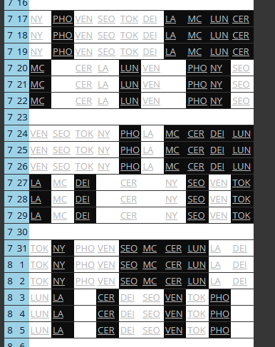 One sub league of 10 2 divisions 3 game series, 2 per week Tue, Wed, Thu, then Fri, Sat, Sun 81 games, each team playing the other 3 times in 3 series. 9 teams x 9 games = 81 games. April 15th, opening day on a Tuesday Two week All-star break so I can run a 10 team round robin tournament in addition to Homerun derby and all star game |